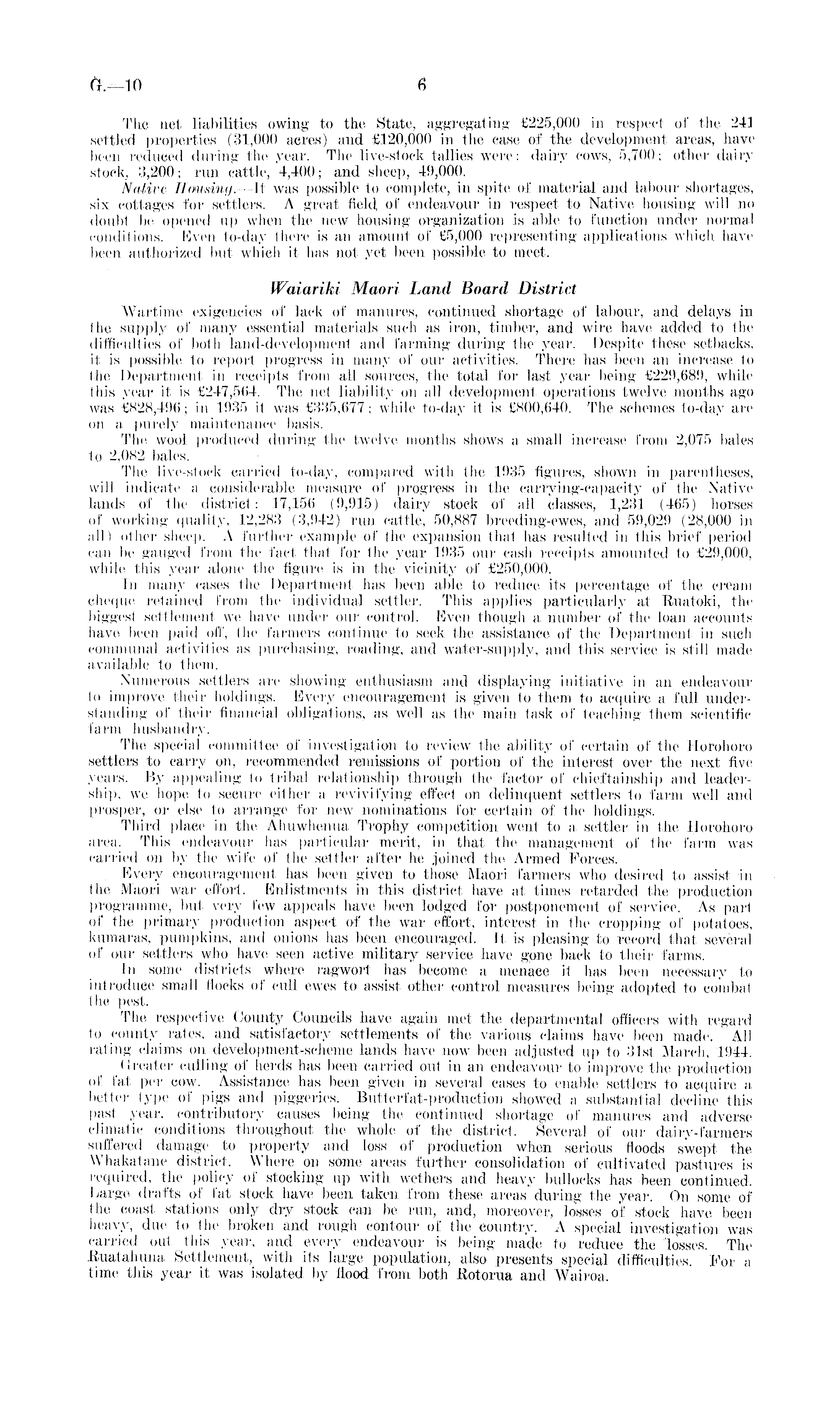 The net liabilities owing to the State, aggregating £225,000 in respect of the 241 settled properties (31,000 acres) and £120,000 in the case of the development, areas, have been reduced during the year. The live-stock tallies were: dairy cows, 5,700; other dairy stock, 3,200; run cattle, 4,400; and sheep, 49,000. Native Homing.—lt was possible to complete, in spite of material and labour shortages, six cottages for settlers. A great field of endeavour in respect to Native housing will, no doubt lie opened up when the new housing organization is able to function under normal conditions. Even to-day there is an amount of £5,000 representing applications which have been authorized but which it has not yet been possible to meet. Waiariki Maori Land Board District Wartime exigencies of lack of manures, continued shortage of labour, and delays in fhe supply of many essential materials such as iron, timber, and wire have added to the difficulties of both land-development, and farming during the year. Despite these setbacks, it is possible to report progress in many of our activities. There has been an increase to the Department in receipts from all sources, the total for last year being £229,689, while this year it is £247,564. The net liability on all development operations twelve months ago was £828,496; in 1935 it was £335,677; while to-day it is £800,640. The schemes to-day are on a purely maintenance basis. The wool produced during the twelve months shows a. small increase from 2,075 bales to 2,082 bales. The live-stock carried to-day, compared with the 1935 figures, shown in parentheses, will indicate a. considerable measure of progress in the carrying-capacity of the Native lands of the district: 17,156 (9,915) dairy stock of all classes, 1,231 (465) horses of working quality, 12,283 (3,942) run cattle, 50,887 breeding-ewes, and 59,029 (28,000 in all) other sheep. A further example of the expansion that has resulted in this brief period can be gauged from the fact that for the year 1935 our cash receipts amounted to £29,000, while this year alone the figure is in the vicinity of £250,000. In many eases the Department has been able to reduce its percentage of the cream cheque retained from the individual settler. This applies particularly at Ruatoki, the biggest settlement we have under our control. Even though a number of the loan accounts have been paid off, the farmers continue to seek the assistance of the Department in such communal, activities as purchasing, roading, and water-supply, and this service is still made available to them. Numerous settlers are showing enthusiasm and displaying initiative in an endeavour to improve their holdings. Every encouragement is given to them to acquire a full understanding of their financial obligations, as well as the main task of teaching them scientific farm husbandry. The special committee of investigation to review the ability of certain of the Horohoro settlers to carry on, recommended remissions of portion of the interest over the next five years. By appealing to tribal relationship through the factor of chieftainship and leadership, we hope to secure either a revivifying effect on delinquent settlers to farm well and prosper, or else to arrange for new nominations for certain of the holdings. Third place in the Ahuwhenua Trophy competition went to a settler in the Horohoro area. This endeavour has particular merit, in that the management of the farm was carried on by the wife of the settler after he joined the Armed Forces. Every encouragement has been given to those Maori farmers who desired to assist in the Maori war effort. Enlistments in this district have at times retarded the production programme, but very few appeals have been lodged for postponement of service. As part of the primary production aspect of the war effort, interest in the cropping of potatoes, kumaras, pumpkins, and onions has been encouraged. It is pleasing to record that several of our settlers who have seen active military service have gone back to their farms. In some districts where ragwort has become a menace it has been necessary to introduce small flocks of cull ewes to assist other control measures being adopted to combat the pest. The respective County Councils have again met the departmental officers with regard to county rates, and satisfactory settlements of the various claims have been made. All rating claims on development-scheme lands have now been adjusted up to 31st March, 1944. Greater culling of herds has been carried out in an endeavour to improve the production of fat per cow. Assistance has been given in several cases to enable settlers to acquire a better type of pigs and piggeries. Butterfat-production showed a. substantial decline this past year, contributory causes being the continued shortage of manures and adverse climatic conditions throughout the whole of the district. Several of our dairy-farmers suffered damage to property and loss of production when serious floods swept the Whakatane district. Where on some areas further consolidation of cultivated pastures is required, the policy of stocking up with wethers and heavy bullocks has been continued. Large drafts of fat stock have been taken from these areas during the year. On some of the coast stations only dry stock can be run, and, moreover, losses of stock have been heavy, due to the broken and rough contour of the country. A special investigation was carried out this year, and every endeavour is being made to reduce the losses. The Ruatahuna Settlement, with its large population, also presents special difficulties. For a times this year it was isolated by flood from both Rotorua and Wairoa,