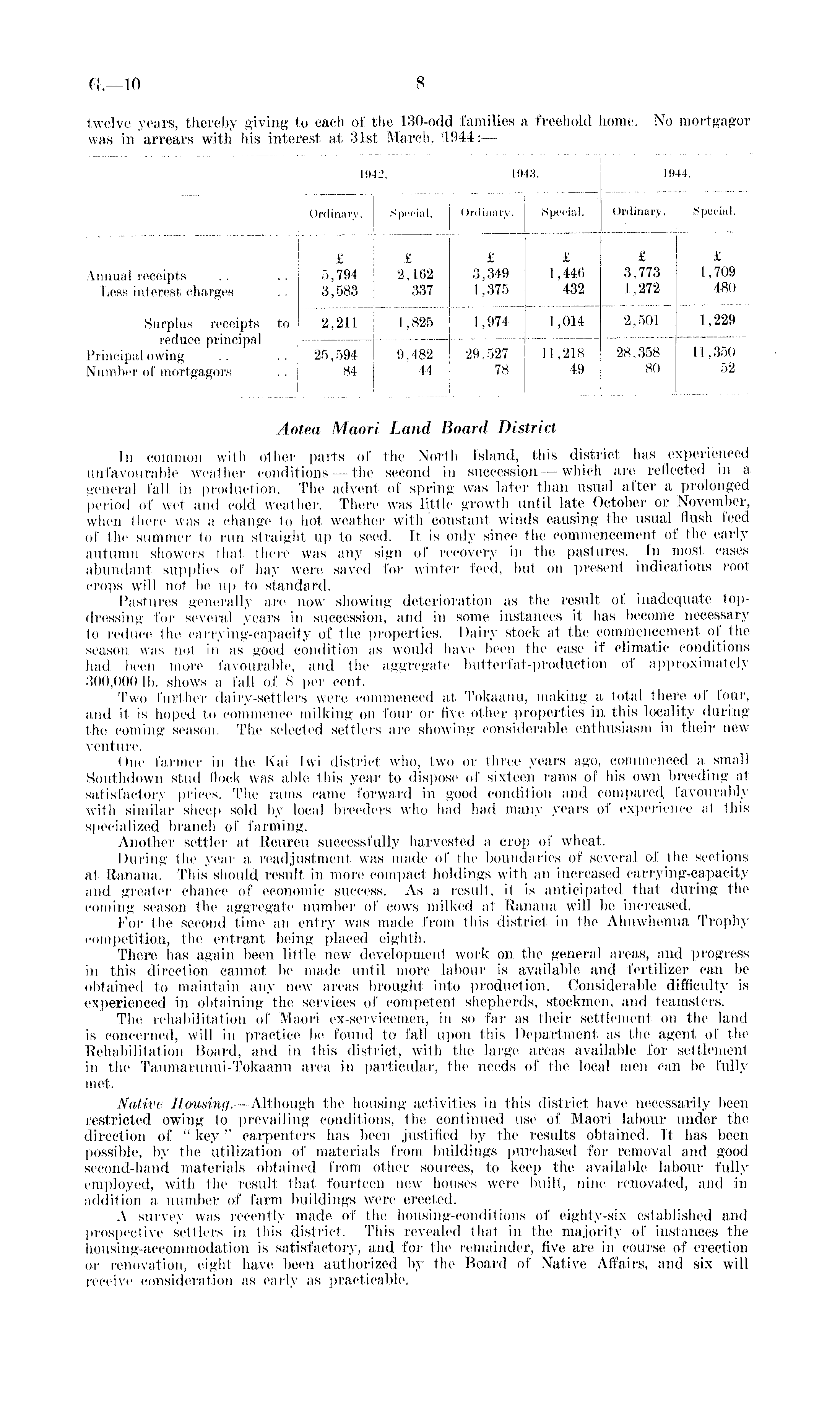 1942. 1943. 1944. Ordinary. Special. Ordinary. Special. Ordinary. Special. £ £ £ £ £ £ Annual receipts .. .. 5,794 2,162 3,349 1,446 3,773 1,709 Less interest charges .. 3,583 337 1,375 432 1,272 480 Surplus receipts to 2,211 1,825 1,974 1,014 2,501 1,229 reduce principal Principal owing .. .. 25,594 9,482 29,527 11,218 28,358 11,350 Number of mortgagors .. 84 44 78 49 80 52