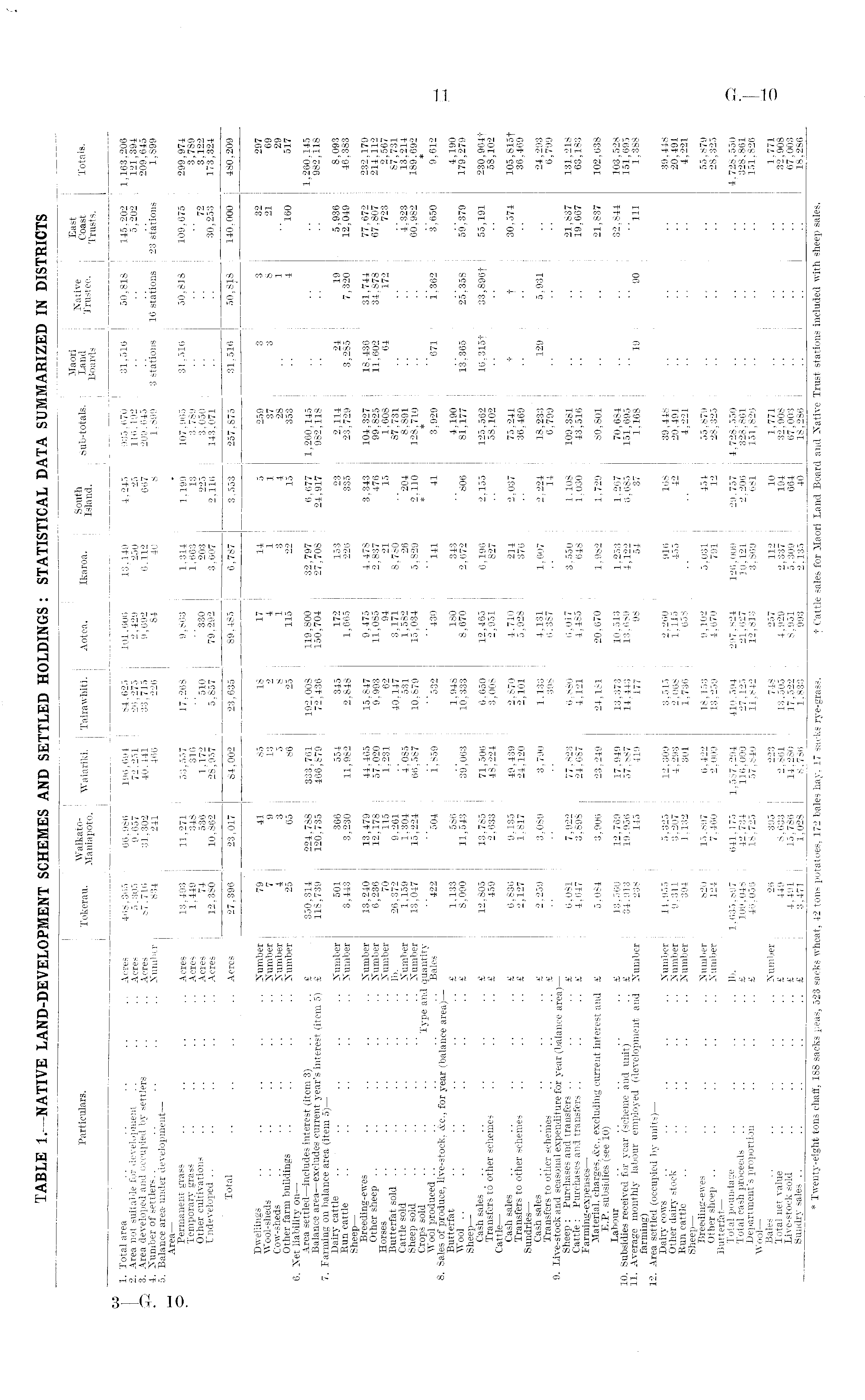 . G ,, Maori j . A East Particulars. Tokerau. ™» iariki - Tairawhiti. Aotea. Ikaroa, South Sub . tot als. j Ljmd j Trngtee Coast Totals. X. Total area .. .. .. .. .. Acres 468,365 66,986 196,694 84,625 101,606 13,149 4,245 935,670 31,516 50,818 145,202 1,163,206 2. Area not suitable for development .. .. .. Acres 5,305 9,657 72,251 26,275 2,429 250 25 116.192 .. .. 5,202 121,394 3. Area developed and occupied by settlers .. .. Acres 87.716 31,302 40.441 33,715 9,692 6,112 667 209,645 .. .. .. 209,645 4. Number of settlers.. .. .. .. .. number 834 241 466 226 84 40 8 1.899 3 stations 16 stations 23 stations 1,899 5. Balance area, under development — Area — - Permanent grass .. .. .. .. Acres 13,493 11,271 53,557 17,268 9,863 1,314 1,199 107,965 31,516 50,818 109,675 299,974 Temporary grass .. .. .. .. Acres 1,449 348 316 .. .. 1,663 13 3,789 .. .. .. 3,789 Other cultivations .. .. .. .. Acres 74 536 1,172 510 330 203 225 3,050 .. •• 72 3,122 Undeveloped.. .. .. .. .. Acres 12,380 10,862 28,957 5,857 79,292 3,607 2,116 143,071 .. 30,253 173,324 Total .. .. .. .. Acres 27,396 23,017 84,002 23,635 89,485 6,787 3,553 257,875 31,516 50,818 140,000 480,209 Dwellings .. .. .. .. .. Number 79 41 85 18 17 14 5 259 3 3 32 297 Wool-sheds .. .. .. .. .. Number 7 9 13 2 4 1 1 37 3 8 21 69 Cow-sheds .. .. .. .. ,. Number 4 3 5 8 1 3 4 28 1 .. 29 Other farm buildings .. .. .. .. Number 25 65 86 25 115 22, 15 353 4 160 517 6. Net liability on — Area settled— includes interest (item 3) .. .. £ . 350,314 224,788 333,761 192,008 119,800 32,797 6,677 1,260,145 i .. .. 1,260,145 Balance area—excludes current year's interest (item 5) £ 118,739 120,735 466,879 72,436 150,704 27,708 24,917 982,118 .. .. •• 982,118 7. Farming on balance area (item 5)— Dairy cattle .. .. .. .. .. Number 501 366 554 345 172 153 23 2,114 24 19 5,936 8,093 Run cattle .. .. .. .. .. Number 3,443 3,230 11,982 2,848 1,665 226 335 23,729 3,285 7,320 12,049 46,383 Sheep — Breeding-ewes .. .. .. .. Number 13,240 13,479 44,465 15,847 9,475 4,478 3,343 104,327 18,436 31,744 77,672 232,179 Other sheep .. .. .. .. .. Number 6,236 12,178 57.020 9,993 11,085 2,837 476 99,825 11,602 34.878 67,807 214,112 Horses .. .. .. .. .. Number 70 115 1.231 62 94 21 15 1,608 64 172 723 2,567 Butterfat sold .. .. .. .. ..lb. 26,372 9,261 40,147 3,171 8,780 .. 87,731 .. .. 87,731 Cattle sold .. .. .. .. .. Number 1,159 1,304 4.085 531 1,582 26 204 8.891 .. .. 4,323 13,214 Sheep sold .. .. .. .. .. Number 13,047 15,224 66,587 10,879 15,034 5,829 2,110 128,710 .. .. 60,982 189,692 Crops sold .. .. .. Type and quantity .. .. .. .. .. .. * * .. .. .. * Wool produced .. .. .. .. .. Bales 422 504 1.859 532 430 141 41 3,929 671 1,362 3,650 9,612 8. Sales of produce, live-stock, &c., for year (balance area) — Butterfat .. .. .. .. .. £ 1,133 586 .. 1,948 180 343 .. 4,190 .. .. .. 4,190 Wool .. .. .. .. .. .. £ 8,090 11,543 39,063 10,333 8,670 2,672 806 81,177 13,365 25,358 59,379 179,279 Sheep — Cash sales. .. .. .. .. .. £ 12,805 13,785 71,506 6,650 12,465 6,196 2,155 125,562 16,315t 33,896t 55,191 230,964t Transfers to other schemes .. .. .. £ 459 2,633 48.224 3,008 2,951 827 .. 58,102 .. .. .. 58,102 Cattle — Cash sales .. .. .. .. .. £ 6,836 9,135 49,439 2,870 4,710 214 2,037 75,241 t t 30,574 105,815f Transfers to Other schemes .. .. .. £ 2,127 1,817 24,120 2,101 5,928 376 . . 36,469 .. .. .. 36,469 Sundries — Cash sales .. .. .. .. .. £ 2,259 3,089 3,790 1,133 4,131 1,607 2,224 18,233 129 5,931 .. 24,293 Transfers to other schemes .. .. .. £ .. .. 398 6,387 .. 14 6,799 .. .. .. 6,799 9. Live-stock and seasonal expenditure for year (balance area) — Sheep: Purchases and transfers .. .. .. £ 6,081 7,922 77.823 6.880 6,017 3,550 1.108 109,381 .. .. 21,837 131,218 Cattle: Purchases and transfers .. .. .. £ 4,647 3,898 241687 41121 4,485 648 43,516 .. .. 19,667 63,183 Farming-expenses — Material, charges, &c., excluding current interest and £ 5,084 3,906 23,249 24,181 20,670 1,982 1,729 80,801 .. .. 21,837 102,638 E.P. subsidies (see 10) ' ! _ „ , Labour .. .. .. .. .. £ 13,560 12,769 17,949 13,373 10,513 1,253 1,267 70,684 1 .. .. 32,844 103,528 10. Subsidies received for year (scheme and unit) .. £ 34,913 19.956 57,887 11,443 13,689 4,122 6,685 151,695 .. .. .. 151,695 11. Average monthly labour employed (development and Number 238 145 419 177 98 54 '37 1,168 19 90 111 1,388 farming) 12. Area settled (occupied by units) — Dairy cows .. .. .. .. .. Number 14,955 5,325 12,309 3,515 2,260 916 168 39,448 .. .. .. 39.448 Other dairy stock .. .. .. .. Number 9,311 3,207 4,293 2,068 1,115 455 42 20,491 .. .. .. 20,491 Run cattle .. .. .. .. .. Number 394 1,132 301 1,736 658 .. .. 4,221 .. .. .. 4,221 Sheep — Breeding-ewes .. .. .. .. Number 820 15,897 6,422 18,153 9,102 5,031 454 55,879 .. .. 55,879 Other sheep .. .. .. .. .. Number 124 7,460 2,009 13,259 4,670 791 12 28,325 .. .. .. 28,325 Butterfat — Total poundage .. .. .. ..lb. 1,635,897 641,175 1,587,294 410,594 297,824 126,009 29,757 4,728,550 .. .. .. 4,728,550 Total cash proceeds .. .. .. .. £ 109,048 42.734 llOiOOO 27,125 21,627 10,121 2,206 328,861 .. .. .. 328,861 Department's proportion .. .. .. £ 46.056 18,725 57,840 11,842 12.813 3,869 681 151,826 .. .. .. 151,826 Wool — Bales .. .. .. .. .. Number 26 395 223 748 257 112 10 1,771 .. .. .. 1.771 Total net value .. .. .. .. £ 449 8,633 2.861 13,505 4,929 2,337 194 32,908 .. .. .. 32,908 Live-stock sold .. .. .. .. £ 4,491 15,786 17,522 8,951 5.309 664 67,003 .. .. .. 67,003 Sundry sales .. .. „ .. .. £ 3,471 1,028 8,786 1,833 993 40 18,286 „ LJ 18,286 * Twenty-eight tons chaff, 188 sacks peas, 523 sacks wheat, 42 tons potatoes, 172 bales hay, 17 sacks rye-grass. f Cattle sales for Maori Land Board and Native Trust stations included with sheep sales.