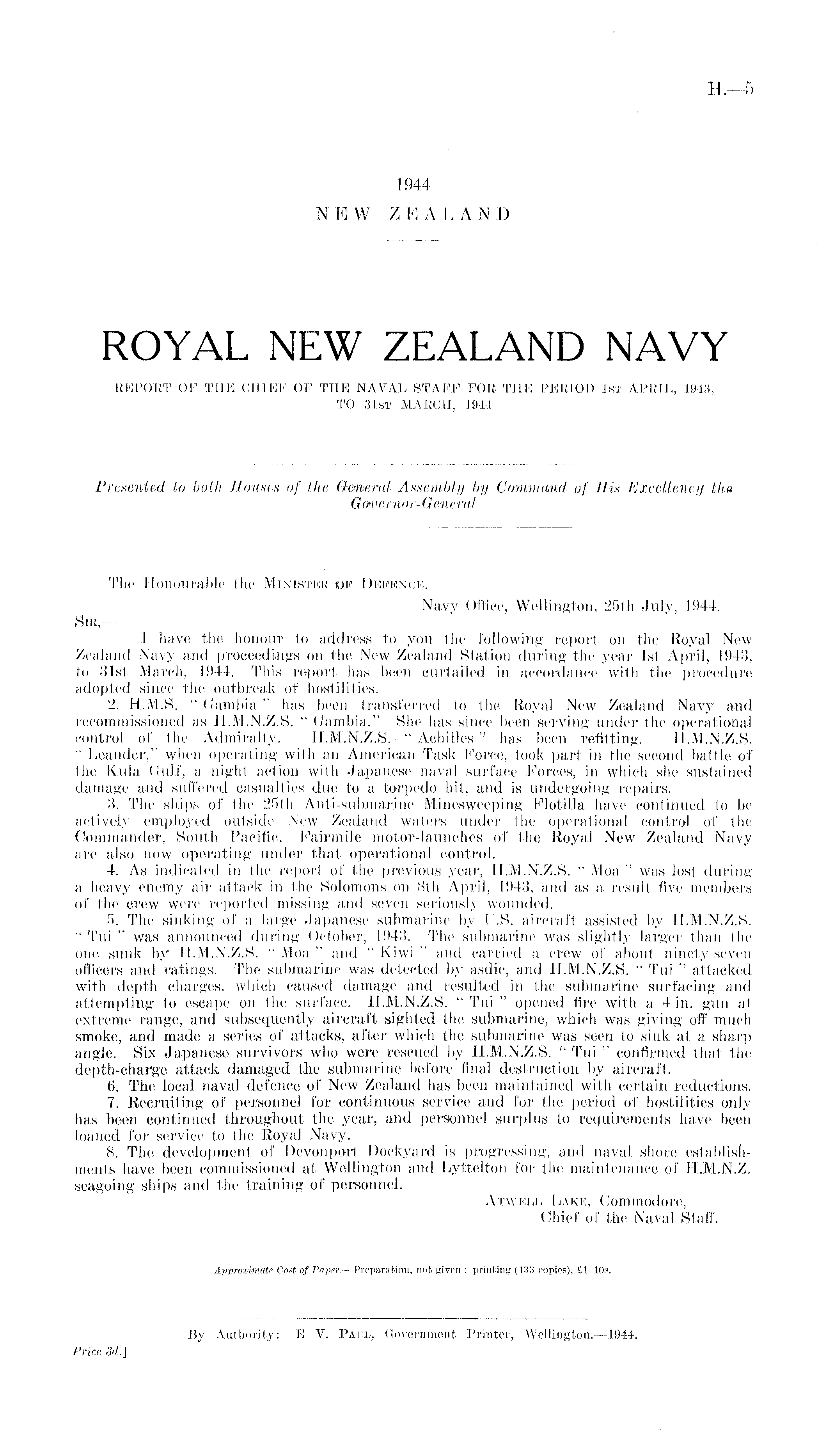 The Honourable the Minister of Defence. Navy Office, Wellington, 25th July, 1944. Sib, — I have the honour to address to you the following report on the Royal New Zealand Navy and proceedings on the New Zealand Station during the year Ist April, 1943, to 31st March, 1944. This report has been curtailed in accordance with the procedure adopted since the outbreak of hostilities. 2. H.M.S. " Gambia" has been transferred to the Royal New Zealand Navy and recommissioned as PI.M.N.Z.S. " Gambia." She has since been serving under the operational control of the Admiralty. H.M.N.Z.S. •" Achilles " has been refitting. H.M.N.Z.S. " Leander," when operating witli an American Task Force, took part in the second battle of the Kula Gulf, a night action with Japanese naval surface Forces, in which, she sustained damage and suffered casualties due to a torpedo hit, and is undergoing repairs. 3. The ships of the 25th Anti-submarine Minesweeping Flotilla have continued to be actively employed outside New Zealand waters under the operational control of the Commander, South Pacific. Fairmile motor-launches of the Royal New Zealand Navy are also now operating under that operational control. 4. As indicated in the report of the previous year, H.M.N.Z.S. " Moa " was lost during a heavy enemy air attack in the Solomons on Bth April, 1943, and as a result five members of the crew were reported missing and seven seriously wounded. 5. The sinking of a large Japanese submarine by U.S. aircraft assisted by H.M.N.Z.S. " Tui " was announced during October, 1943. The submarine was slightly larger than the one sunk by H.M.N.Z.S. " Moa " and " Kiwi " and carried a crew of about ninety-seven officers and ratings. The submarine was detected by asdic, and H.M.N.Z.S. " Tui " attacked with depth charges, which caused damage and resulted in the submarine surfacing and attempting to escape on the surface. H.M.N.Z.S. " Tui " opened fire with a 4 in. gun at extreme range, and subsequently aircraft sighted the submarine, which was giving off much smoke, and made a series of attacks, after which the submarine was seen to sink at a sharp angle. Six Japanese survivors who were rescued by H.M.N.Z.S. " Tui " confirmed that the depth-charge attack damaged the submarine before final destruction by aircraft. 6. The local naval defence of New Zealand has been maintained with certain reductions. 7. Recruiting of personnel for continuous service and for the period of hostilities only has been continued throughout the year, and personnel surplus to requirements have been loaned for service to the Royal Navy. 8. The development of Devonport Dockyard is progressing, and naval shore establishments have been commissioned at Wellington and Lyttelton for the maintenance of H.M.N.Z. seagoing ships and the training of personnel. Atwell Lake, Commodore, Chief of the Naval Staff.