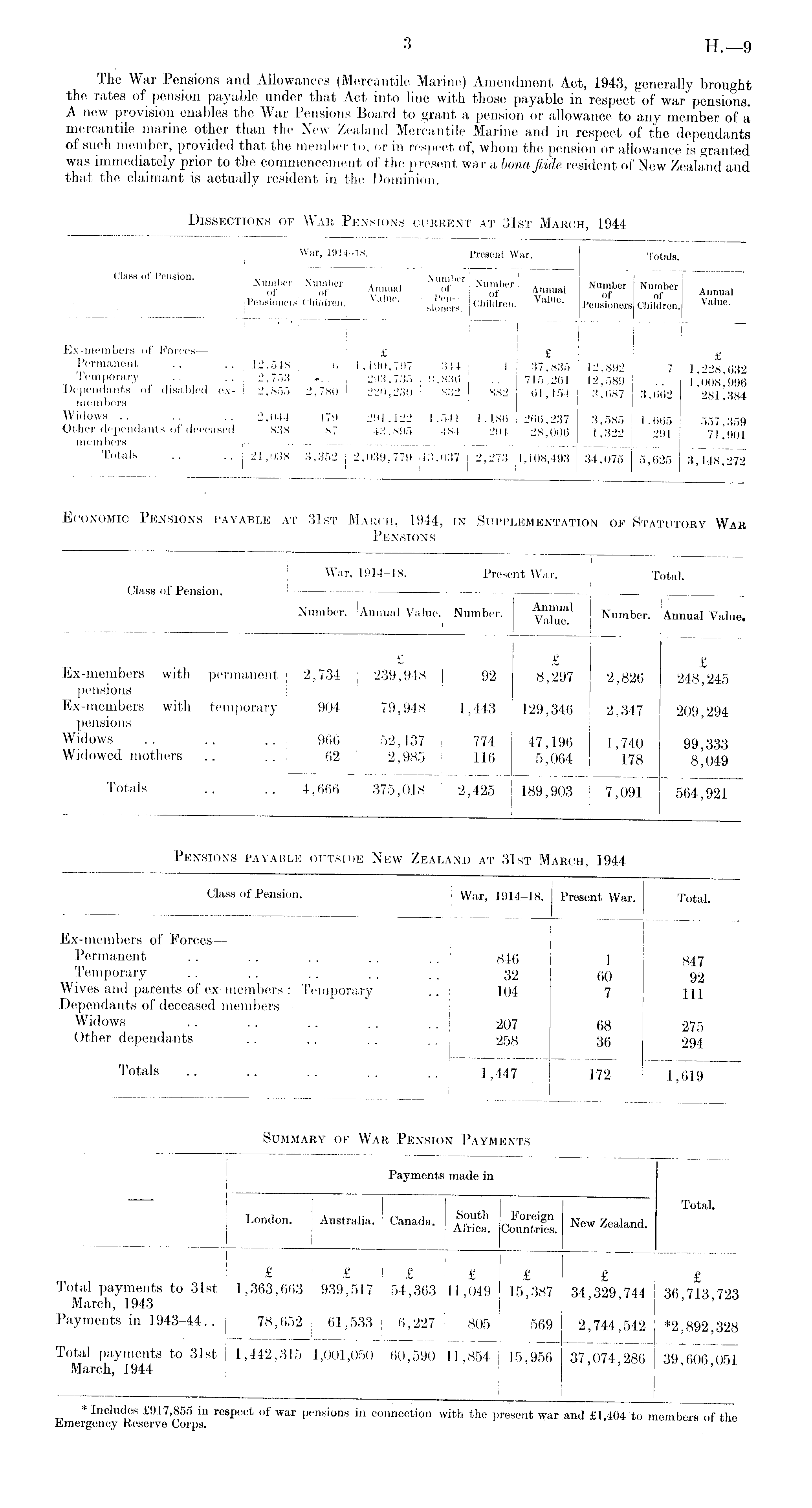 The War Pensions and Allowances (Mercantile Marine) Amendment Act, 1943, generally brought the rates of pension payable under that Act into line with those payable in respect of war pensions. A new provision enables the War Pensions Board to grant a pension or allowance to any member of a mercantile marine other than the New Zealand Mercantile Marine and in respect of the dependants of such member, provided that the member to, or in respect of, whom the pension or allowance is granted was immediately prior to the commencement of the present war a bonafiide resident of New Zealand and that the claimant is actually resident in the Dominion.