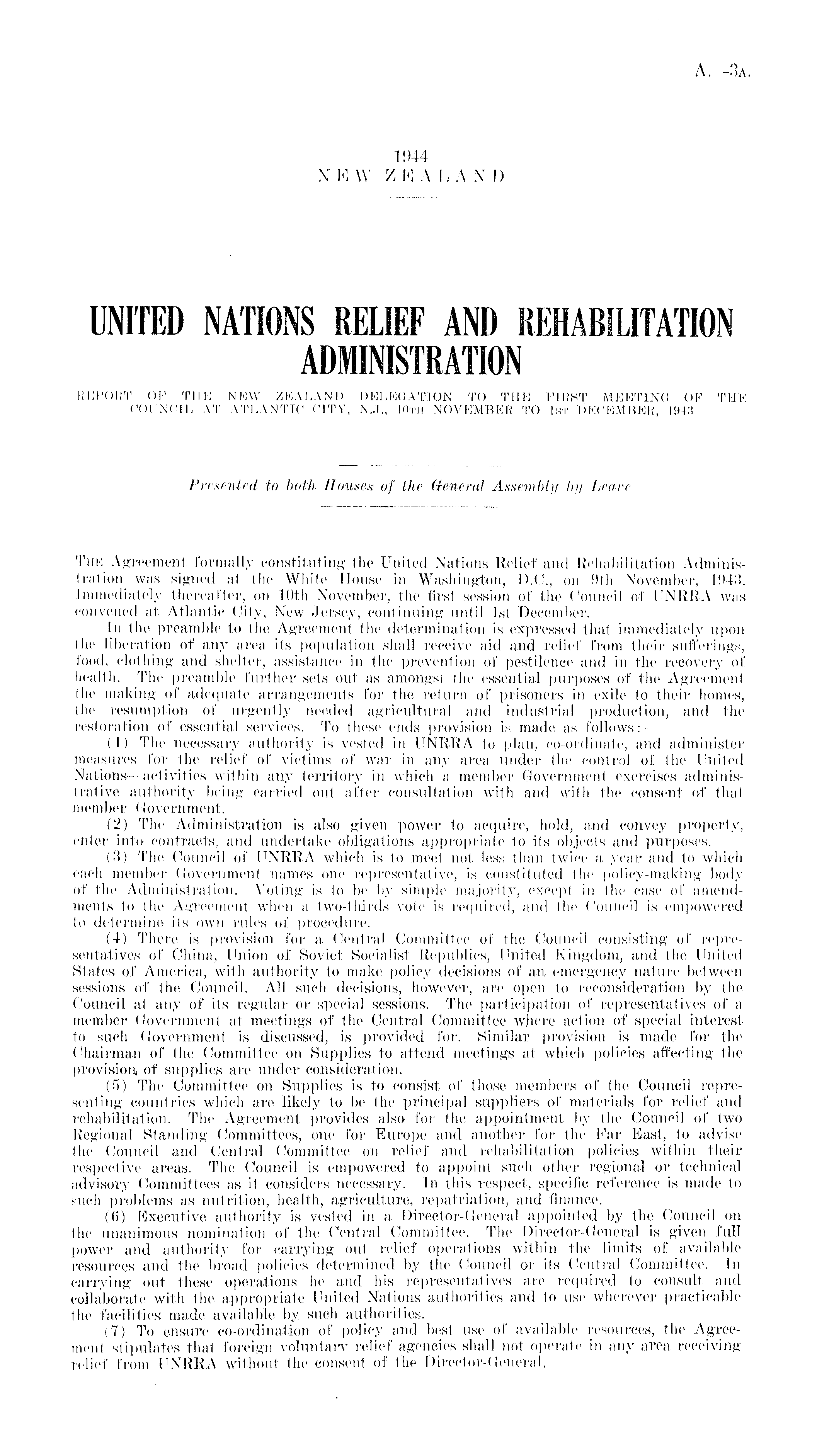 UNITED NATIONS RELIEF AND REHABILITATION ADMINISTRATION REPORT OF THE NEW ZEALAND DELEGATION TO THE FIRST MEETING OF THE COUNCIL AT ATLANTIC CITY, N.J., 10th NOVEMBER TO 1st DECEMBER, 1943