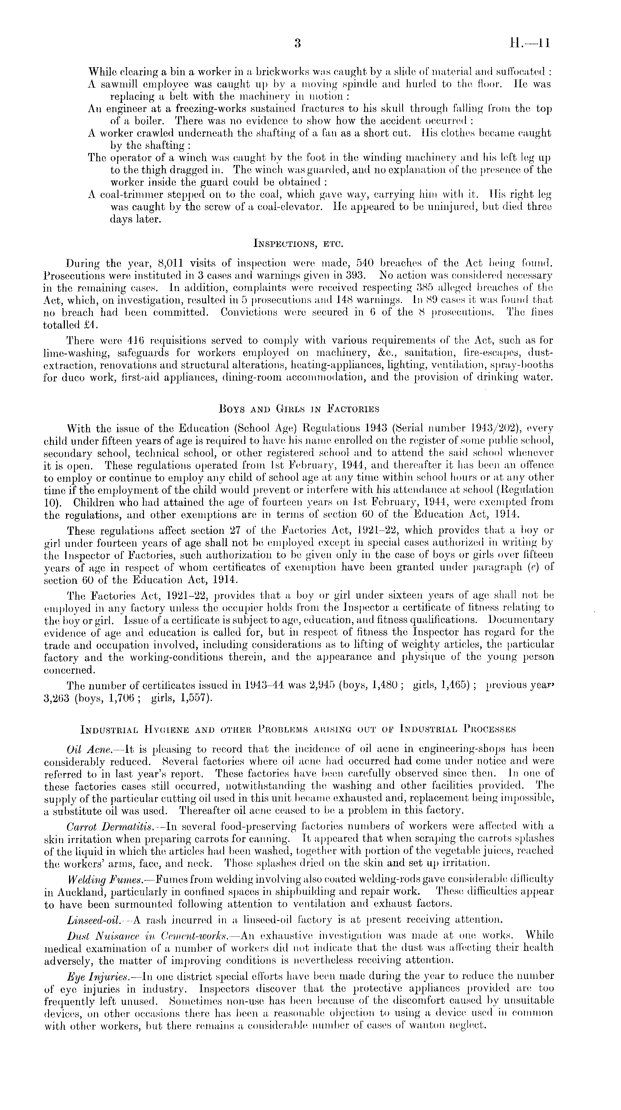 While clearing a bin a worker in a brickworks was caught by a slide of material and suffocated : A sawmill employee was caught up by a moving spindle and hurled to the floor. He was replacing a belt with the machinery in motion: An engineer at a freezing-works sustained fractures to his skull through falling from the top of a boiler. There was no evidence to show how the accident occurred : A worker crawled underneath the shafting of a fan as a short cut. His clothes became caught by the shafting : The operator of a winch was caught by the foot in the winding machinery and his left leg up to the thigh dragged in. The winch was guarded, and no explanation of the presence of the worker inside the guard could be obtained : A coal-trimmer stepped on to the coal, which gave way, carrying him with it. His right leg was caught by the screw of a coal-elevator. He appeared to be uninjured, but died three days later. Inspections, etc. During the year, 8,011 visits of inspection were made, 540 breaches of the Act being found. Prosecutions were instituted in 3 cases and warnings given in 393. No action was considered necessary in the remaining cases. In addition, complaints were received respecting 385 alleged breaches of the Act, which, on investigation, resulted in 5 prosecutions and 148 warnings. In 89 cases it was found that no breach had been committed. Convictions were secured in 6 of the 8 prosecutions. The fines totalled £4. There were 416 requisitions served to comply with various requirements of the Act, such as for lime-washing, safeguards for workers employed on machinery, &c., sanitation, fire-escapes, dustextraction, renovations and structural alterations, heating-appliances, lighting, ventilation, spray-booths for duco work, first-aid appliances, dining-room accommodation, and the provision of drinking water. Boys and Girls in Factories With the issue of the Education (School Age) Regulations 1943 (Serial number 1943/202), every child under fifteen years of age is required to have his name enrolled on the register of some public school, secondary school, technical school, or other registered school and to attend the said school whenever it is open. These regulations operated from Ist February, 1944, and thereafter it has been an offence to employ or continue to employ any child of school age at any time within school hours or at any other time if the employment of the child would prevent or interfere with his attendance at school (Regulation 10). Children who had attained the age of fourteen years on Ist February, 1944, were exempted from the regulations, and other exemptions are in terms of section 60 of the Education Act, 1914. These regulations affect section 27 of the Factories Act, 1921—22, which provides that a boy or girl under fourteen years of age shall not be employed except in special cases authorized in writing by the Inspector of Factories, such authorization to be given only in the ease of boys or girls over fifteen years of age in respect of whom certificates of exemption have been granted under paragraph (e) of section 60 of the Education Act, 1914. The Factories Act, 1921-22, provides that a boy or girl under sixteen years of age shall not be employed in any factory unless the occupier holds from the Inspector a certificate of fitness relating to the boy or girl. Issue of a certificate is subject to age, education, and fitness qualifications. Documentary evidence of age and education is called for, but in respect of fitness the Inspector has regard for the trade and occupation involved, including considerations as to lifting of weighty articles, the particular factory and the working-conditions therein, and the appearance and physique of the young person concerned. The number of certificates issued in 1943-44 was 2,945 (boys, 1,480 ; girls, 1,465) ; previous year' 3,263 (boys, 1,706 ; girls, 1,557). Industrial Hygiene and other Problems arising out of Industrial Processes Oil Acne. —It is pleasing to record that the incidence of oil acne in engineering-shops has been considerably reduced. Several factories where oil acne had occurred had come under notice and were referred to in last year's report. These factories have been carefully observed since then. In one of these factories cases still occurred, notwithstanding the washing and other facilities provided. The supply of the particular cutting oil used in this unit became exhausted and, replacement being impossible, a substitute oil was used. Thereafter oil acne ceased to be a problem in this factory. Carrot Dermatitis.—ln several food-preserving factories numbers of workers were affected with a skin irritation when preparing carrots for canning. It appeared that when scraping the carrots splashes of the liquid in which the articles had been washed, together with portion of the vegetable juices, reached the workers' arms, face, and neck. Those splashes dried on the skin and set up irritation. Welding Fumes.—Fumes from welding involving also coated welding-rods gave considerable difficulty in Auckland, particularly in confined spaces in shipbuilding and repair work. These difficulties appear to have been surmounted following attention to ventilation and exhaust factors. Linseed-oil. —A rash incurred in a linseed-oil factory is at present receiving attention. Dust Nuisance in Cement-works. —An exhaustive investigation was made at one works. While medical examination of a number of workers, did not indicate that the dust was affecting their health adversely, the matter of improving conditions is nevertheless receiving attention. Eye Injuries. —In one district special efforts have been made during the year to reduce the number of eye injuries in industry. Inspectors discover that the protective appliances provided are too frequently left unused. Sometimes non-use has been because of the discomfort caused by unsuitable devices, on other occasions there has been a reasonable objection to using a device used
