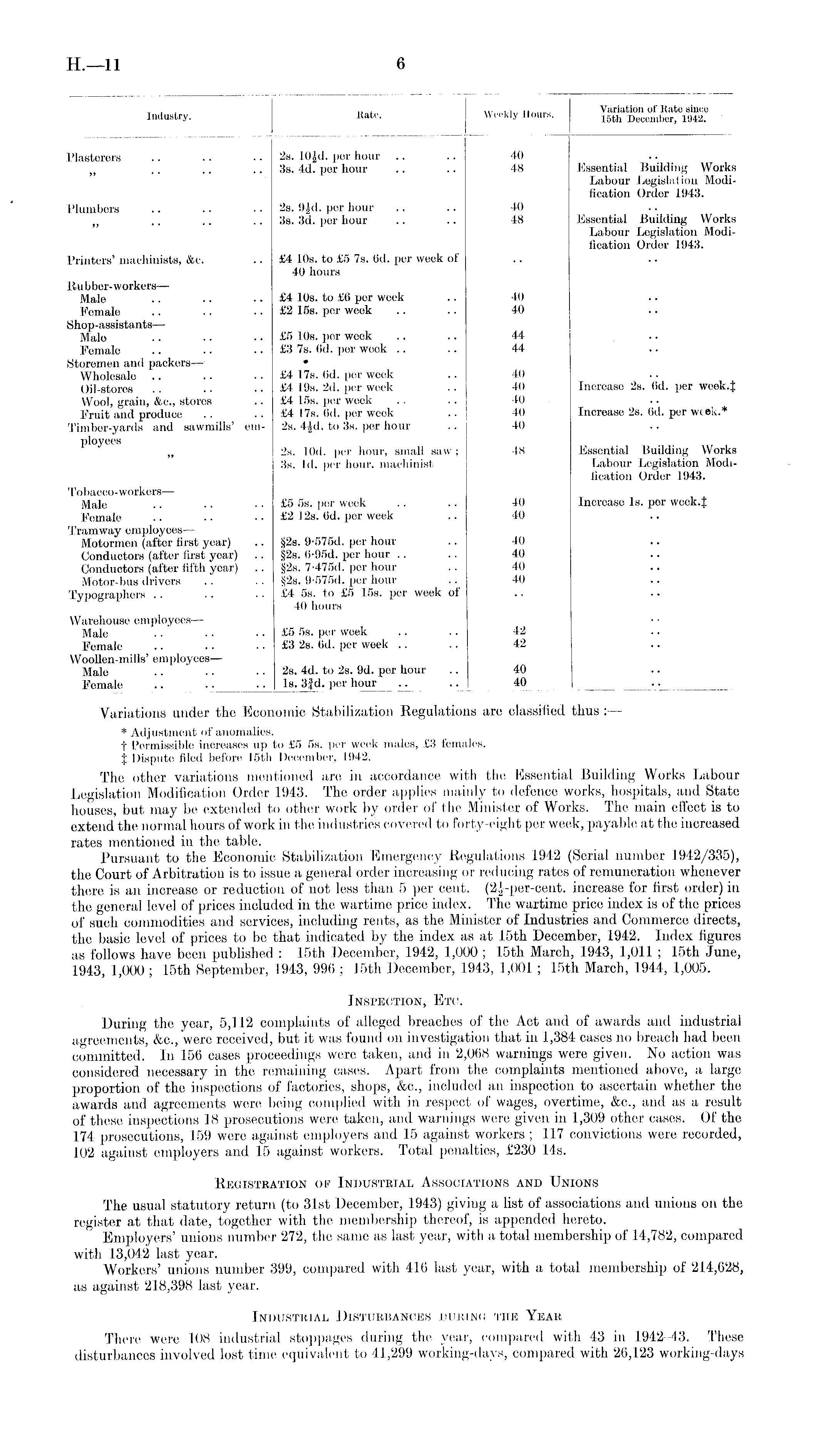 Variations under the Economic Stabilization Regulations are classified thus : — * Adjustment of anomalies. t Permissible increases up to £5 ss. per week males, £3 females. J Dispute filed before 15th December, 1942. The other variations mentioned are in accordance with the Essential Building Works Labour Legislation Modification Order 1943. The order applies mainly to defence works, hospitals, and State houses, but may be extended to other work by order of the Minister of Works. The main effect is to extend the normal hours of work in the industries covered to forty-eight per week, payable at the increased rates mentioned in the table. Pursuant to the Economic Stabilization. Emergency Regulations 1942 (Serial number 1942/335), the Court of Arbitration is to issue a general order increasing or reducing rates of remuneration whenever there is an increase or reduction of not less than 5 per cent. (2|-per-cent. increase for first order) in the general level of prices included in the wartime price index. The wartime price index is of the prices of such commodities and services, including rents, as the Minister of Industries and Commerce directs, the basic level of prices to be that indicated by the index as at 15th December, 1942. Index figures as follows have been published : 15th December, 1942, 1,000 ; 15th March, 1943, 1,011 ; 15th June, 1943, 1,000; 15th September, 1943, 996 ; 15th December, 1943, 1,001 ; 15th March, 1944, 1,005. Inspection, Etc. During the year, 5,112 complaints of alleged breaches of the Act and of awards and industrial agreements, &c., were received, but it was found on investigation that in 1,384 cases no breach had been committed. In 156 cases proceedings were taken, and in 2,068 warnings were given. No action was considered necessary in the remaining cases. Apart from the complaints mentioned above, a large proportion of the inspections of factories, shops, &c., included an inspection to ascertain whether the awards and agreements were being complied with in respect of wages, overtime, &c., and as a result of these inspections 18 prosecutions were taken, and warnings were given in 1,309 other cases. Of the 174 prosecutions, 159 were against employers and 15 against workers ; 117 convictions were recorded, 102 against employers and 15 against workers. Total penalties, £230 14s. Registration of Industrial Associations and Unions The usual statutory return (to 31st December, 1943) giving a list of associations and unions on the register at that date, together with the membership thereof, is appended hereto. Employers' unions number 272, the same as last year, with a total membership of 14,782, compared with 13,042 last year. Workers' unions number 399, compared with 416 last year, with a total membership of 214,628, as against 218,398 last year. Industrial Disturbances during the Year There were 108 industrial stoppages during the year, compared with 43 in 1942-43. These disturbances involved lost time equivalent to 41,299 working-days, compared with 26,123 working-days