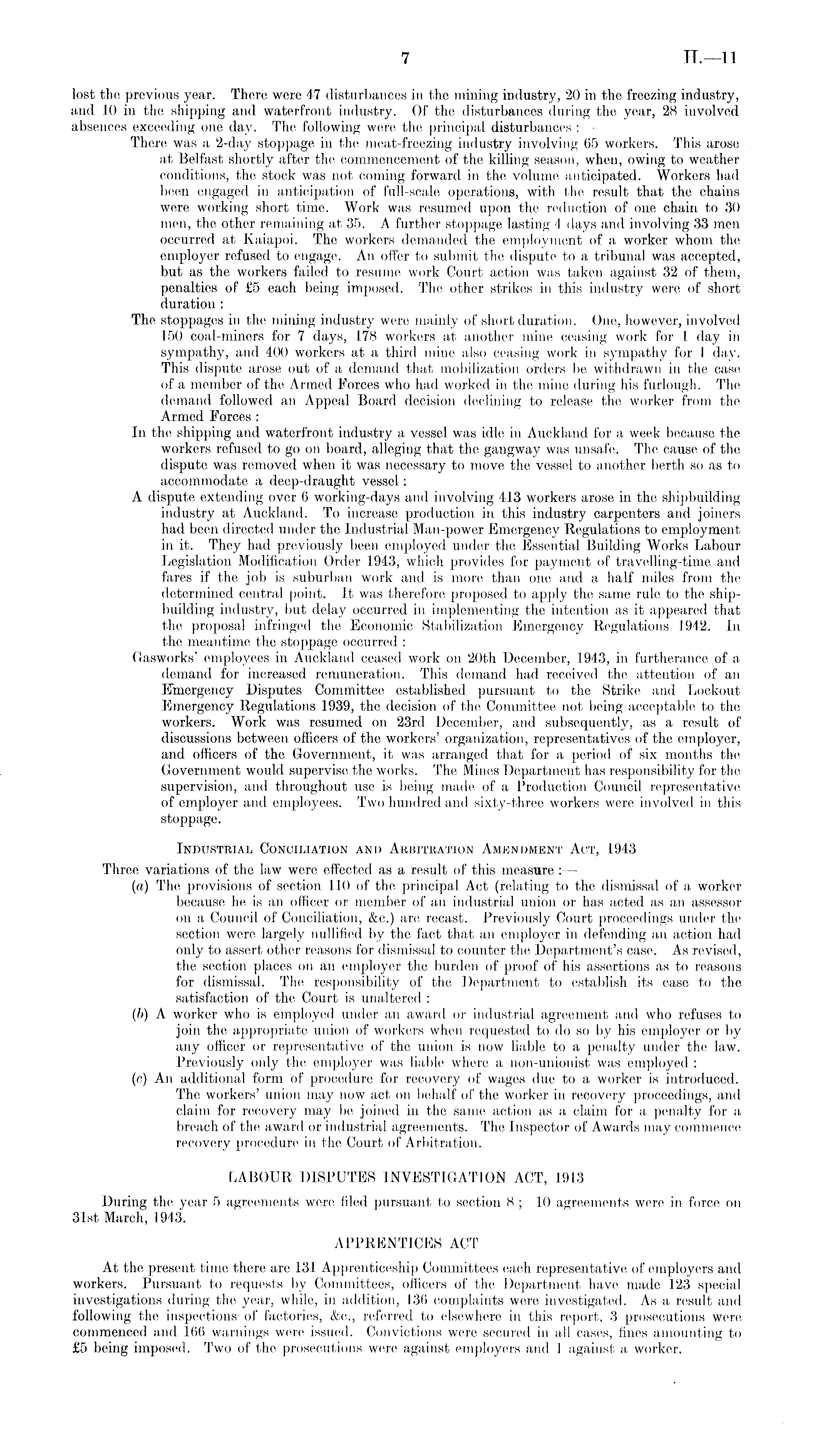 lost the previous year. There were 47 disturbances in the mining industry, 20 in the freezing industry, and 10 in the shipping and waterfront industry. Of the disturbances during the year, 28 involved absences exceeding one day. The following were the principal disturbances : — There was a 2-day stoppage in the meat-freezing industry involving 65 workers. This arose at Belfast shortly after the commencement of the killing season, when, owing to weather conditions, the stock was not coming forward in the volume anticipated. Workers had been engaged in anticipation of full-scale operations, with the result that the chains were working short time. Work was resumed upon the reduction of one chain to 30 men, the other remaining at 35. A further stoppage lasting 4 days and involving 33 men occurred at Kaiapoi. The workers demanded the employment of a worker whom the employer refused to engage. An offer to submit the dispute to a tribunal was accepted, but as the workers failed to resume work Court action was taken against 32 of them, penalties of £5 each being imposed. The other strikes in this industry were of short duration : The stoppages in the mining industry were mainly of short duration. One, however, involved 150 coal-miners for 7 days, 178 workers at another mine ceasing work for 1 day in sympathy, and 400 workers at a third mine also ceasing work in sympathy for 1 day. This dispute arose out of a demand that mobilization orders be withdrawn in the case of a member of the Armed Forces who had worked in the mine during his furlough. The demand followed an Appeal Board decision declining to release the worker from the Armed Forces : In the shipping and waterfront industry a vessel was idle in Auckland for a week because the workers refused to go on board, alleging that the gangway was unsafe. The cause of the dispute was removed when it was necessary to move the vessel to another berth so as to accommodate a deep-draught vessel: A dispute extending over 6 working-days and involving 413 workers arose in the shipbuilding industry at Auckland. To increase production in this industry carpenters and joiners had been directed under the Industrial Man-power Emergency Regulations to employment in it. They had previously been employed under the Essential Building Works Labour Legislation Modification Order 1943, which provides for payment of travelling-time and fares if the job is suburban work and is more than one and a half miles from the determined central point. It was therefore proposed to apply the same rule to the shipbuilding industry, but delay occurred in implementing the intention as it appeared that the proposal infringed the Economic Stabilization Emergency Regulations 1942. In the meantime the stoppage occurred : Gasworks' employees in Auckland ceased work on 20th December, 1943, in furtherance of a demand for increased remuneration. This demand had received the attention of an Emergency Disputes Committee established pursuant to the Strike and Lockout Emergency Regulations 1939, the decision of the Committee not being acceptable to the workers. Work was resumed on 23rd December, and subsequently, as a result of discussions between officers of the workers' organization, representatives of the employer, and officers of the Government, it was arranged that for a period of six months the Government would supervise the works. The Mines Department has responsibility for the supervision, and throughout use is being made of a Production Council representative of employer and employees. Two hundred and sixty-three workers were involved in this stoppage. Industrial Conciliation and Arbitration Amendment Act, 1943 Three variations of the law were effected as a result of this measure : —■ (a) The provisions of section 110 of the principal Act (relating to the dismissal of a worker because he is an officer or member of an industrial union or has acted as an assessor on a Council of Conciliation, &c.) arc recast. Previously Court proceedings under the section were largely nullified by the fact that an employer in defending an action had only to assert other reasons for dismissal to counter the Department's case. As revised, the section places on an employer the burden of proof of his assertions as to reasons for dismissal. The responsibility of the Department to establish its case to the satisfaction of the Court is unaltered : (b) A worker who is employed under an award or industrial agreement and who refuses to join the appropriate union of workers when requested to do so by his employer or by any officer or representative of the union is now liable to a penalty under the law. Previously only the employer was liable where a non-unionist was employed : (c) An additional form of procedure for recovery of wages due to a worker is introduced. The workers' union may now act on behalf of the worker in recovery proceedings, and claim for recovery may be joined in the same action as a claim for a penalty for a breach of the award or industrial agreements. The Inspector of Awards may commence recovery procedure in the Court of Arbitration. LABOUR DISPUTES INVESTIGATION ACT, 1913 During the year 5 agreements were filed pursuant to section 8 ; 10 agreements were in force on 31st March, 1943. APPRENTICES ACT At the present time there are 131 Apprenticeship Committees each representative of employers and workers. Pursuant to requests by Committees, officers of the Department have made 123 special investigations during the year, while, in addition, 136 complaints were investigated. As a result and following the inspections of factories, &c., referred to elsewhere in this report, 3 prosecutions were commenced and 166 warnings were issued. Convictions were secured in all cases, fines amounting to £5 being imposed. Two of the prosecutions were against employers and 1 against a worker.