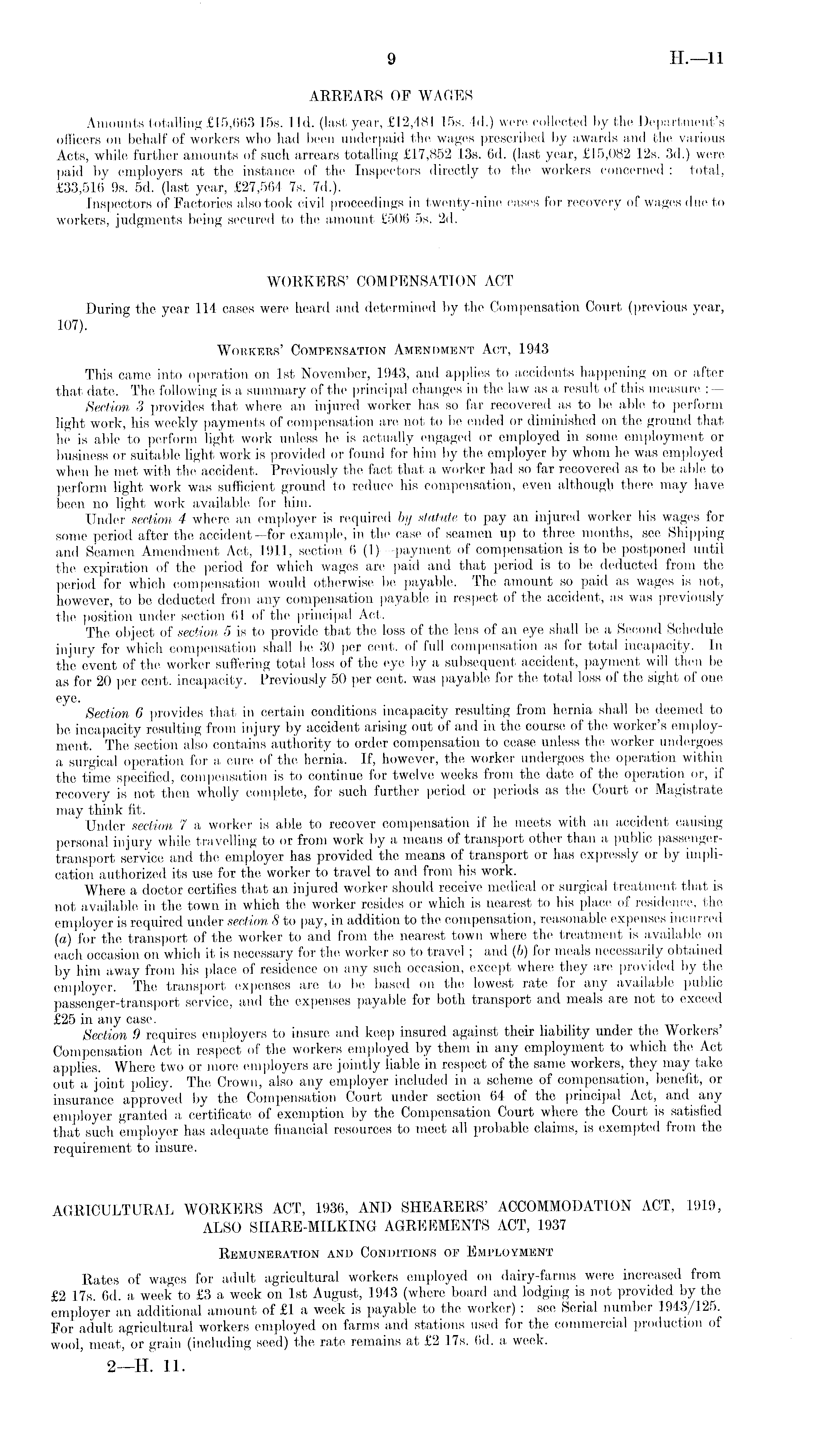 ARREARS OF WAGES Amounts totalling £15,663 15s. lid. (last year, £12,481 15s. 4d.) were collected by the Department's officers on behalf of workers who had been underpaid the wages prescribed by awards and the various Acts, while further amounts of such arrears totalling £17,852 13s. 6d. (last year, £15,082 12s. 3d.) were paid by employers at the instance of the Inspectors directly to the workers concerned : total, £33,516 9s. sd. (last year, £27,564 7s. 7d.). Inspectors of Factories also took civil proceedings in twenty-nine cases for recovery of wages due to workers, judgments being secured to the amount £506 ss. 2d. WORKERS' COMPENSATION ACT During the year 114 cases were heard and determined by the Compensation Court (previous year, 107). Workers' Compensation Amendment Act, 1943 This came into operation on Ist November, 1943, and applies to accidents happening on or after that date. The following is a summary of the principal changes in the law as a result of this measure : — Section 3 provides that where an injured worker has so far recovered as to lie able to perform light work, his weekly payments of compensation are not to be ended or diminished on the ground that he is able to perform light work unless he is actually engaged or employed in some employment or business or suitable light work is provided or found for him by the employer by whom he was employed when he met with the accident. Previously the fact that a worker had so far recovered as to be able to perform light work was sufficient ground to reduce his compensation, even although there may have been no light work available for him. Under section 4 where an employer is required by statute to pay an injured worker his wages for some period after the accident —for example, in the case of seamen up to three months, see Shipping and Seamen Amendment Act, 1911, section 6 (I)—payment of compensation is to be postponed until the expiration of the period for which wages are paid and that period is to be deducted from the period for which compensation would otherwise be payable. The amount so paid as wages is not, however, to be deducted from any compensation payable in respect of the accident, as was previously the position under section 61 of the principal Act. The object of section 5 is to provide that the loss of the lens of an eye shall be a Second Schedule injury for which compensation shall be 30 per cent, of full compensation as for total incapacity. In the event of the worker suffering total loss of the eye by a subsequent accident, payment will then be as for 20 per cent, incapacity. Previously 50 per cent, was payable for the total loss of the sight of one eye. Section 6 provides that in certain conditions incapacity resulting from hernia shall be deemed to be incapacity resulting from injury by accident arising out of and in the course of the worker's employment. The section also contains authority to order compensation to cease unless the worker undergoes a surgical operation for a cure of the hernia. If, however, the worker undergoes the operation within the time specified, compensation is to continue for twelve weeks from the date of the operation or, if recovery is not then wholly complete, for such further period or periods as the Court or Magistrate may think fit. Under section 7 a worker is able to recover compensation if he meets with an accident causing personal injury while travelling to or from work by a means of transport other than a public passengertransport service and the employer has provided the means of transport or has expressly or by implication authorized its use for the worker to travel to and from his work. Where a doctor certifies that an injured worker should receive medical or surgical treatment that is not available in the town in which the worker resides or which is nearest to his place of residence, the employer is required under section 8 to pay, in addition to the compensation, reasonable expenses incurred (a) for the transport of the worker to and from the nearest town where the treatment is available on each occasion on which it is necessary for the worker so to travel; and (b) for meals necessarily obtained by him away from his place of residence on any such occasion, except where they are provided by the employer. The transport expenses are to be based on the lowest rate for any available public passenger-transport service, and the expenses payable for both transport and meals are not to exceed £25 in any case. Section 9 requires employers to insure and keep insured against their liability under the Workers Compensation Act in respect of the workers employed by them in any employment to which the Act applies. Where two or more employers are jointly liable in respect of the same workers, they may take out a joint policy. The Crown, also any employer included in a scheme of compensation, benefit, or insurance approved by the Compensation Court under section 64 of the principal Act, and any employer granted a certificate of exemption by the Compensation Court where the Court is satisfied that such employer has adequate financial resources to meet all probable claims, is exempted from the requirement to insure. AGRICULTURAL WORKERS ACT, 1936, AND SHEARERS' ACCOMMODATION ACT, 1919, ALSO SHARE-MILKING AGREEMENTS ACT, 1937 Remuneration and Conditions Of Employment Rates of wages for adult agricultural workers employed on dairy-farms were increased from £2 17s. 6d. a week to £3 a week on Ist August, 1943 (where board and lodging is not provided by the employer an additional amount of £1 a week is payable to the worker) : see Serial number 1943/125. For adult agricultural workers employed on farms and stations used for the commercial production of wool, meat, or grain (including seed) the rate remains at £2 17s. 6d. a week.