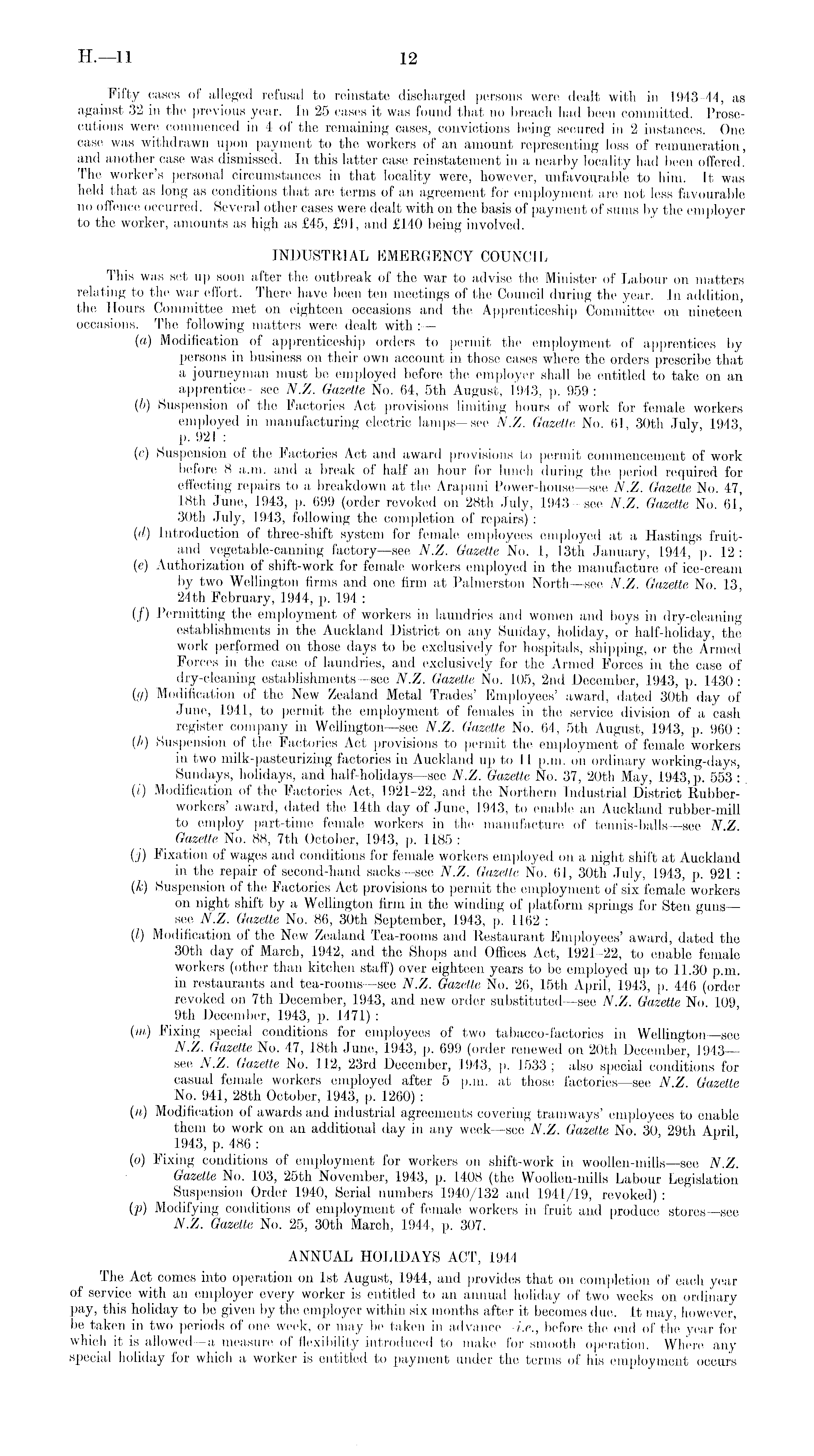 Fifty cases of alleged refusal to reinstate discharged persons wore dealt with in 1943-44, as against 32 in the previous year. In 25 cases it was found that no breach had been committed. Prosecutions were commenced in 4of the remaining cases, convictions being secured in 2 instances. One case was withdrawn upon payment to the workers of an amount representing loss of remuneration, and another case was dismissed. In this latter case reinstatement in a nearby locality had been offered. The worker's personal circumstances in that locality were, however, unfavourable to him. It was held that as long as conditions that are terms of an agreement for employment are not less favourable no offence occurred. Several other cases were dealt with on the basis of payment of sums by the employer to the worker, amounts as high as £45, £91, and £140 being involved. INDUSTRIAL EMERGENCY COUNCIL This was set up soon after the outbreak of the war to advise the Minister of Labour on matters relating to the war effort. There have been ten meetings of the Council during the year. In addition, the Hours Committee met on eighteen occasions and the Apprenticeship Committee on nineteen occasions. The following matters were dealt with :— (a) Modification of apprenticeship orders to permit the employment of apprentices by persons in business on their own account in those cases where the orders prescribe that a journeyman must be employed before the employer shall be entitled to take on an apprentice—see N.Z. Gazette No. 64, sth August, 1943, p. 959 : (b) Suspension of the Factories Act provisions limiting hours of work for female workers employed in manufacturing electric lamps —see N.Z. Gazette No. 61, 30th July 1943 p. 921 : (c) Suspension of the Factories Act and award provisions to permit commencement of work before 8 a.m. and a break of half an hour for lunch during the period required for effecting repairs to a breakdown at the Arapuni Power-house —see N.Z. Gazette No. 47, 18th June, 1943, p. 699 (order revoked on 28th July, 1943—see N.Z. Gazette No. 61, 30th July, 1943, following the completion of repairs) : (d) Introduction of three-shift system for female employees employed at a Hastings fruitand vegetable-canning factory—see N.Z. Gazette No. 1, 13th January, 1944, p. 12 : (e) Authorization of shift-work for female workers employed in the manufacture of ice-cream by two Wellington firms and one firm at Palmerston North—see N.Z. Gazette No. 13, 24th February, 1944, p. 194 : (/) Permitting the employment of workers in laundries and women and boys in dry-cleaning establishments in the Auckland District on any Suiiday, holiday, or half-holiday, the work performed on those days to be exclusively for hospitals, shipping, or the Armed Forces in the case of laundries, and exclusively for the Armed Forces in the case of dry-cleaning establishments—see N.Z. Gazette No. 105, 2nd December, 1943, p. 1430: (g) Modification of the New Zealand Metal Trades' Employees' award, dated 30th day of June, 194-1, to permit the employment of females in the service division of a cash register company in Wellington—see N.Z. Gazette No. 64, sth August, 1943, p. 960 : (li) Suspension of the Factories Act provisions to permit the employment of female workers in two milk-pasteurizing factories in Auckland up to 11 p.m. on ordinary working-days, Sundays, holidays, and half-holidays—see N.Z. Gazette No. 37, 20th May, 1943, p. 553 : (i) Modification of the Factories Act, 1921-22, and the Northern Industrial District Rubberworkers' award, dated the 14th day of June, 1943, to enable an Auckland rubber-mill to employ part-time female workers in the manufacture of tennis-balls—see N.Z Gazette No. 88, 7th October, 1943, p. 1185 : (j) Fixation of wages and conditions for female workers employed on a night shift at Auckland in the repair of second-hand sacks —see N.Z. Gazette No. 61, 30th July, 1943, p. 921 : (k) Suspension of the Factories Act provisions to permit the employment of six female workers on night shift by a Wellington firm in the winding of platform springs for Sten gunssee N.Z. Gazette No. 86, 30th September, 1943, p. 1162 : (I) Modification of the New Zealand Tea-rooms and Restaurant Employees' award, dated the 30th day of March, 1942, and the Shops and Offices Act, 1921-22, to enable female workers (other than kitchen staff) over eighteen years to be employed up to 11.30 p.m. in restaurants and tea-rooms —see N.Z. Gazette No. 26, 15th April, 1943, p. 446 (order revoked on 7th December, 1943, and new order substituted—see N.Z. Gazette No. 109, 9th December, 1943, p. 1471) : (m) Fixing special conditions for employees of two tabacco-factories in Wellington—see N.Z. Gazette No. 47, 18th June, 1943, p. 699 (order renewed on 20th December, 1943— see N.Z. Gazette No. 112, 23rd December, 1943, p. 1533; also special conditions for casual female workers employed after 5 p.m. at those factories—see N.Z. Gazette No. 941, 28th October, 1943, p. 1260): (n) Modification of awards and industrial agreements covering tramways' employees to enable them to work on an additional day in any week —see N.Z. Gazette No. 30, 29th April 1943, p. 486 : (o) Fixing conditions of employment for workers on shift-work in woollen-mills—see N.Z. Gazette No. 103, 25th November, 1943, p. 1408 (the Woollen-mills Labour Legislation Suspension Ordef 1940, Serial numbers 1940/132 and 1941/19, revoked): (p) Modifying conditions of employment of female workers in fruit and produce stores—see N.Z. Gazette No. 25, 30th March, 1944-, p. 307. ANNUAL HOLIDAYS ACT, 1944 The Act comes into operation on Ist August, 1944, and provides that on completion of each year of service with an employer every worker is entitled to an annual holiday of two weeks on ordinary pay, this holiday to be given by the employer within six months after it becomes due. It may, however, be taken in two periods of one week, or may be taken in advance—i.e., bef