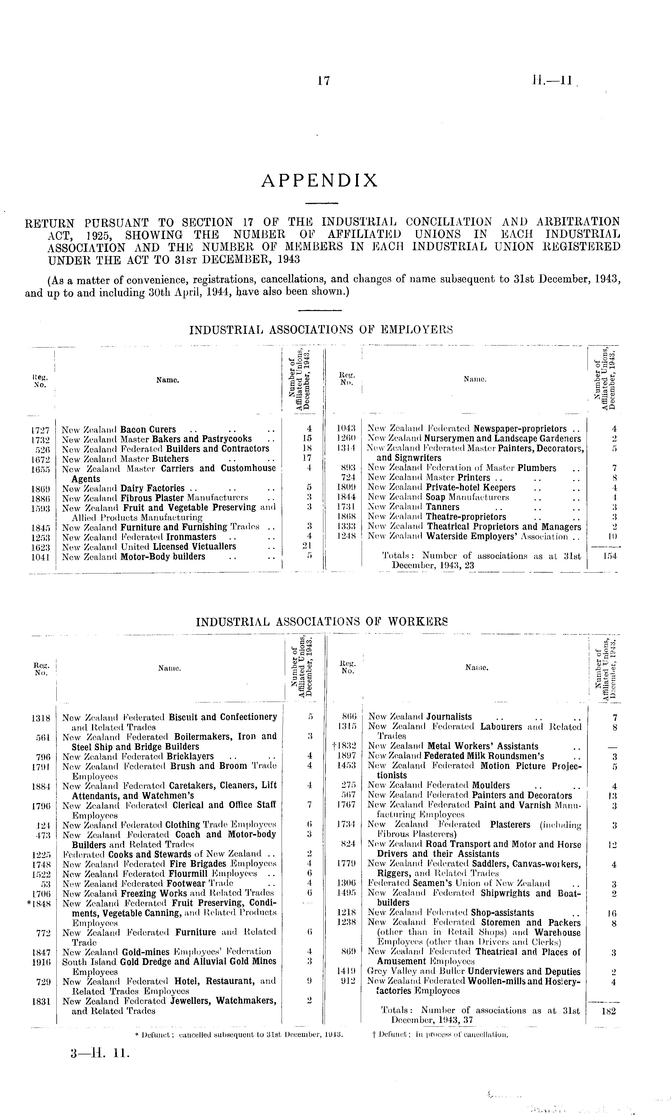 t APPENDIX RETURN PURSUANT TO SECTION 17 OF THE INDUSTRIAL CONCILIATION AND ARBITRATION ACT, 1925, SHOWING THE NUMBER OF AFFILIATED UNIONS IN EACH INDUSTRIAL ASSOCIATION AND THE NUMBER OF MEMBERS IN EACH INDUSTRIAL UNION REGISTERED UNDER THE ACT TO 31st DECEMBER, 1943 (As a matter of convenience, registrations, cancellations, and changes of name subsequent to 31st December, 1943, and up to and including 30th April, 1944, have also been shown.)