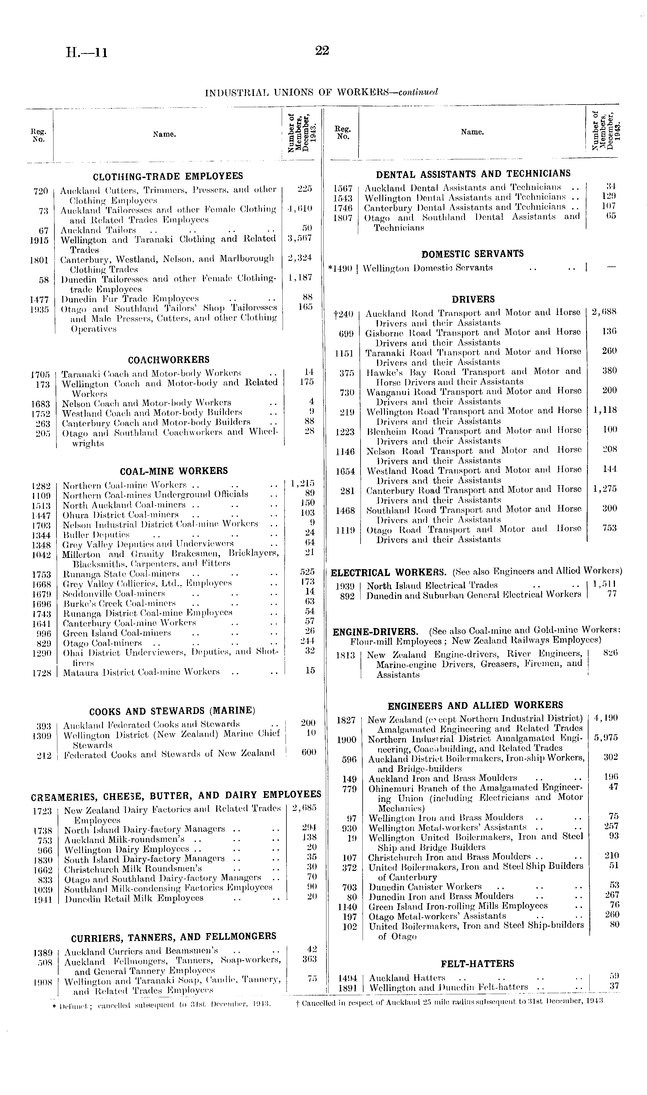 ® m g B-eg. Name a No. JName * a §83 S3M <£ DENTAL ASSISTANTS AND TECHNICIANS 1567 Auckland Dental Assistants and Technicians .. 34 1543 Wellington Dental Assistants and Technicians .. 129 1746 Canterbury Dental Assistants and Technicians .. 107 1807 Otago and Southland Dental Assistants and 65 Technicians DOMESTIC SERVANTS *1490 | Wellington Domestic Servants .. .. I — DRIVERS j-240 Auckland Road Transport and Motor and Horse 2,688 Drivers and their Assistants 699 Gisborne Road Transport and Motor and Horse 136 Drivers and their Assistants 1151 Taranaki Road Transport and Motor and Horse 260 Drivers and their Assistants 375 Hawke's Bay Road Transport and Motor and 380 Horse Drivers and their Assistants 730 Wanganui Road Transport and Motor and Horse 200 Drivers and their Assistants 219 Wellington Road Transport and Motor and Horse 1,118 Drivers and their Assistants 1223 Blenheim Road Transport and Motor and Horse 100 Drivers and their Assistants 1146 Nelson Road Transport and Motor and Horse 208 Drivers and their Assistants 1654 Westland Road Transport and Motor and Horse 144 Drivers and their Assistants 281 Canterbury Road Transport and Motor and Horse 1,275 Drivers and their Assistants 1.468 Southland Road Transport and Motor and Horse 300 Drivers and their Assistants 1119 Otago Road Transport and Motor and Horso 753 Drivers and their Assistants ELECTRICAL WORKERS. (See also Engineers and Allied Workers) 1939 I North Island Electrical Trades .. -. I 1,511 892 I Dunedin and Suburban General Electrical Workers | 77 ENGINE-DRIVERS. (See also Coal-mine and Gold-mine Workers: Flour-mill Employees ; New Zealand Railways Employees) 1813 New Zealand Engine-drivers, River Engineers, 826 Marine-engine Drivers, Greasers, Firemen, and Assistants ENGINEERS AND ALLIED WORKERS 1827 New Zealand (e>cept Northern Industrial District) 4,190 Amalgamated Engineering and Related Trades 1900 Northern Industrial District Amalgamated Engi- 5,975 neering, Coaeii building, and Related Trades 596 Auckland District Boilermakers, Iron-ship Workers, 302 and Bridge-builders 149 Auckland Iron and Brass Moulders .. .. 196 779 Ohinemuri Branch of the Amalgamated Engineer- 47 ing Union (including Electricians and Motor Mechanics) 97 Wellington Iron and Brass Moulders .. .. 75 930 Wellington Metal-workers' Assistants .. .. 257 19 Wellington United Boilermakers, Iron and Steel 93 Ship and Bridge Builders 107 Christchurch Iron and Brass Moulders .. .. 210 372 United Boilermakers, Iron and Steel Ship Builders 51 of Canterbury 703 Dunedin Canister Workers .. .. • • 53 80 Dunedin Iron and Brass Moulders .. .. 267 1140 Green Island Iron-rolling Mills Employees .. 76 197 Otago Metal-workers' Assistants .. .. 260 102 United Boilermakers, Iron and Steel Ship-builders 80 of Otago FELT-HATTERS 1494 I Auckland Hatters .. .. • • • • I 59 1891 I Wellington and Dunedin Felt-hatters ■ ■ • • 1 37 oiled in respect of Auckland 25 mile radius subsequent to 31st December, 1943