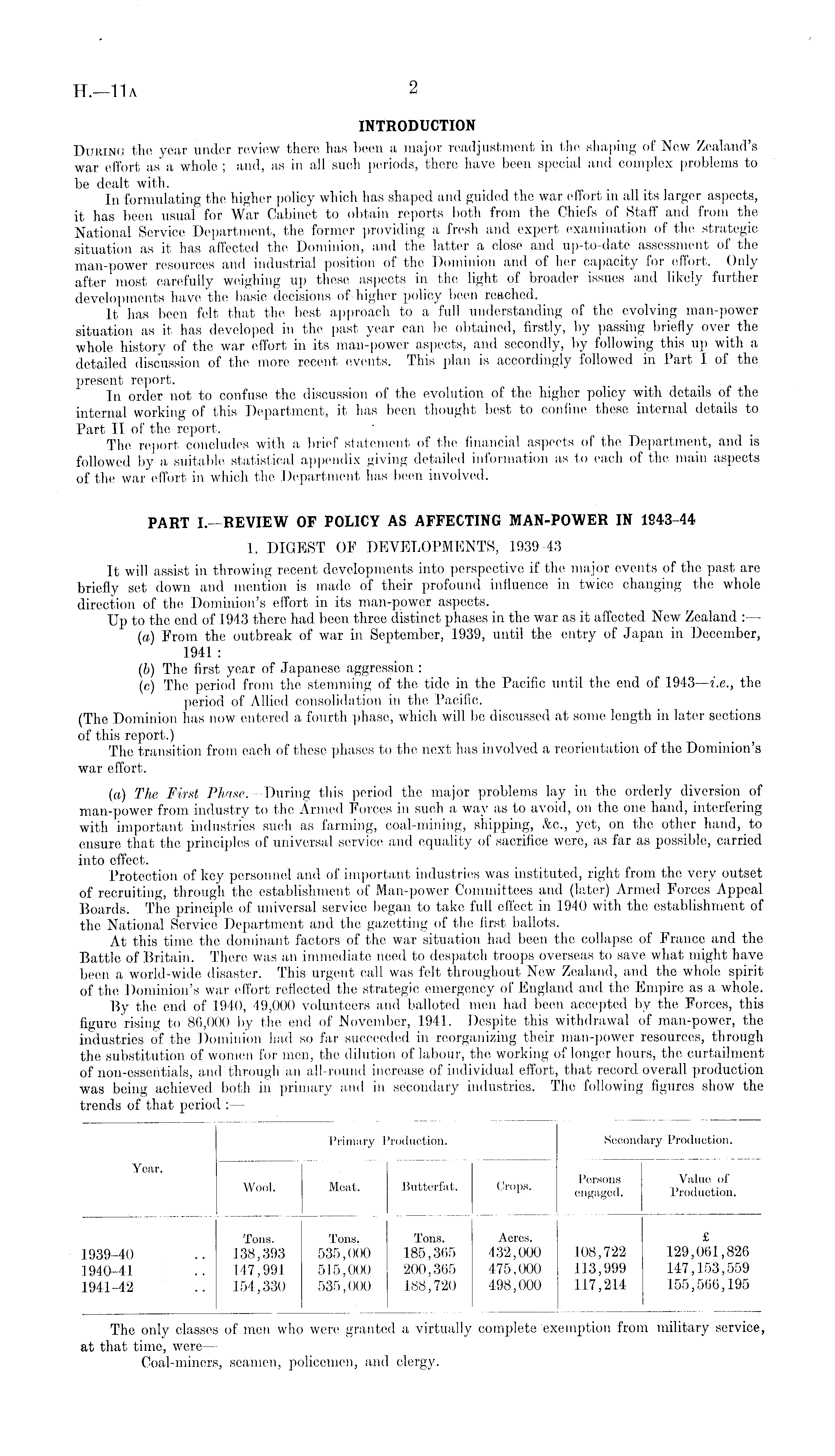 INTRODUCTION During the year under review there has been a major readjustment in the shaping of New Zealand's war effort as a whole ; and, as in all such periods, there have been special and complex problems to be dealt with. In formulating the higher policy which has shaped and guided the war effort in all its larger aspects, it has been usual" for War Cabinet to obtain reports both from the Chiefs of Staff and from the National Service Department, the former providing a fresh and expert examination of the strategic situation as it has affected the Dominion, and the latter a close and up-to-date assessment of the man-power resources and industrial position of the Dominion and of her capacity for effort. Only after most carefully weighing up these aspects in the light of broader issues and likely further developments have the basic decisions of higher policy been reached. It has been felt that the best approach to a full understanding of the evolving man-power situation as it has developed in the past year can be obtained, firstly, by passing briefly over the whole history of the war effort in its man-power aspects, and secondly, by following this up with a detailed discussion of the more recent events. This plan is accordingly followed in Part I of the present report. In order not to confuse the discussion of the evolution of the higher policy with details of the internal working of this Department, it has been thought best to confine these internal details to Part II of the report. The report concludes with a brief statement of the financial aspects of the Department, and is followed by a suitable statistical appendix giving detailed information as to each of the main aspects of the war effort in which the Department has been involved. PART I.—REVIEW OF POLICY AS AFFECTING MAN-POWER IN 1943-44 1. DIGEST OF DEVELOPMENTS, 1939 43 It will assist in throwing recent developments into perspective if the major events of the past are briefly set down and mention is made of their profound influence in twice changing the whole direction of the Dominion's effort in its man-power aspects. "Up to the end of 1943 there had been three distinct phases in the war as it affected New Zealand :— (a) From the outbreak of war in September, 1939, until the entry of Japan in December, 1941: (b) The first year of Japanese aggression : (c) The period from the stemming of the tide in the Pacific until the end of 1943 — i.e., the period of Allied consolidation in the Pacific. (The Dominion has now entered a fourth phase, which will be discussed at some length in later sections of this report.) The transition from each of these phases to the next has involved a reorientation of the Dominion's war effort. (a) The First Phase. —During this period the major problems lay in the orderly diversion of man-power from industry to the Armed Forces in such a way as to avoid, on the one hand, interfering with important industries such as farming, coal-mining, shipping, &c, yet, on the other hand, to ensure that the principles of universal service and equality of sacrifice were, as far as possible, carried into effect. Protection of key personnel and of important industries was instituted, right from the very outset of recruiting, through the establishment of Man-power Committees and (later) Armed Forces Appeal Boards. The principle of universal service began to take full effect in 1940 with the establishment of the National Service Department and the gazetting of the first ballots. At this time the dominant factors of the war situation had been the collapse of France and the Battle of Britain. There was an immediate need to despatch troops overseas to save what might have been a world-wide disaster. This urgent call was felt throughout New Zealand, and the whole spirit of the Dominion's war effort reflected the strategic emergency of England and the Empire as a whole. By the end of 1940, 49,000 volunteers and balloted men had been accepted by the Forces, this figure rising to 86,000 by the end of November, 1941. Despite this withdrawal of man-power, the industries of the Dominion had so far succeeded in reorganizing their man-power resources, through the substitution of women for men, the dilution, of labour, the working of longer hours, the curtailment of non-essentials, and through an all-round increase of individual effort, that record overall production was being achieved both in primary and in secondary industries. The following figures show the trends of that period : —