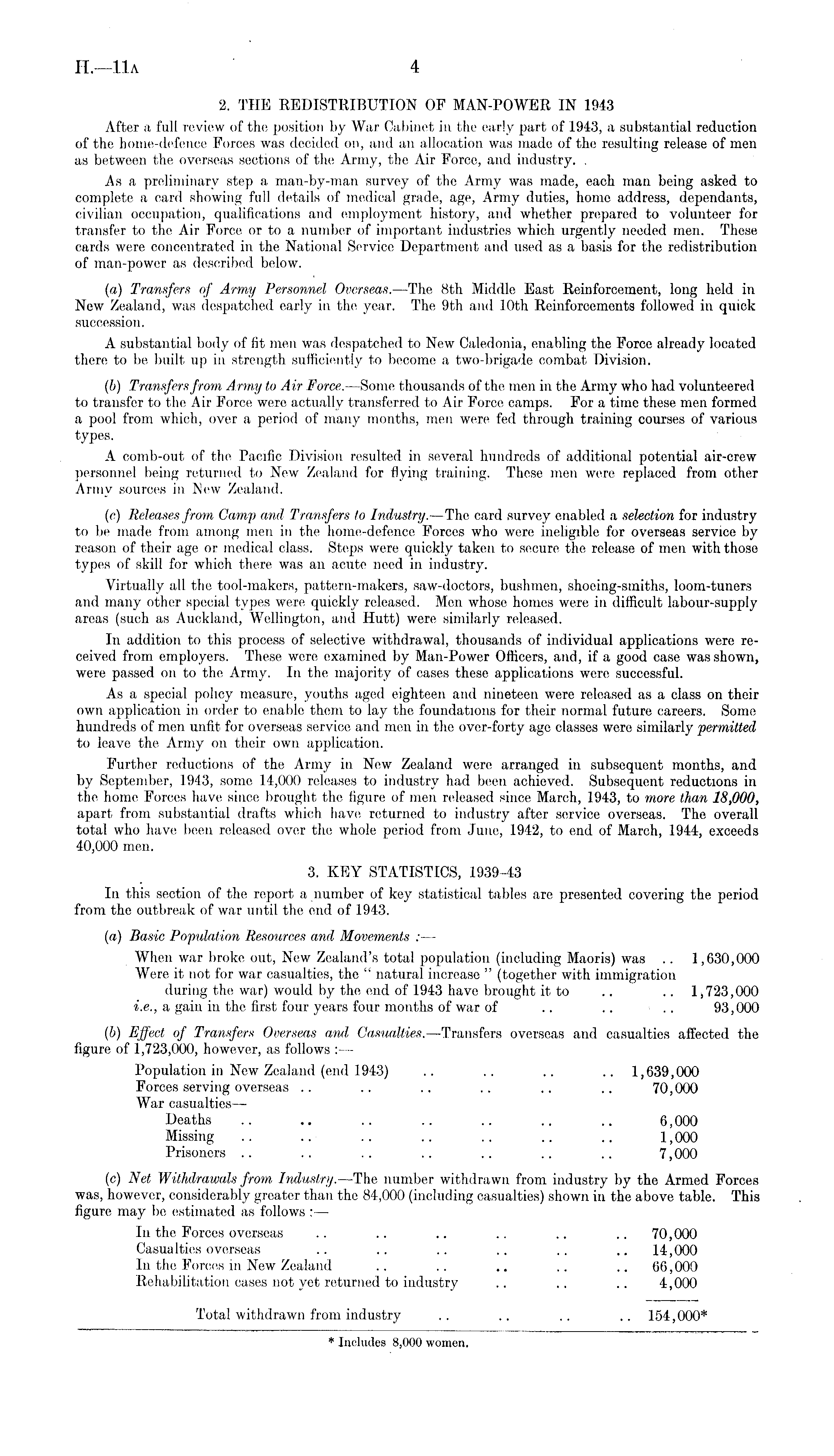 2. THE REDISTRIBUTION OF MAN-POWER IN 1943 After a full review of the position by War Cabinet in the early part of 1943, a substantial reduction of the home-defence Forces was decided on, and an allocation was made of the resulting release of men as between the overseas sections of the Army, the Air Force, and industry. , As a preliminary step a man-by-man survey of the Army was made, each man being asked to complete a card showing full details of medical grade, age, Army duties, home address, dependants, civilian occupation, qualifications and employment history, and whether prepared to volunteer for transfer to the Air Force or to a number of important industries which urgently needed men. These cards were concentrated in the National Service Department and used as a basis for the redistribution of man-power as described below. (a) Transfers of Army Personnel Overseas. —The Bth Middle East Reinforcement, long held in New Zealand, was despatched early in the year. The 9th and 10th Reinforcements followed in quick succession. A substantial body of fit men was despatched to New Caledonia, enabling the Force already located there to be built up in strength sufficiently to become a two-brigade combat Division. (b) Transfers from Army to Air Force. —Some thousands of the men in the Army who had volunteered to transfer to the Air Force were actually transferred to Air Force camps. For a time these men formed a pool from which, over a period of many months, men were fed through training courses of various types. A comb-out of the Pacific Division resulted in several hundreds of additional potential air-crew personnel being returned to New Zealand for flying training. These men were replaced from other Army sources in New Zealand. (c) Releases from Camp and Transfers to Industry. —The card survey enabled a selection for industry to be made from among men in the home-defence Forces who were ineligible for overseas service by reason of their age or medical class. Steps were quickly taken to secure the release of men with those types of skill for which there was an acute need in industry. Virtually all the tool-makers, pattern-makers, saw-doctors, bushmen, shoeing-smiths, loom-tuners and many other special types were quickly released. Men whose homes were in difficult labour-supply areas (such as Auckland, Wellington, and Hutt) were similarly released. In addition to this process of selective withdrawal, thousands of individual applications were received from employers. These were examined by Man-Power Officers, and, if a good case was shown, were passed on to the Army. In the majority of cases these applications were successful. As a special policy measure, youths aged eighteen and nineteen were released as a class on their own application in order to enable them to lay the foundations for their normal future careers. Some hundreds of men unfit for overseas service and men in the over-forty ago classes were similarly permitted to leave the Army on their own application. Further reductions of the Army in New Zealand were arranged in subsequent months, and by September, 1943, some 14,000 releases to industry had been achieved. Subsequent reductions in the home Forces have since brought the figure of men released since March, 1943, to more than 18,000, apart from substantial drafts which have returned to industry after service overseas. The overall total who have been released over the whole period from June, 1942, to end of March, 1944, exceeds 40,000 men. 3. KEY STATISTICS, 1939-43 In this section of the report a number of key statistical tables are presented covering the period from the outbreak of war until the end of 1943. (a) Basic Population Resources and Movements : — When war broke out, New Zealand's total population (including Maoris) was .. 1,630,000 Were it not for war casualties, the " natural increase " (together with immigration during the war) would by the end of 1943 have brought it to .. .. 1,723,000 i.e., a gain in the first four years four months of war of .. .. > .. 93,000 (b) Effect of Transfers Overseas and Casualties. —Transfers overseas and casualties affected the figure of 1,723,000, however, as follows : — Population in New Zealand (end 1943) .. .. .. ..1,639,000 Forces serving overseas .. .. .. .. .. .. 70,000 War casualties— Deaths .. .. .. .. .. .. .. 6,000 Missing .. .. .. .. .. .. .. 1,000 Prisoners .. . . .. .. .. .. .. 7,000 (c) Net Withdrawals from Industry. —The number withdrawn from industry by the Armed Forces was, however, considerably greater than the 84,000 (including casualties) shown in the above table. This figure may be estimated as follows : — In the Forces overseas .. .. .. .. .. .. 70,000 Casualties overseas .. .. .. .. .. .. 14,000 In the Forces in New Zealand .. .. .. .. .. 66,000 Rehabilitation cases not yet returned to industry .. .. .. 4,000 Total withdrawn from industry .. .. .. .. 154,000* * Includes 8,000 women.