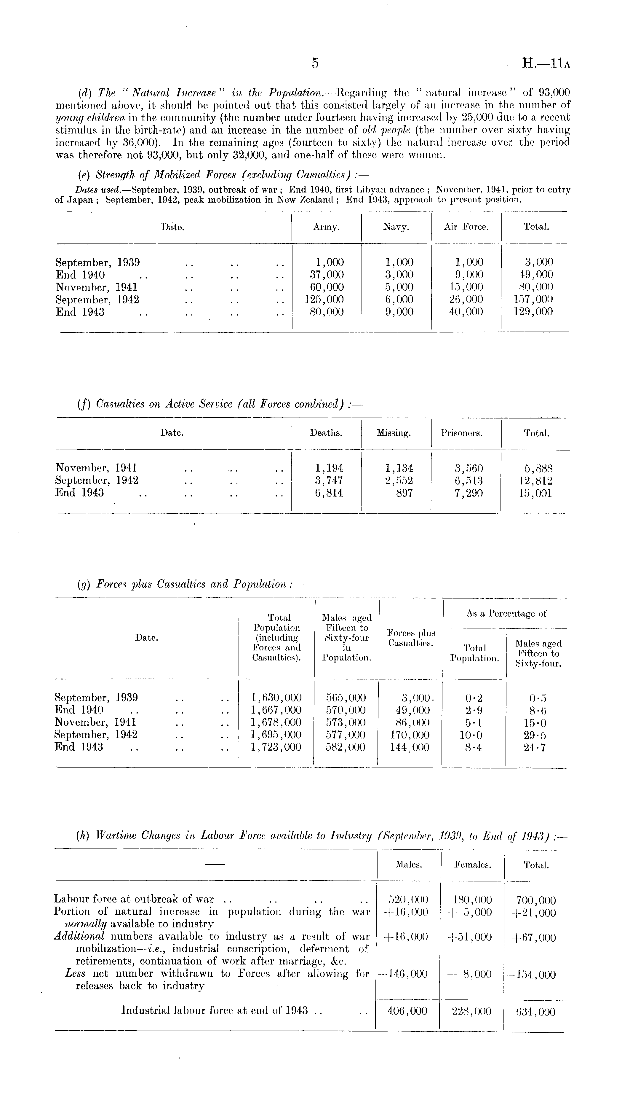 (e) Strength of Mobilized Forces (excluding Casualties) : — Dates used. —September, 1939, outbreak of war ; End 1940, first Libyan advance ; November, 1941, prior to entry of Japan; September, 1942, peak mobilization in New Zealand; End 1943, approach to present position.