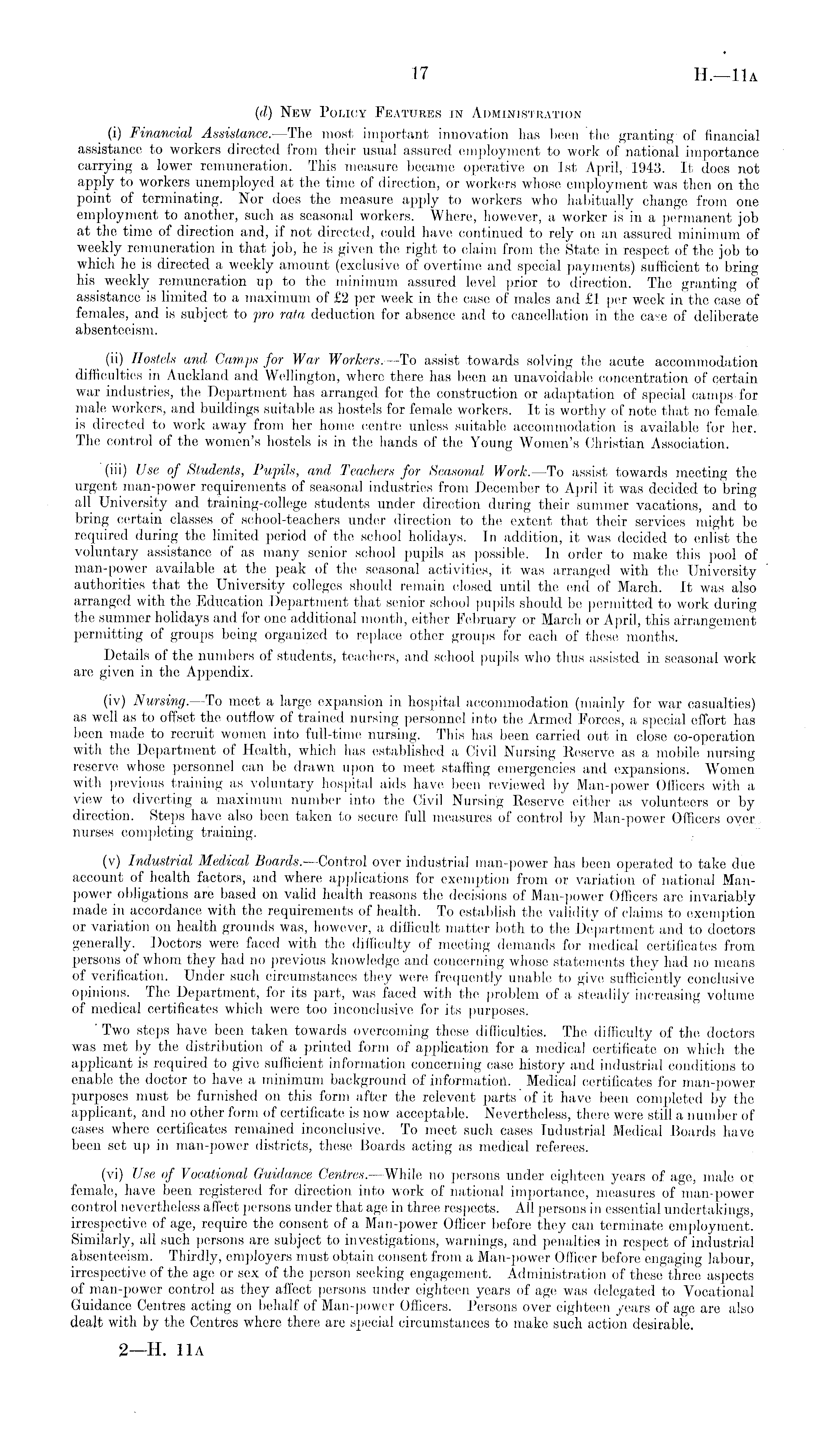 (d) New Policy Features in Administration (i) Financial Assistance. —The most important innovation has been the granting' of financial assistance to workers directed from their usual assured employment to work of national importance carrying a lower remuneration. This measure became operative on Ist April, 1943. It docs not apply to workers unemployed at the time of direction, or workers whose employment was then on the point of terminating. Nor does the measure apply to workers who habitually change from one employment to another, such as seasonal workers. Where, however, a worker is in a permanent job at the time of direction and, if not directed, could have continued to rely on an assured minimum of weekly remuneration in that job, he is given the right to claim from the State in respect of the job to which he is directed a weekly amount (exclusive of overtime and special payments)- sufficient to' bring his weekly remuneration up to the minimum assured level prior to direction. The granting of assistance is limited to a maximum of £2 per week in the case of males and £1 per week in the case of females, and is subject to pro rata deduction for absence and to cancellation in the case of deliberate absenteeism. (ii) Hostels and Camps for War Workers. —To assist towards solving the acute accommodation difficulties in Auckland and Wellington, where there has been an unavoidable concentration of certain war industries, the Department has arranged for the construction or adaptation of special camps for male workers, and buildings suitable as hostels for female workers. It is worthy of note that no female: is directed to work away from her home centre unless suitable accommodation is available for her. The control of the women's hostels is in the hands of the Young Women's Christian Association. (iii) Use of Students, Pupils, and Teachers for Seasonal Work. —To assist towards meeting the urgent man-power requirements of seasonal industries from December to April it was decided to bring all University and training-college students under direction during their summer vacations, and to bring certain classes of school-teachers under direction to the extent that their services might be required during the limited period of the school holidays. In addition, it was decided to enlist the voluntary assistance of as many senior school pupils as possible. In order to make this pool of man-power available at the peak of the seasonal activities, it was arranged with the University authorities that the University colleges should remain closed until the end of March. It was also arranged with the Education Department that senior school pupils should bo permitted to work during the summer holidays and for one additional month, either February or March or April, this arrangement permitting of groups being organized to replace other groups for each of these months. Details of the numbers of students, teachers, and school pupils who thus assisted in seasonal work are given in the Appendix. (iv) Nursing. —To meet a largo expansion in hospital accommodation (mainly for war casualties) as well as to offset the outflow of trained nursing personnel into the Armed Forces, a special effort has been made to recruit women into full-time nursing. This has been carried out in close co-operation with the Department of Health, which lias established a Civil Nursing Reserve as a mobile nursing reserve whose personnel can be drawn upon to meet staffing emergencies and expansions. Women with previous training as voluntary hospital aids have been reviewed by Man-power Officers with a view to diverting a maximum number into the Civil Nursing Reserve either as volunteers or by direction. Steps have also been taken to secure full measures of control by Man-power Officers over nurses completing training. (v) Industrial Medical Boards.— Control over industrial man-power has been operated to take due account of health factors, and where applications for exemption from or variation of national Manpower obligations are based on valid health reasons the decisions of Man-power Officers are invariably made in accordance with the requirements of health. To establish the validity of claims to exemption or variation on health grounds was, however, a difficult matter both to the Department and to doctors generally. Doctors were faced with the difficulty of meeting demands for medical certificates from persons of whom they had no previous knowledge and concerning whose statements they had no means of verification. Under such circumstances they were frequently unable to give sufficiently conclusive opinions. The Department, for its part, was faced with the problem of a steadily increasing volume of medical certificates which were too inconclusive for its purposes. ' Two steps have been taken towards overcoming these difficulties. The difficulty of the doctors was met by the distribution of a printed form, of application for a medical certificate on which the applicant is required to give sufficient information concerning case history and industrial conditions to enable the doctor to have a minimum background of information. Medica] certificates for man-power purposes must be furnished on this form after the relevent parts' of it have been completed by the applicant, and no other form of certificate is now acceptable. Nevertheless, there were still a number of cases where certificates remained inconclusive. To meet such cases Industrial Medical Boards have been set up in man-power districts, these Boards acting as medical referees. (vi) Use of Vocational Guidance Centres. —While no persons under eighteen years of age, male or female, have been registered for direction into work of national importance, measures of man-power control nevertheless affect persons under that age in three respects. All persons i n essential undertakings, irrespective of age, require the consent of a Man-power Officer before they can terminate employment. 