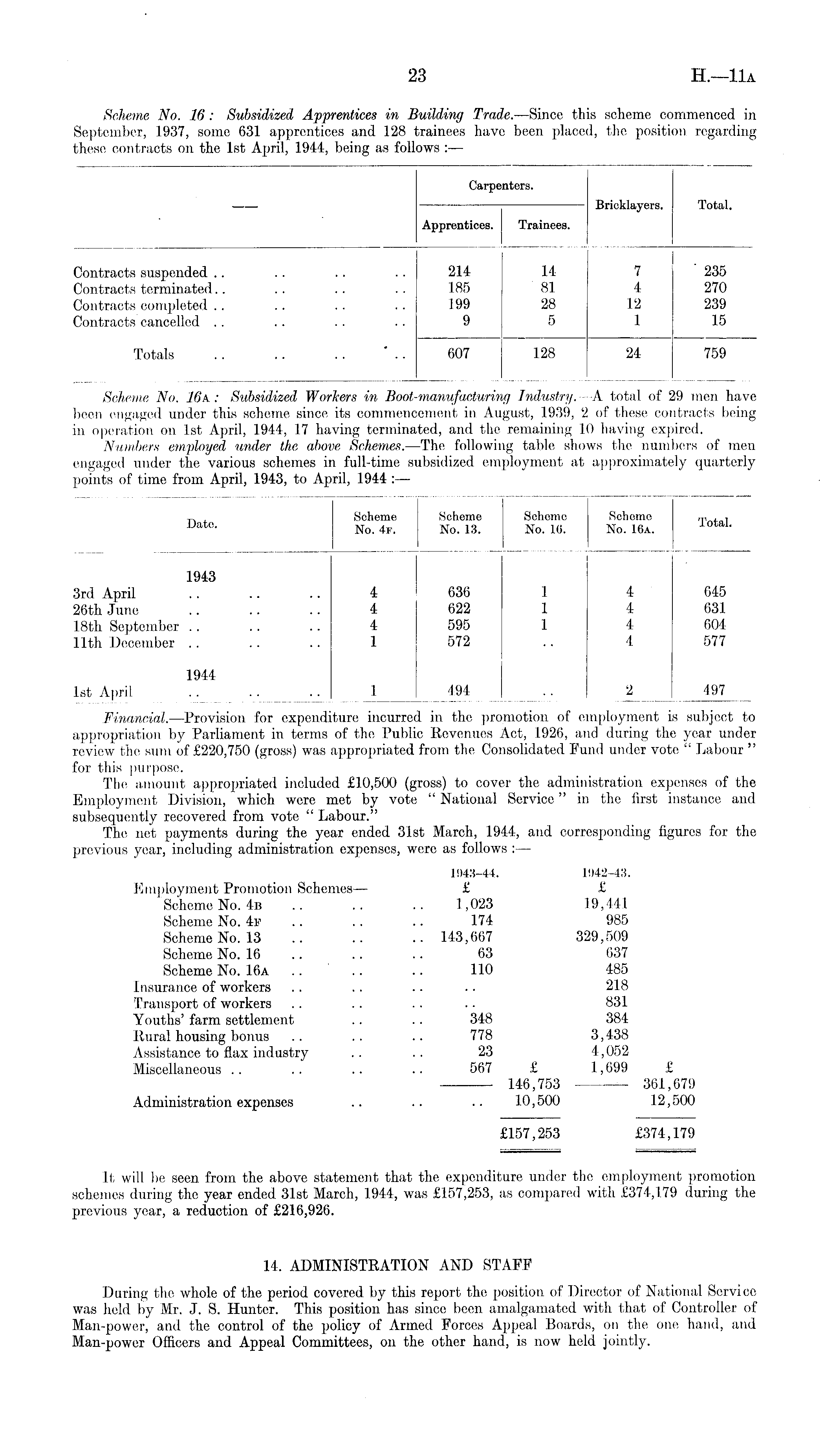 Financial. —Provision for expenditure incurred in the promotion of employment is subject to appropriation by Parliament in terms of the Public Revenues Act, 1926, and during the year under review the sum of £220,750 (gross) was appropriated from the Consolidated Fund under vote " Labour " for this purpose. The amount appropriated included £10,500 (gross) to cover the administration expenses of the Employment Division, which were met by vote " National Service" in the first instance and subsequently recovered from vote " Labour." The net payments during the year ended 31st March, 1944, and corresponding figures for the previous year, including administration expenses, were as follows : — 1943-44. 1942-43. Employment Promotion Schemes— £ £ Scheme No. 4b .. .. .. 1,023 19,441 Scheme No. 4f .. .. .. 174 985 Scheme No. 13 143,667 329,509 Scheme No. 16 .. .. 63 637 Scheme No. 16a .. .. .. 110 485 Insurance of workers .. .. .. .. 218 Transport of workers .. .. .. .. 831 Youths' farm settlement .. .. 348 384 Rural housing bonus .. . . .. 778 3, 438 Assistance to flax industry .. .. 23 4, 052 Miscellaneous 567 £ 1,699 £ 146,753 361,679 Administration expenses .. .. .. 10,500 12,500 £157,253 £374,179 It will be seen from the above statement that the expenditure under the employment promotion schemes during the year ended 31st March, 1944, was £157,253, as compared with £374,179 during the previous year, a reduction of £216,926. 14. ADMINISTRATION AND STAFF During the whole of the period covered by this report the position of Director of National Service was held by Mr. J. S. Hunter. This position has since been amalgamated with that of Controller of Man-power, and the control of the policy of Armed Forces Appeal Boards, on the one hand, and Man-power Officers and Appeal Committees, on the other hand, is now held jointly.