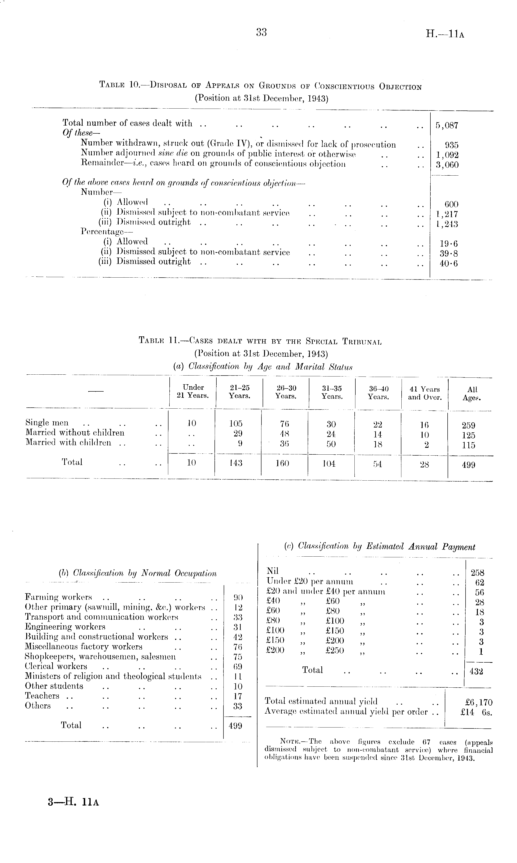 Table 10.—Disposal op Appeals on Grounds of Conscientious Objection (Position at 31st December, 1943) Total number of cases dealt with .. .. .. .. .. • .. 5 087 Of these— Number withdrawn, struck out (Grade IV), or dismissed for lack of prosecution .. 935 Number adjourned sine die on grounds of public interest or otherwise .. .. 1,092 Remainder— i.e., cases hoard on grounds of conscientious objection .. .. 3,060 Of the above cases heard on grounds of conscientious objection — Number— (i) Allowed .. .. . . .. .. .. ~ ~ 600 (ii) Dismissed subject to non-combatant service .. .. .. .. 1 217 (iii) Dismissed outright .. .. .. .. ..." .. .. 1 243 Percentage— (i) Allowed .. .. .. .. .. .. .. .. X 9-6 (ii) Dismissed subject to non-combatant service .. .. .. .. 39-8 (iii) Dismissed outright .. .. .. .. .. ~ .. 40-6