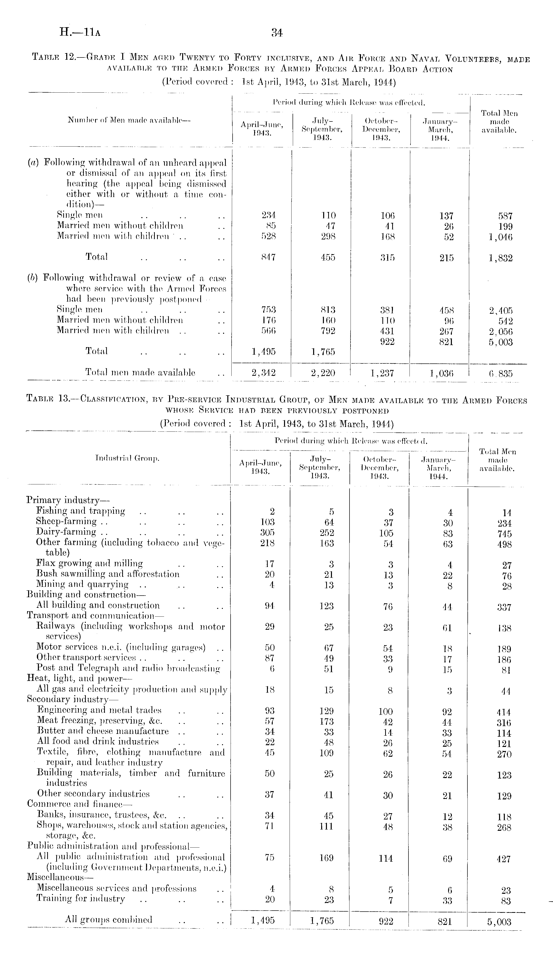 Table 12. —Grade I Men aged Twenty to Forty inclusive, and Air Force and Naval Volunteers, made available to the Armed Forces by Armed Forces Appeal Board Action