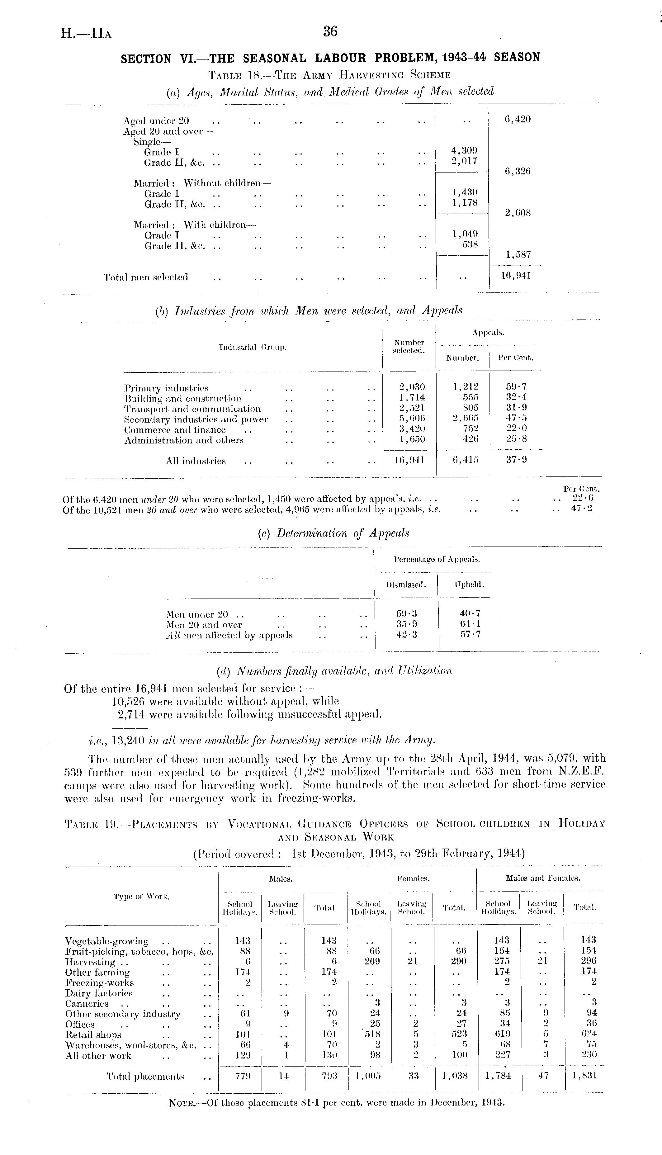 (d) Numbers finally available, and Utilization Of the entire 16,941 men selected for service : — .10,526 were available without appeal, while 2,714 were available following unsuccessful appeal. i.e., 13,240 in all were available for harvesting service with the Army. The number of these men actually used by the Army up to the 28th April, 1.944, was 5,079, with 539 further men expected to be required (1,282 mobilized Territorials and 633 men from N.Z.E.E. camps were also used for harvesting work). Some hundreds of the men selected for short-time service were also used for emergency work in freezing-works.