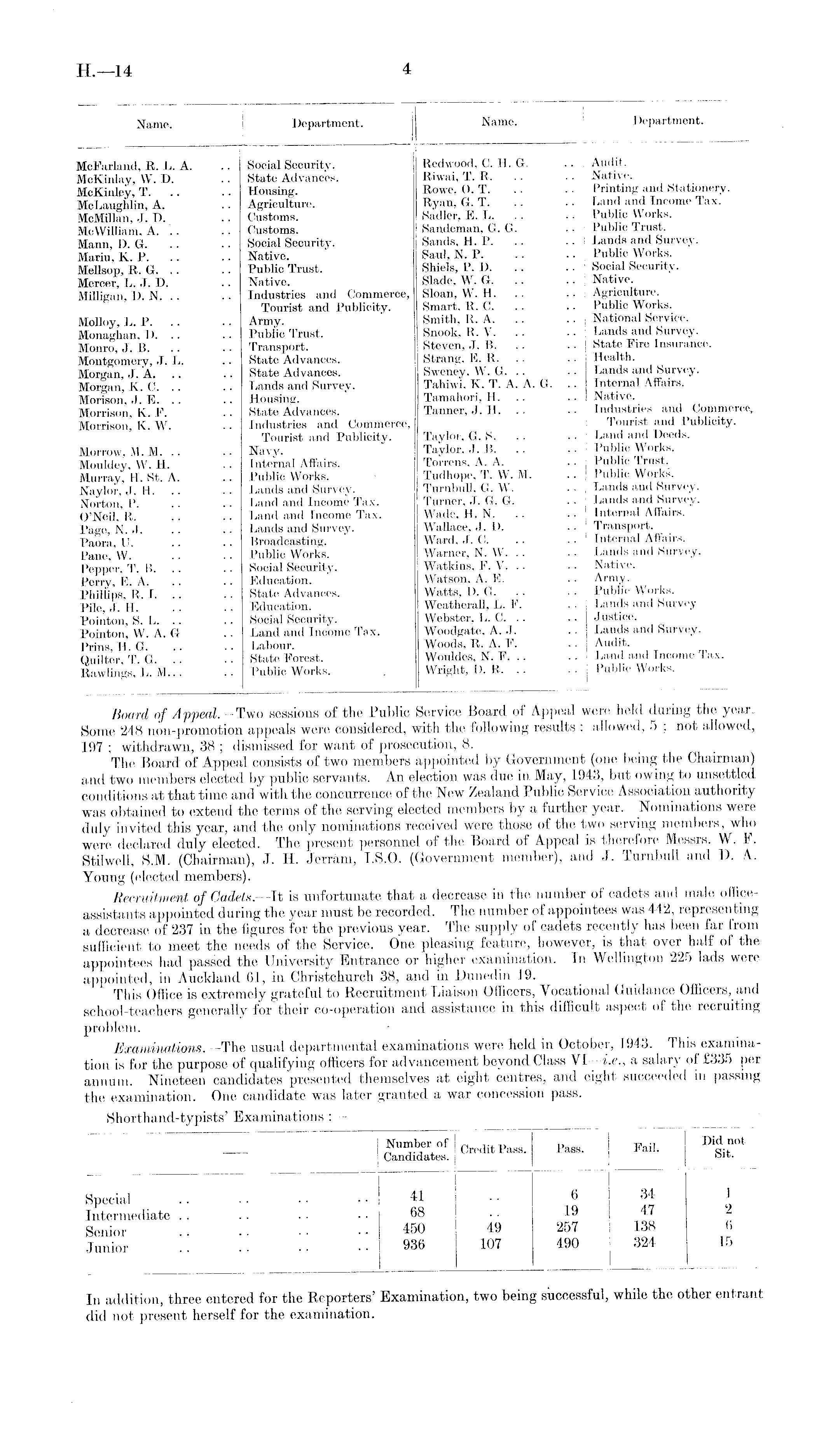 Name. ! Department. Name. i Department. McFarland, R. L. A. .. Social Security. Redwood, C. H. G. .. I Audit. McKinlay, W. D. • • State Advances. Riwai, T. R. .. .. Native. McKinley, T. .. .. Housing. Rowe, 0. T. .. .. Printing and Stationery. McLaughlin, A. .. Agriculture. Ryan, G. T. .. .. Land and Income Tax. McMillan, J. D. .. Customs. Sadler, E. L. . . .. Public Works. McWilliam A .. .. Customs. Sandeman, G. G. .. Public Trust. Mann, D. G. .. .. Social Security. Sands, H. P. .. .. Lands and Survey. Mariu, K. P. .. .. Native. Saul, N. P. .. .. Public Works. Mellsop, R. G. .. .. Public Trust. Shiels, P. D. .. .. Social Security. Mercer, L. J. D. .. Native. Slade, W. G. .. .. i Native. Milligan, D. N. .. .. Industries and Commerce, Sloan, W. H. .. .. I Agriculture. Tourist and Publicity. Smart, R. C. .. •. [ Public Works. Molloy L. P. .. .. Army. Smith, R. A. .. .. National Service. Monaghaii, t>. !. .. Public Trust. Snook, R. V. .. .. Lands and Survey. Monro, J. B. .. .. Transport. Steven, J. B. .. .. State Fire Insurance. Montgomery, J. L. .. State Advances. Strang, E. R. .. .. Health. Morgan, ,T. A. .. .. State Advances. Sweney, W. G. .. .. Lands and Survey. Morgan, K. C. .. .. Lands and Survey. Tahiwi, K. T. A. A. G. .. Internal Affairs. Morison, J. E. .. .. Housing. Tamahori, H. .. .. Native. Morrison, K. F. .. State Advances. Tanner, J. H. .. .. | Industries and Commerce, Morrison, K. W. .. Industries and Commerce, Tourist and Publicity. Tourist and Publicity. Taylor, G. S. .. .. Land and Deeds. Morrow, M. M Navy. Taylor, J. B j Public Works. Mouldey, W. H. .. Internal Affairs. Torrens, A. A. .. Public Trust. Murray H St A. .. Public Works. Tudhope, T. W. M. .. Public Works. Nay lor, J. H. .. .. Lands and Survey. Turnbull, G. W. .. Lands and Survey. Norton P. .. .. Land and Income Tax. Turner, J. G. G. .. Lands and Survey. O'Neil.'R. .. .. Land and Income Tax. Wade, H. N. .. .. Internal Affairs. Page, N. J. .. .. Lands and Survey. Wallace, J. D. .. Transport. Paora, U. .. .. Broadcasting. Ward, J. C. .. • • Internal Affairs. Pane, W. .. . • Public Works. Warner, N. W. .. .. j Lands and Survey. Pepper, T. B. .. Social Security. Watkins, F. V. .. .. j Native. Perry, E. A. .. .. Education. ' Watson, A. E. .. | Army. Phillips, R. T. .. .. State Advances. Watts, I). G. .. . . Public Works. Pile, J. H. .. .. Education. Weatherall, L. F. . . Lands and Survey Pointon, S. L. .. . . Social Security. Webster, L. C. .. . ■ Justice. Pointon, W. A. G .. Land and Income Tax. Woodgate, A. J. .. Lands and Survey. Prins, H.G. .. .. Labour. Woods, R. A. F. .. Audit. Quilter T. G. .. - • State Forest. Wouldes, N. F. .. .. Land and Income Tax. Rawlings, L. M.. . . . Public Works. . Wright, D. R. .. .. Public Works.
