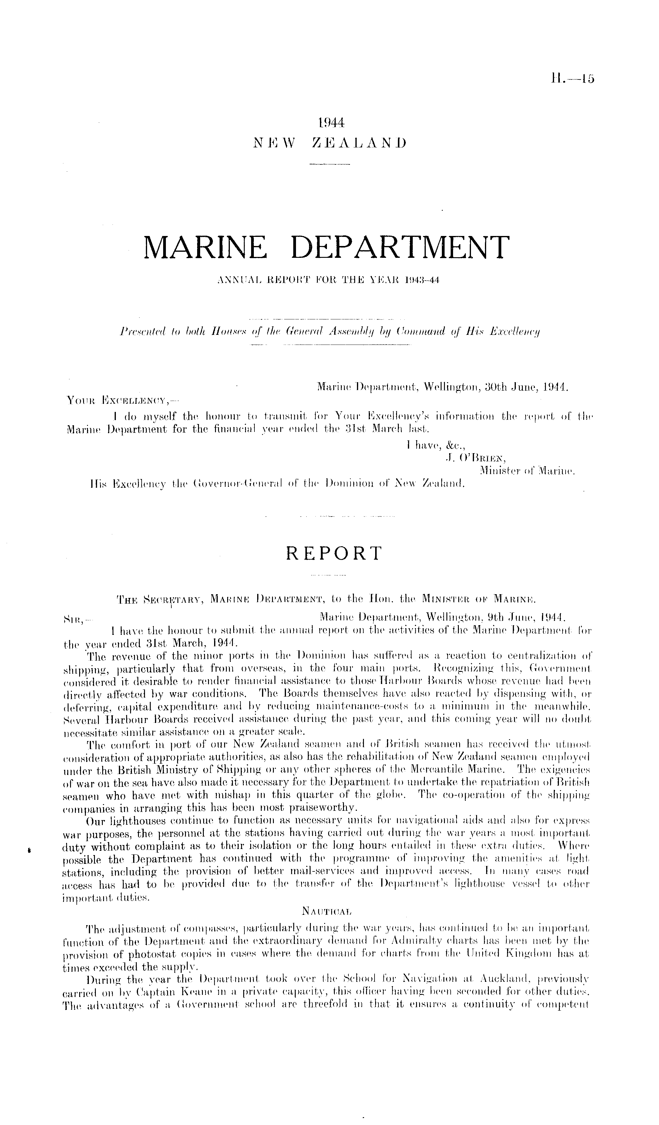 REPORT The Secretary, Marine Department, to the Hon. the Minister of Marine. Kir, Marine Department, Wellington, 9th June, 1944. ■ 1 have the honour to submit the annual report on the aetivities of the Marine Department for the year ended 31st March, 1944. The revenue of the minor ports in the Dominion has suffered as a reaction to centralization of shipping, particularly that from overseas, in the four main ports. Recognizing this, Government considered it desirable to render financial assistance to those Harbour Boards whose revenue had been directly affected by war conditions. The Boards themselves have also reacted by dispensing with, or deferring, capital expenditure and by reducing maintenance-costs to a minimum in the meanwhile. Several Harbour Boards received assistance during the past year, and this coming year will no doubt necessitate similar assistance on a greater scale. The comfort in port of our New Zealand seamen and of British seamen has received the utmost consideration of appropriate authorities, as also has the rehabilitation of New Zealand seamen employed under the British Ministry of Shipping or any other spheres of the Mercantile Marine. The exigencies of war on the sea have also made it necessary for the Department to undertake the repatriation of British seamen who have met with mishap in this quarter of the globe. The co-operation of the shipping companies in arranging this has been most praiseworthy. Our lighthouses continue to function as necessary units for navigational aids and also for express war purposes, the personnel at the stations having carried out during the war years a most important duty without complaint as to their isolation or the long hours entailed in these extra duties. Where possible the Department has continued with the programme of improving the amenities at light stations, including the provision of better mail-services and improved access. In many cases road access has had to be provided due to the transfer of the Department's lighthouse vessel to other important duties. Nautical The adjustment of compasses, particularly during the war years, has continued to be an important function of the Department and the extraordinary demand for Admiralty charts has been met by the provision of photostat copies in cases where the demand for charts from the United Kingdom has at times exceeded the supply. During the year the Department took over the School for Navigation at Auckland, previously carried on by Captain Keane in a private capacity, this officer having been seconded for other duties. The advantages of a Government school are threefold in that it ensures a continuity of competent