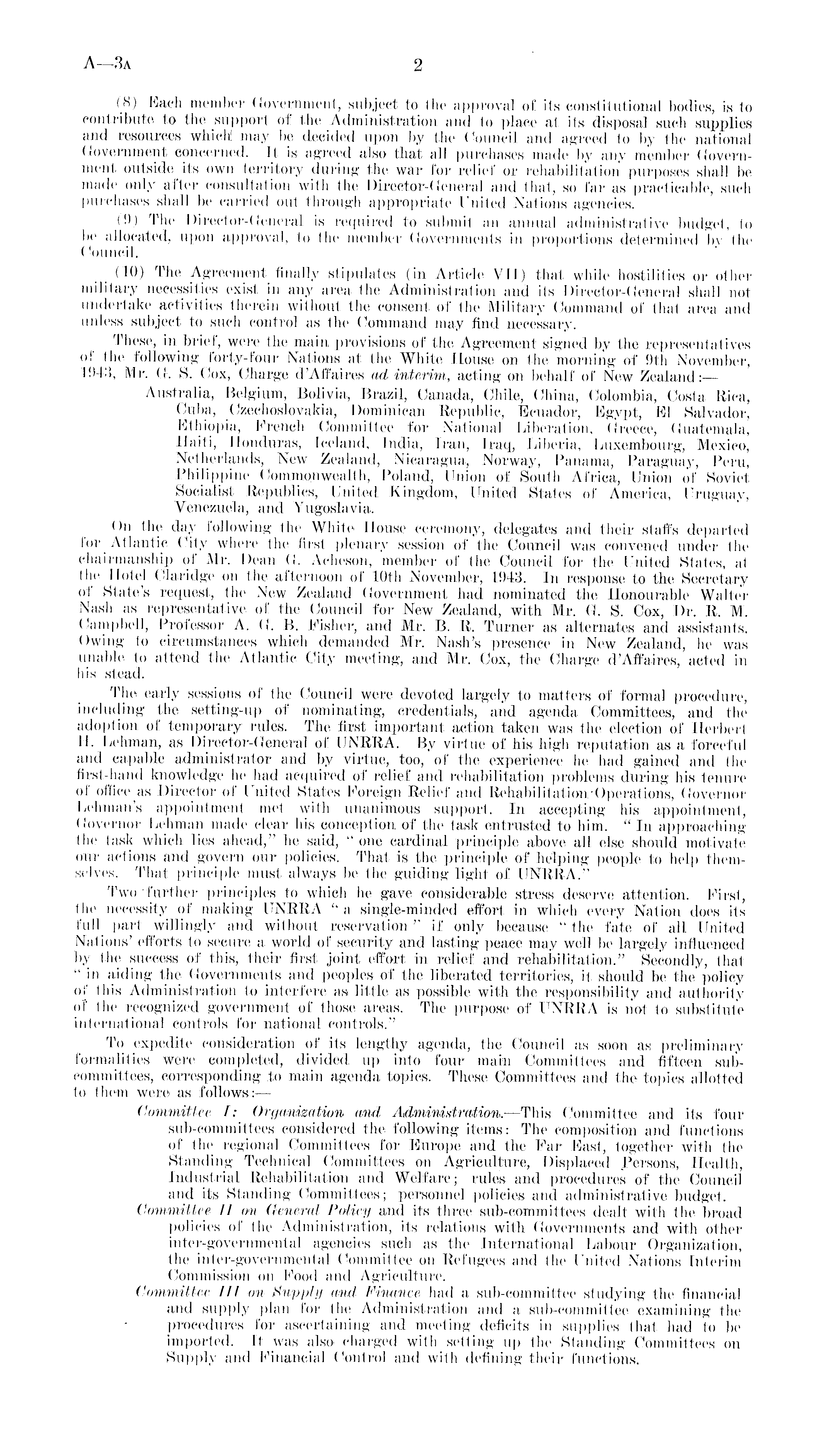 (8) Each member Government, subject to the approval of its constitutional bodies, is to contribute to the support of the Administration and to place at its disposal such supplies and resources which! may be decided upon by the Council and agreed to by the national Government concerned. It is agreed also that all purchases made by any member Government outside its own territory during the war for relief or rehabilitation purposes shall be made only after consultation with the Director-General and that, so far as practicable, such purchases shall be carried out through appropriate United Nations agencies. (9) The .Director-General is required to submit an annual administrative budget, to be allocated, upon approval, to the member Governments in proportions determined by the Council. (10) The Agreement finally stipulates (in Article VII) that while hostilities or other military necessities exist in any area the Administration and its Director-General shall not undertake activities therein without the consent of the Military Command of that area and unless subject to such control as the Command may find necessary. These, in brief, were the main, provisions of the Agreement signed by the representatives of the following forty-four Nations at the White House on the morning of 9th November, 1943, Mr. G. S. Cox, Charge dAffaires ad interim, acting on behalf of New Zealand:— Australia, Belgium, Bolivia, Brazil, Canada, Chile, China, Colombia, Costa Rica, Cuba, Czechoslovakia, Dominican Republic, Ecuador, Egypt, El Salvador, Ethiopia, French Committee for National Liberation, Greece, Guatemala, Haiti, Honduras, Iceland, India, Iran, Iraq, Liberia, Luxembourg, Mexico, Netherlands, New Zealand, Nicaragua, Norway, Panama, Paraguay, Peru, Philippine Commonwealth, Poland, Union of South Africa, Union of Soviet Socialist Republics, United Kingdom, United States of America, Uruguay, Venezuela, and Yugoslavia. On the day following the White House ceremony, delegates and their staffs departed for Atlantic City where the first plenary session of the Council was convened under the chairmanship of Mr. Dean G. Acheson, member of the Council for the United States, at the Hotel Claridge on the afternoon of 10th November, 1943. In response to the Secretary of State's request, the New Zealand Government had nominated the Honourable Walter Nash as representative of the Council for New Zealand, with Mr. G. S. Cox, Dr. R. M. Campbell, Professor A. G. B. Fisher, and Mr. B. R. Turner as alternates and assistants. Owing to circumstances which demanded Mr. Nash's presence in New Zealand, he was unable to attend the Atlantic City meeting, and Mr. Cox, the Charge d'Affaires, acted in his stead. The early sessions of the Council were devoted largely to matters of formal procedure, including the setting-up of nominating, credentials, and agenda Committees, and the adoption of temporary rules. The first important action taken was the election of Herbert H. Lehman, as Director-General of UNRRA. By virtue of his high reputation as a forceful and capable administrator and by virtue, too, of the experience he had gained and the first-hand knowledge he had acquired of relief and rehabilitation problems during his tenure of office as Director of United States Foreign Relief and Rehabilitation-Operations, Governor Lehman's appointment met with unanimous support. In accepting his appointment, Governor Lehman made clear his conception of the task entrusted to him. "In approaching the task which lies ahead," lie said, " one cardinal principle above all else should motivate our actions and govern our policies. That is the principle of helping people to help themselves, That principle must always be the guiding light of UNRRA." Two 'further principles to which he gave considerable stress deserve attention. First, the necessity of making UNRRA " a single-minded effort in which eveiy Nation does its full part willingly and without reservation" if only because " the fate of all United Nations' efforts to secure a world of security and lasting peace may well lie largely influenced by the success of this, their first joint effort in relief and rehabilitation." Secondly, that " in aiding the Governments and peoples of the liberated territories, it should be the' policy of this Administration to interfere as little as possible with the responsibility and authority of the recognized government of those areas. The purpose of UNRRA is not to substitute international controls for national controls." To expedite consideration of its lengthy agenda, the Council as soon as preliminary formalities were completed, divided up into four main Committees and fifteen subcommittees, corresponding .to main agenda topics. These Committees and the topics allotted to them were as follows:— Committee I: Organization and Administration. —This Committee and its four sub-committees considered the following items: The composition and functions of the regional Committees for Europe and the Far East, together with the Standing Technical Committees on Agriculture, Displaced Persons, Health, Industrial Rehabilitation and Welfare; rules and procedures of the Council and its Standing Committees; personnel policies and administrative budget. Committee II on General Policy and its three sub-committees dealt with the broad policies of the Administration, its relations with Governments and with other inter-governmental agencies such as the International Labour Organization, the inter-governmental Committee on Refugees and the United Nations Interim Commission on Food and Agriculture. Committee 111 on Supply and Finance had a sub-committee studying the financial and supply plan for the Administration and a sub-committee examining the procedures for ascertaining and meeting deficits in supplies that, had to be imported. It was also charged with setting up the Standing Committees on Supply and Financial Control and with defining their functions.