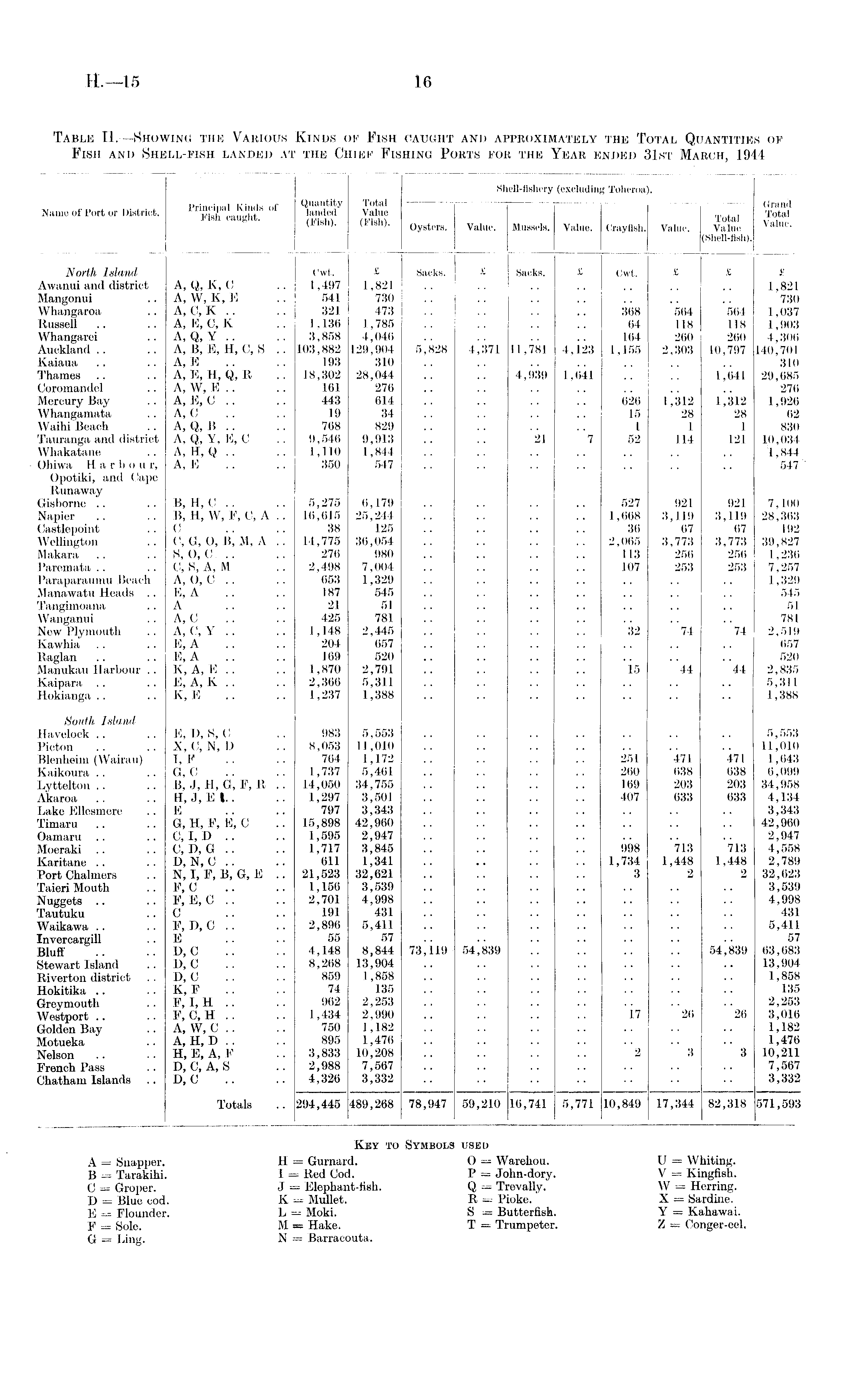 Key to Symbols used A = Snapper. H = Gurnard. 0 = Warehou. U = Whiting. B = Tarakihi. I = Bed Cod. P = John-dory. V = Kingfish. C = Groper. J = Elephant-fish. Q = Trevally. W = Herring. D = Blue cod. K = Mullet. R = Pioke. X = Sardine. E = Flounder. L = Moki. S = Butterfish. Y = Kahawai. F = Sole. M m Hake. T = Trumpeter. Z = Conger-eel, G = Ling. N = Barracouta.