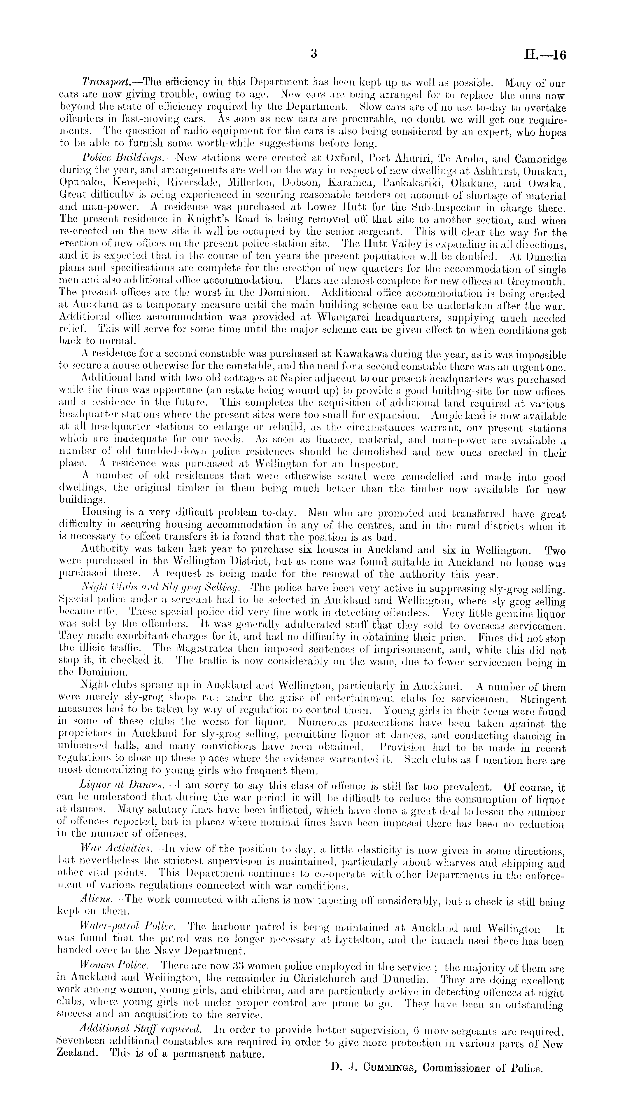 Transport.—-The efficiency in this Department has been kept up as well as possible. Many of our cars are now giving trouble, owing to age. New cars are being arranged for to replace the ones now beyond the state of efficiency required by the Department. Slow cars are of no use to-day to overtake offenders in fast-moving cars. As soon as new cars are procurable, no doubt we will get our requirements. The question of radio equipment for the cars is also being considered by an expert, who hopes to be able to furnish some worth-while suggestions before long. Police Buildings.—New stations were erected at Oxford, Port Ahuriri, Te Aroha, and Cambridge during the year, and arrangemeuts are well on the way in respect of new dwellings at Ashhurst, Omakau, Opunake, Kerepehi, Riversdale, Millerton, Dobson, Karainea, Paekakariki, Ohakune, and Owaka. Great difficulty is being experienced in securing reasonable tenders on account of shortage of material and man-power. A residence was purchased at Lower Ilutt for the Sub-Inspector in charge there. The present residence in Knight's Road is being removed off that site to another section, and when re-erected on the new site it will be occupied by the senior sergeant. This will clear the way for the erection of new offices on the present police-station site. The Hutt Valley is expanding in all directions, and it is expected that in the course of ten years the present population will be doubled. At Dunedin plans and specifications are complete for the erection of new quarters for the accommodation of single men and also additional office accommodation. Plans are almost complete for new offices at Greyinouth. The present offices are the worst in the Dominion. Additional office accommodation is being erected at Auckland as a temporary measure until the main building scheme can be undertaken after the war. Additional office accommodation was provided at Whangarei headquarters, supplying much needed relief. This will serve for some time until the major scheme can be given effect to when conditions get back to normal. A residence for a second constable was purchased at Kawakawa during the year, as it was impossible to secure a house otherwise for the constable, and the need for a second constable there was an urgent one. Additional land with two old cottages at Napier adjacent to our present headquarters was purchased while the time was opportune (an estate being wound up) to provide a good building-site for new offices and a residence in the future. This completes the acquisition of additional land required at various headquarter stations where the present sites were too small for expansion. Ample land is now available at all headquarter stations to enlarge or rebuild, as the circumstances warrant, our present stations which are inadequate for our needs. As soon as finance, material, and man-power are available a number of old tumbled-down police residences should be demolished and new ones erected in their place. A residence was purchased at Wellington for an Inspector. A number of old residences that were otherwise sound were remodelled and made into good dwellings, the original timber in them being much better than the timber now available for new buildings. Housing is a very difficult problem to-day. Men who are promoted and transferred have great difficulty in securing housing accommodation in any of the centres, and in the rural districts when it is necessary to effect transfers it is found that the position is as bad. Authority was taken last year to purchase six houses in Auckland and six in Wellington. Two were purchased in the Wellington District, but as none was found suitable in Auckland no house was purchased there. A request is being made for the renewal of the authority this year. N-iyht Clubs and Sly-grog Selling.—The police have been very active in suppressing sly-grog selling. Special police under a sergeant had to be selected in Auckland and Wellington, where sly-grog selling became rife. These special police did very fine work in detecting offenders. Very little genuine liquor was sold by the offenders. It was generally adulterated stuff that they sold to overseas servicemen. They made exorbitant charges for it, and had no difficulty in obtaining their price. Fines did not stop the illicit traffic. The Magistrates then imposed sentences of imprisonment, and, while this did not stop it, it checked it. The traffic is now considerably on the wane, due to fewer servicemen being in the Dominion. Night clubs sprang up in Auckland and Wellington, particularly in Auckland. A number of them were merely sly-grog shops run under the guise of entertainment clubs for servicemen. Stringent measures had to be taken by way of regulation to control them. Young girls in their teens were found in some of these clubs the worse for liquor. Numerous prosecutions have been taken against the proprietors in Auckland for sly-grog selling, permitting liquor at dances, and conducting dancing in unlicensed halls, and many convictions have been obtained. Provision had to be made in recent regulations to close up these places where the evidence warranted it. Such clubs as I mention here are most demoralizing to young girls who frequent them. Liquor at Dances.—l am sorry to say this class of offence is still far too prevalent. Of course, it can be understood that during the war period it will be difficult to reduce the consumption of liquor at dances. Many salutary fines have been inflicted, which have done a great deal to lessen the number of offences reported, but in places where nominal fines have been imposed there has been no reduction in the number of offences. War Activities.—ln view of the position to-day, a little elasticity is now given in some directions, but nevertheless the strictest supervision is maintained, particularly about wharves and shipping and other vital points. This Department continues to co-operate with other Departments in the enforcem
