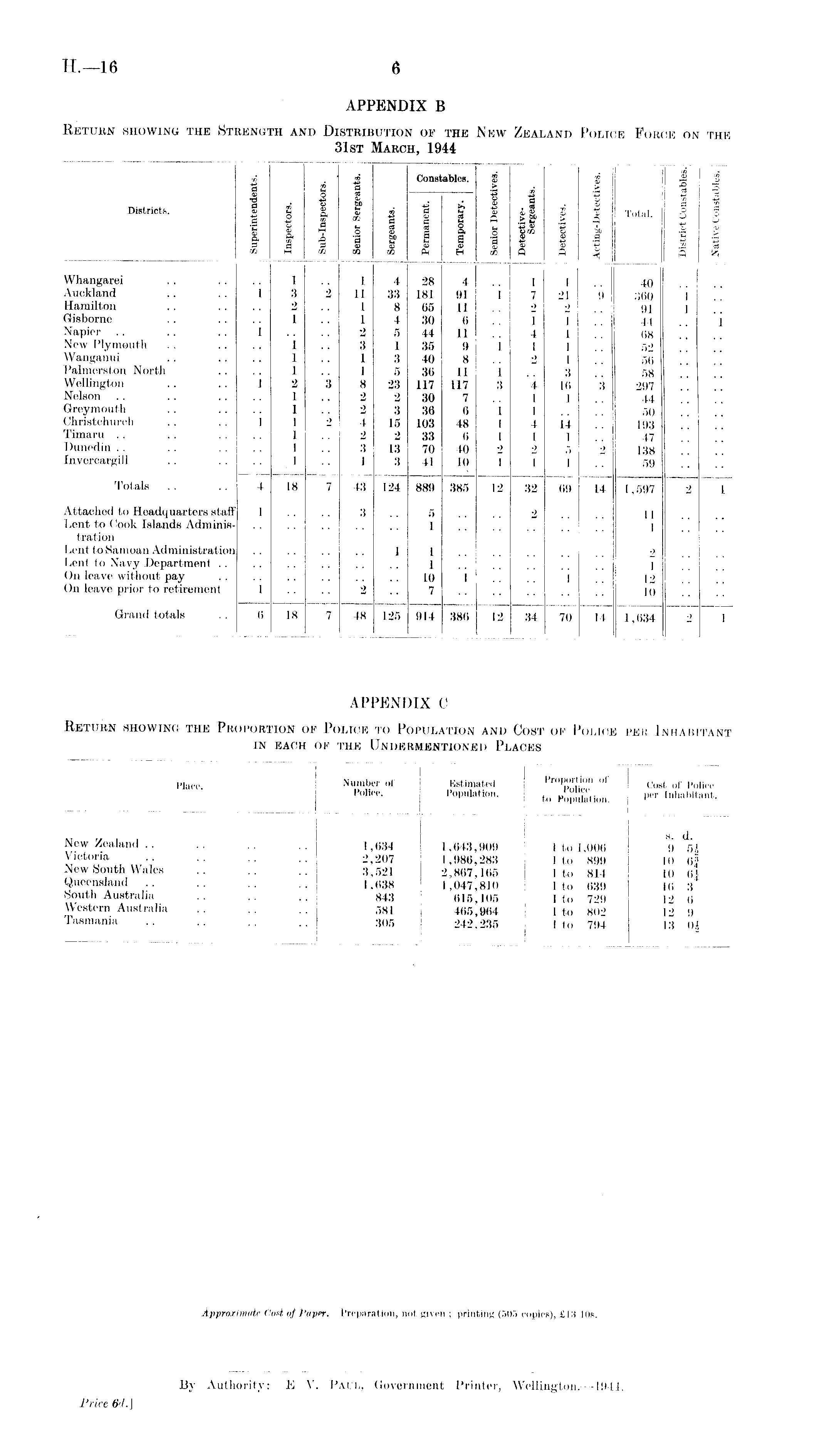 APPENDIX B Return showing the Strength and Distribution of the New Zealand Police Force on the 31st March, 1944