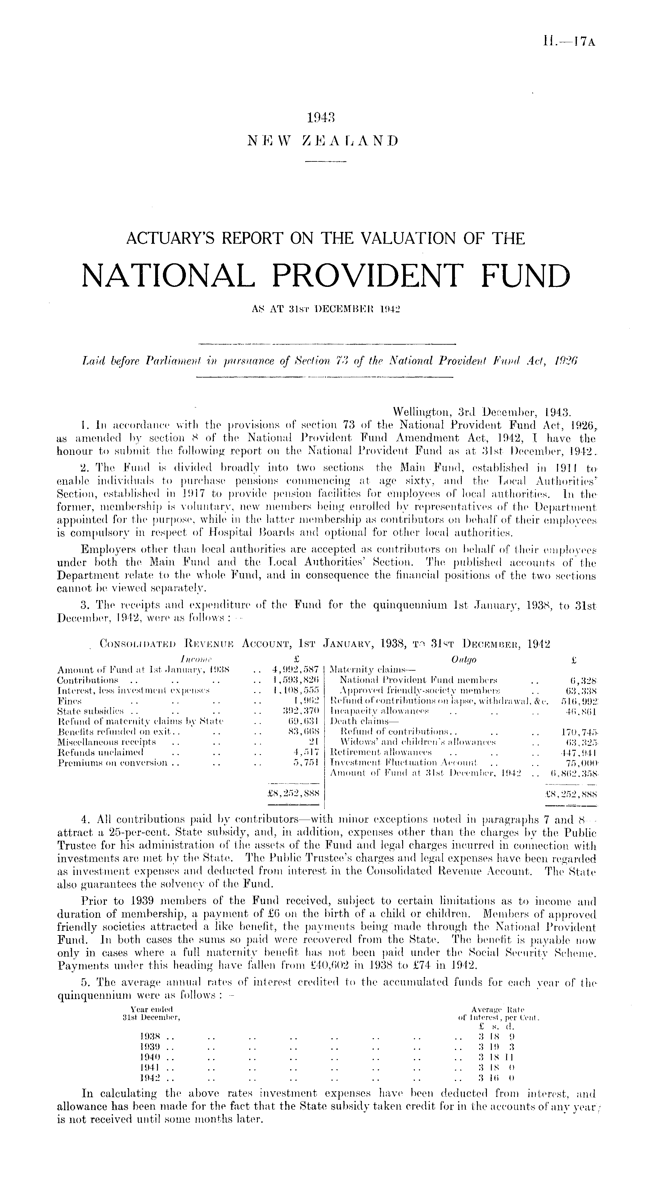 Wellington, 3rd December, 1943. 1. In accordance with the provisions of section 73-of the National Provident Fund Act, 1926, as amended by section 8 of the National Provident Fund Amendment Act, 1942, I have the honour to submit the following report on the National Provident Fund as at 31st December, 1942. 2. The Fund is divided broadly into two sections —the Main Fund, established in 1911 toenable individuals to purchase pensions commencing at age sixty, and the Local Authorities' Section, established in 1917 to provide pension facilities for employees of local authorities. In the former, membership is voluntary, new members being enrolled by representatives of the Department appointed for the purpose, while in the latter membership as contributors on behalf of their employees is compulsory in respect of Hospital Boards and optional for other local authorities. Employers other than local authorities are accepted as contributors on behalf of their employees under both the Main Fund and the Local Authorities' Section. The published accounts of the Department relate to the whole Fund, and in consequence the financial positions of the two sections cannot be viewed separately. 3. The receipts and expenditure of the Fund for the quinquennium Ist January, 1938, to 31st December, 1942, were as follows : — Consolidated Revenue Account, Ist January, 1938, T-"i 31st December, 1942 Income. £ Outgo £ Amount of Fund at Ist January, 1938 .. 4,992,587 Maternity claims— Contributions .. .. .. .. 1,598,826 National Provident Fund members .. 0,328 Interest, less investment expenses .. 1,108,355 Approved friendly-society members .. 63,338 Fines .. .. .. .. 1,962 Refund of contributions on lapse, withdrawal, &c. 510,992: State subsidies .. .. .. .. 392,370 Incapacity allowances .. .. .. 40,801 Refund of maternity claims by State .. 69.631 Death claims— Benefits refunded on exit.. .. .. 83,668 Refund of contributions.. .. .. 170,745' Miscellaneous receipts .. .. .. 21 Widows'and children's allowances .. 63,325 Refunds unclaimed .. .. .. 4,517 Retirement allowances .. .. .. 447,941 Premiums on conversion . . .. .. 5,751 Investment Fluctuation Account .. .. 76,000 Amount of Fund at 31st December, 1942 . . 6,802,358 £8,252,888 £8,252,888 4. All contributions paid by contributors —with minor exceptions noted in paragraphs 7 and 8— attract a 25-per-cent. State subsidy, and, in addition, expenses other than, the charges by the Public Trustee for his administration of the assets of the Fund and legal charges incurred in connection with investments are met by the State. The Public Trustee's charges and legal expenses have been regarded as investment expenses and deducted from interest in the Consolidated Revenue Account. The State also guarantees the solvency of the Fund. Prior to 1939 members of the Fund received, subject to certain limitations as to income and duration of membership, a payment of £6 on the birth of a child or children. Members of approved friendly societies attracted a like benefit, the payments being made through the National Provident Fund. In both cases the sums so paid were recovered from the State. The benefit is payable now only in cases where a full maternity benefit has not been paid under the Social Security Scheme. Payments under this heading have fallen from £40,602 in 1938 to £74 in 1942. 5. The average annual rates of interest credited to the accumulated funds for each year of the quinquennium were as follows : — Year ended Average Kate 31st December, of Interest, per Cent. £ s. d. 1938 .. .. .. .. .. .. .. 3 18 9 1939 .. .. .. .. .. .. .. .. 3 19 3 1940 .. .. .. .. .. .. .. ..31811 1941 .. .. .. .. .. .. .. 3 18 0 1942 .. .. .. .. .. .. .. .. 3 10 0 In calculating the above rates investment expenses have been deducted from interest, and allowance has been made for the fact that the State subsidy taken credit for in the accounts of any year) is not received until some months later.