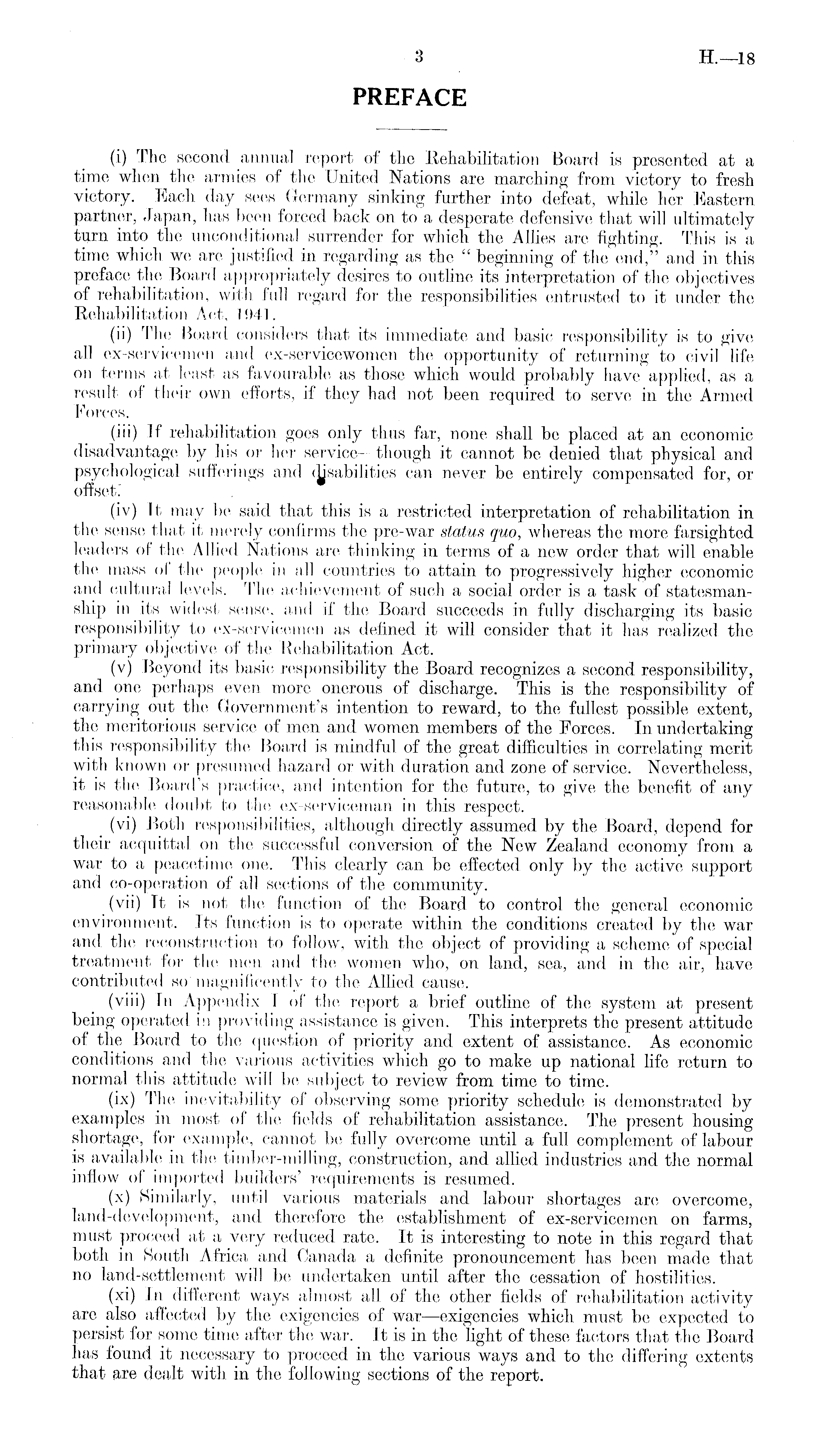 (i) The second annual report of the Rehabilitation Board is presented at a time when the armies of the United Nations are marching from victory to fresh victory. Each day sees Germany sinking further into defeat, while her Eastern partner, Japan, has been forced back on to a desperate defensive that will ultimately turn into the unconditional surrender for which the Allies are fighting. This is a time which we are justified in regarding as the " beginning of the end," and in this preface the Board appropriately desires to outline its interpretation of the objectives of rehabilitation, with full regard for the responsibilities entrusted to it under the Rehabilitation Act, 1941. (ii) The Board considers that its immediate and basic responsibility is to give all ex-servicemen and ex-servicewomen the opportunity of returning to civil life on terms at least as favourable as those which would probably have applied, as a result of their own efforts, if they had not been required to serve in the Armed Forces. (hi) If rehabilitation goes only thus far, none shall be placed at an economic disadvantage by his or her service—though it cannot be denied that physical and psychological sufferings and Usabilities can never be entirely compensated for, or offset* (iv) It may be said that this is a restricted interpretation of rehabilitation in the sense that it merely confirms the pre-war status quo, whereas the more farsighted leaders of the Allied Nations are thinking in terms of a new order that will enable the mass of the people in all countries to attain to progressively higher economic and cultural levels. The achievement of such a social order is a task of statesmanship in its widest sense, and if the Board succeeds in fully discharging its basic responsibility to ex-servicemen as defined it will consider that it has realized the primary objective of the Rehabilitation Act. (v) Beyond its basic responsibility the Board recognizes a second responsibility, and one perhaps even more onerous of discharge. This is the responsibility of carrying out the Government's intention to reward, to the fullest possible extent, the meritorious service of men and women members of the Forces. In undertaking this responsibility the Board is mindful of the great difficulties in correlating merit with known or presumed hazard or with duration and zone of service. Nevertheless, it is the Board's practice, and intention for the future, to give the benefit of any reasonable doubt to the ex-serviceman in. this respect. (vi) Both responsibilities, although directly assumed by the Board, depend for their acquittal on the successful conversion of the New Zealand economy from a war to a peacetime one. This clearly can be effected only by the active support and co-operation of all sections of the community. (vii) Tt is not the function of the Board to control the general economic environment. Its function is to operate within the conditions created by the war and the reconstruction to follow, with the object of providing a scheme of special treatment for the men and the women who, on land, sea, and in the air, have contributed so magnificently to the Allied cause. (viii) In Appendix I of the report a brief outline of the system at present being operated in providing assistance is given. This interprets the present attitude of the Board to the question of priority and extent of assistance. As economic conditions and the various activities which go to make up national life return to normal this attitude will be subject to review from time to time. (ix) The inevitability of observing some priority schedule; is demonstrated by examples in most of the fields of rehabilitation assistance. The present housing shortage, for example, cannot be fully overcome until a full complement of labour is available in the timber-milling, construction, and allied industries and the normal inflow of imported builders' requirements is resumed. (x) Similarly, until various materials and labour shortages are overcome, land-development, and therefore the establishment of ex-servicemen on farms, must proceed at a very reduced rate. It is interesting to note in this regard that both in South Africa and Canada a definite pronouncement has been made that no land-settlement will be undertaken until after the cessation of hostilities. (xi) In different ways almost all of the other fields of rehabilitation activity are also affected by the exigencies of war—exigencies which must be expected to persist for some time after the war. It is in the light of these factors that the Board has found it necessary to proceed in the various ways and to the differing extents that are dealt with in the following sections of the report.