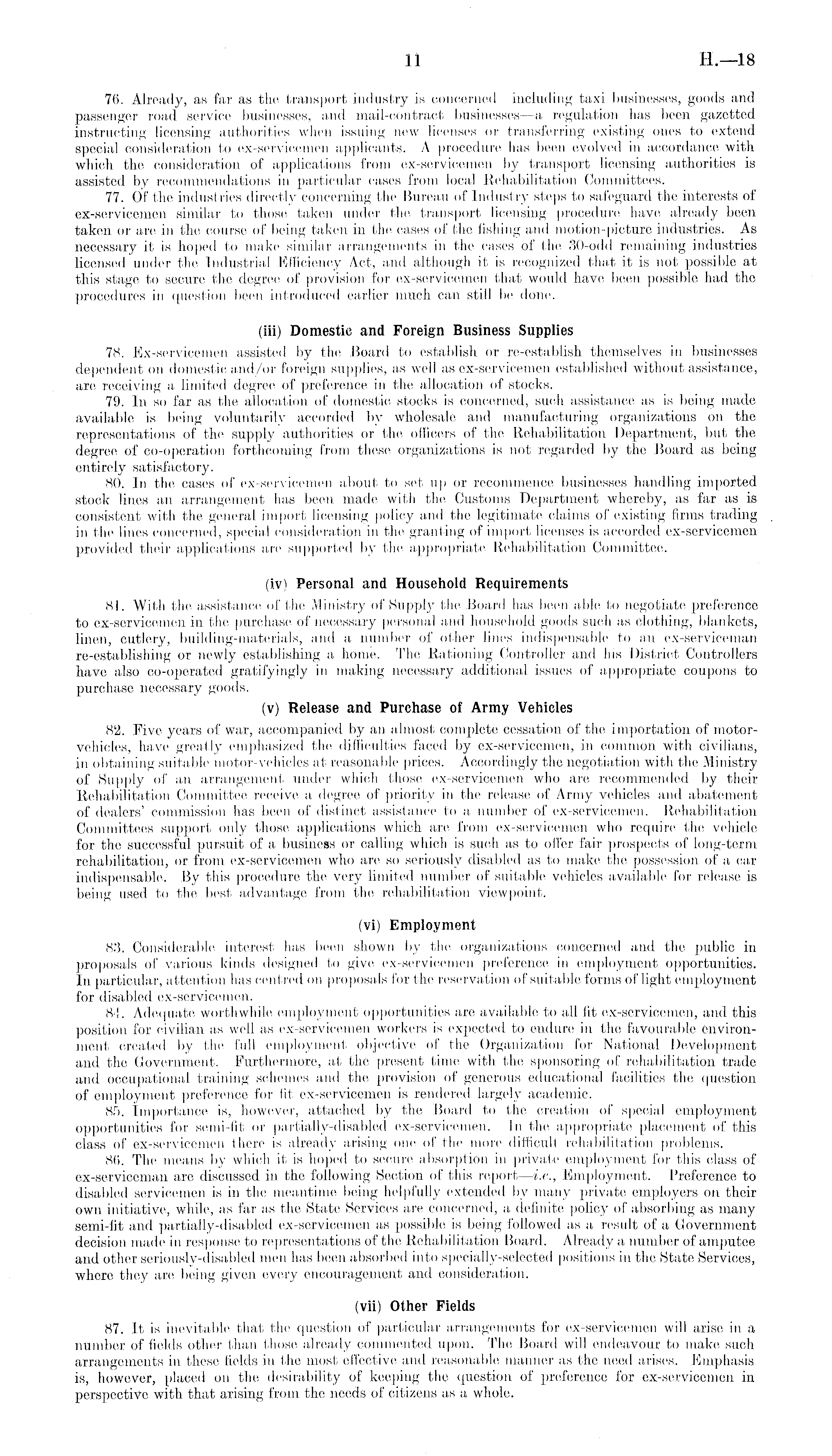 76. Already, as far as the transport industry is concerned including taxi businesses, goods and passenger road -service businesses, and mail-contract businesses —a regulation has been gazetted instructing licensing authorities when issuing new licenses or transferring existing ones to extend special consideration to ex-servicemen applicants. A procedure has been evolved in accordance with which the consideration of applications' from ex-servicemen by transport licensing authorities is assisted by recommendations in particular cases from local Rehabilitation Committees. 77. Of the industries directly concerning the Bureau of Industry steps to safeguard the interests of ex-servicemen similar to those taken under the transport licensing procedure have already been taken or are in the course of being taken in the cases of the fishing and motion-picture industries. As necessary it is hoped to make similar arrangements in the cases of the 30-odd remaining industries licensed under the Industrial Efficiency Act, and although it is recognized that it is not possible at this stage to secure the degree of provision for ex-servicemen that would have been possible had the procedures in question been introduced earlier much can still be done. (iii) Domestic and Foreign Business Supplies 78. Ex-servicemen assisted by the Board to establish or re-establish themselves in businesses dependent on domestic and/or foreign supplies, as well as ex-servicemen established without assistance, are receiving a limited degree of preference in the allocation of stocks. 79. In so far as the allocation of domestic stocks is concerned, such assistance as is being made available is being voluntarily accorded by wholesale and manufacturing organizations on the representations of the supply authorities or the officers of the Rehabilitation Department, but the degree of co-operation forthcoming from these organizations is not regarded by the Board as being entirely satisfactory. 80. In the cases of ex-servicemen about to set up or recommence businesses handling imported stock lines an arrangement has been made with the Customs Department whereby, as far as is consistent with the general import licensing policy and the legitimate claims of existing firms trading in the lines concerned, special consideration in the granting of import licenses is accorded ex-servicemen provided their applications are supported by the appropriate Rehabilitation Committee. (iv) Personal and Household Requirements 81. With the assistance of the Ministry of Supply the Board has been able to negotiate preference to ex-servicemen in the purchase of necessary personal and household goods such as clothing, blankets, linen, cutlery, building-materials, and a number of other lines indispensable to an ex-serviceman re-establishing or newly establishing a home. The Rationing Controller and his District Controllers have also co-operated gratifyingly in making necessary additional issues of appropriate coupons to purchase necessary goods. (v) Release and Purchase of Army Vehicles 82. Five years of war, accompanied by an almost complete cessation of the importation of motorvehicles, have greatly emphasized the difficulties faced by ex-servicemen, in common with civilians, in obtaining suitable motor-vehicles at reasonable prices. Accordingly the negotiation with the Ministry of Supply of an arrangement under which those ex-servicemen who are recommended by their Rehabilitation Committee receive a degree of priority in the release of Army vehicles and abatement of dealers' commission has been of distinct assistance to a number of ex-servicemen. Rehabilitation Committees support only those applications which are from ex-servicemen who require the vehicle for the successful pursuit of a business or calling which is such as to offer fair prospects of long-term rehabilitation, or from ex-servicemen who are so seriously disabled as to make the possession of a car indispensable. By this procedure the very limited number of suitable vehicles available for release is being used to the best advantage from the rehabilitation viewpoint. (vi) Employment 83. Considerable interest has been shown by the organizations concerned and the public in proposals of various kinds designed to give ex-servicemen preference in employment opportunities. In particular, attention has centred on proposals for the reservation of suitable forms of light employment for disabled ex-servicemen. 84. Adequate worthwhile employment opportunities are available to all fit ex-servicemen, and this position for civilian as well as ex-servicemen workers is expected to endure in the favourable environment created by the full employment objective of the Organization for National Development and the Government. Furthermore, at the present time with the sponsoring of rehabilitation trade and occupational training schemes and the provision of generous educational facilities the question of employment preference for fit ex-servicemen is rendered largely academic. 85. Importance is, however, attached by the Board to the creation of special employment opportunities for semi-fit or partially-disabled ex-servicemen. In the appropriate placement of this class of ex-servicemen there is already arising one of the more difficult rehabilitation problems. 86. The means by which it is hoped to secure absorption in private employment for this class of ex-serviceman are discussed in the following Section of this report—i.e., Employment. Preference to disabled servicemen is in the meantime being helpfully extended by many private employers on their own initiative, while, as far as the State Services are concerned, a definite policy of absorbing as many semi-fit and partially-disabled ex-servicemen as possible is being followed as a result of a Government decision made in response to representations of the Rehabilitation Board. Already a number of amputee and other seriously-disabled men. has been absorbed into special