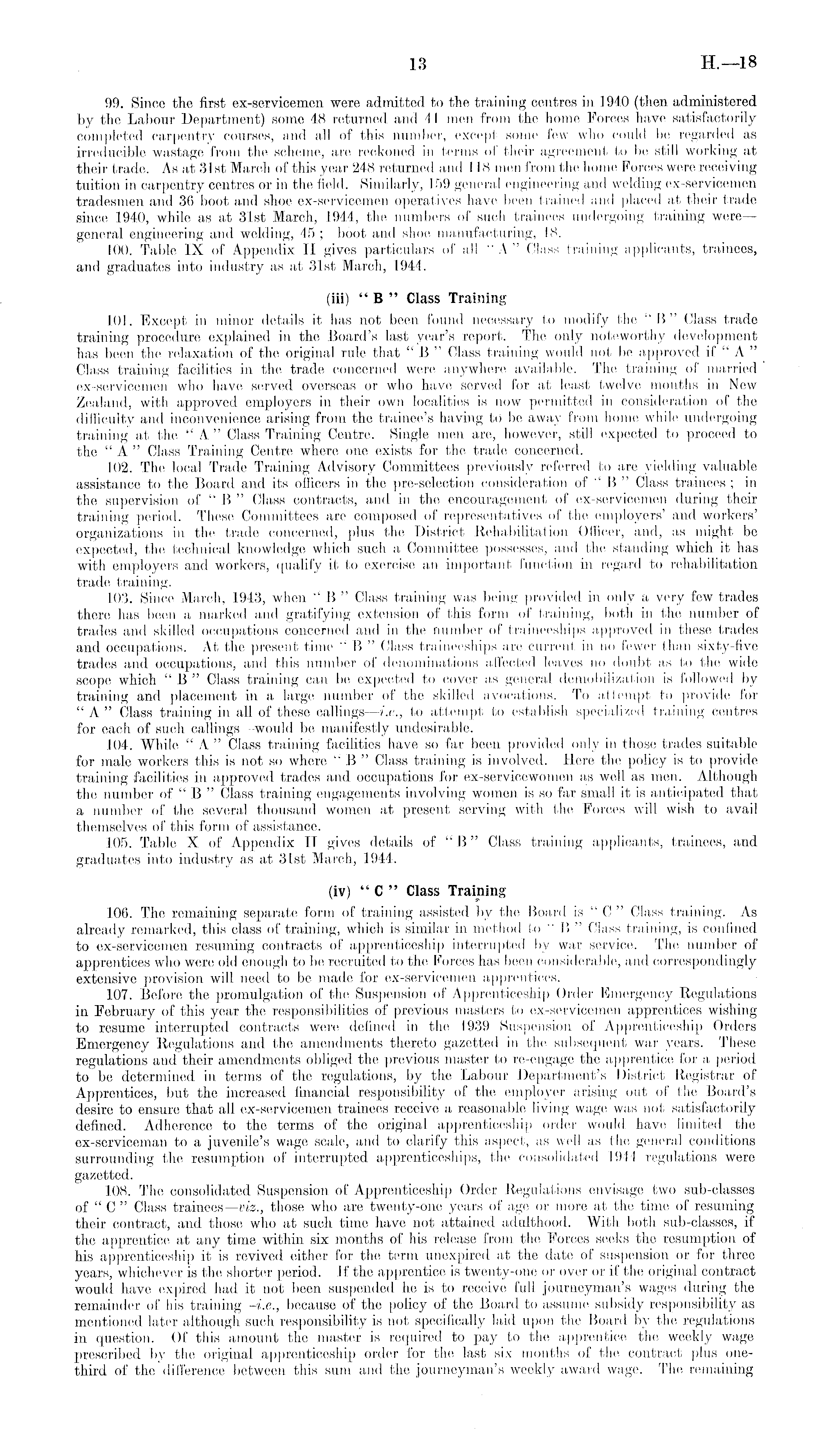99. Since the first ex-servicemen were admitted to the training centres in 1940 (then administered by the Labour Department) some 48 returned and 41 men from the home Forces have satisfactorily completed carpentry courses, and all of this number, except some few who could be regarded as irreducible wastage from the scheme, are reckoned in terms of their agreement to be still working at their trade. As at 31st March of this year 248 returned and 118 men from the home Forces were receiving tuition in carpentry centres or in the field. Similarly, 159 general engineering and welding ex-servicemen tradesmen and 36 boot and shoe ex-servicemen operatives have been trained and placed at their trade since 1940, while as at 31st March, 1944, the numbers of such trainees undergoing training were— general engineering and welding, 45 ; boot and shoo manufacturing, 18. 100. Table IX of Appendix II gives particulars of all " A " Class training applicants, trainees, and graduates into industry as at 31st March, 1944. (iii) " B " Class Training 101. Except in minor details it has not been found necessary to modify the "B " Class trade training procedure explained in the Board's last year's report. The only noteworthy development has been the relaxation of the original rule that " B " Class training would not be approved if " A " Class training facilities in the trade concerned were anywhere available. The training of married ex-servicemen who have served overseas or who have served for at least twelve months in New Zealand, with approved employers in their own localities is now permitted in consideration of the difficulty and inconvenience arising from the trainee's having to be away from home while undergoing training at the "A " Class Training Centre. Single men are, however, still expected to proceed to the " A " Class Training Centre where one exists for the trade concerned. 102. The local Trade Training Advisory Committees previously referred to are yielding valuable assistance to the Board and its officers in the pre-selection consideration of " B " Class trainees ; in the supervision of " B " Class contracts, and in the encouragement of ex-servicemen during their training period. These Committees are composed of representatives of the employers' and workers' organizations in the trade concerned, plus the District Rehabilitation Officer, and, as might be expected, the technical knowledge which such a Committee possesses, and the standing which it has with employers and workers, qualify it to exercise an important function in regard to rehabilitation trade training. 103. Since March, 1943, when " B " Class training was being provided in only a very few trades there has been a marked and gratifying extension of this form of training, both in the number of trades and skilled occupations concerned and in the number of traineeships approved in. these trades and occupations. At the present time "B " Class traineeships are current in no fewer than sixty-five trades and occupations, and this number of denominations affected leaves no doubt as to the wide scope which " B " Class training can be expected to cover as general demobilization is followed by training and placement in a large number of the skilled avocations. To attempt, to provide for " A " Class training in all of these callings —i.e., to attempt to establish specialized training centres for each of such callings would be manifestly undesirable. 104. While " A " Class training facilities have so far been provided only in those trades suitable for male workers this is not so where "B " Class training is involved. Here the policy is to provide training facilities in approved trades and occupations for ex-servicewomen as well as men. Although the number of " B " Class training engagements involving women is so far small it is anticipated that a number of the several thousand women at present serving with the Forces will wish to avail themselves of this form of assistance. 105. Table X of Appendix II gives details of "B" Class training applicants, trainees, and graduates into industry as at 31st March, 1944. (iv) " C " Class Training 106. The remaining separate form of training assisted by the Board is "C " Class training. As already remarked, this class of training, which is similar in method to " B " Class training, is confined to ex-servicemen resuming contracts of apprenticeship interrupted by war service. The number of apprentices who were old enough to be recruited to the Forces has been considerable, and correspondingly extensive provision will need to be made for ex-servicemen apprentices. 107. Before the promulgation of the Suspension of Apprenticeship Order Emergency Regulations in February of this year the responsibilities of previous masters to ex-servicemen apprentices wishing to resume interrupted contracts were defined in the 1.939 Suspension of Apprenticeship Orders Emergency Regulations and the amendments thereto gazetted in the subsequent war years. These regulations and their amendments obliged the previous master to re-engage the apprentice for a period to be determined in terms of the regulations, by the Labour Department's District Registrar of Apprentices, but the increased financial responsibility of the employer arising out of the Board's desire to ensure that all ex-servicemen trainees receive a reasonable living wage was not satisfactorily defined. Adherence to the terms of the original apprenticeship order would have limited the ex-serviceman to a juvenile's wage scale, and to clarify this aspect, as well as the general conditions surrounding the resumption of interrupted apprenticeships, the consolidated 1944 regulations were gazetted. 108. The consolidated Suspension of Apprenticeship Order Regulations envisage two sub-classes of " C " Class trainees —viz., those who are twenty-one years of age or more at the time of resuming their contract, and those who at such time have not attained adulthood. With both, sub-cl