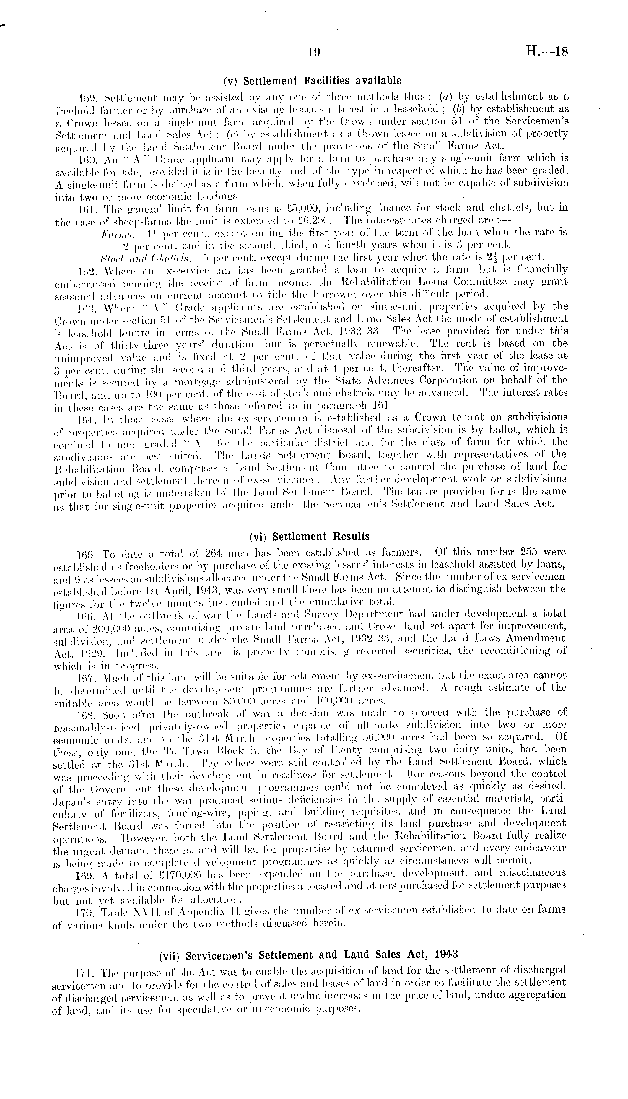 (v) Settlement Facilities available 159. Settlement may be assisted by any one of three methods thus : (a) by establishment as a freehold farmer or by purchase of an existing lessee's interest in a leasehold ; (b) by establishment as a Crown lessee on a single-unit farm acquired by the Crown under section 51 of the Servicemen's Settlement and Land Sales Act; (c) by establishment as a Crown lessee on a subdivision of property acquired by the Land Settlement Board under the provisions of the Small Farms Act. 160. An " A " Grade applicant may apply for a loan to purchase any single-unit farm which is available for sale, provided it is in the locality and of the type in respect of which he has been graded. A single-unit farm is defined as a farm which, when fully developed, will not be capable of subdivision into two or more economic holdings. 161. The general limit for farm loans is £5,000, including finance for stock and chattels, but in the case of sheep-farms the limit is extended to £6,250. The interest-rates charged are :— Farms. —4J per cent., except during the first year of the term of the loan when the rate is 2 per cent, and in the second, third, and fourth years when it is 3 per cent. Stock and Chattels. —5 per cent, except during the first year when the rate is 2f per cent. 162. Where an ex-serviceman has been granted a loan to acquire a farm, but is financially embarrassed pending the receipt of farm income, the Rehabilitation Loans Committee may grant seasonal advances on current account to tide the borrower over this difficult period. 163. Where " A " Grade applicants are established on single-unit properties acquired by the Crown under section 51 of the Servicemen's Settlement and Land Sales Act the mode of establishment is leasehold tenure in terms of the Small Farms Act, 1932 33. The lease provided for under this Act is of thirty-three years' duration, but is perpetually renewable. The rent is based on the unimproved vaiue and "is fixed at 2 per cent, of that value during the first year of the lease at 3 per cent, during the second and third years, and at 4 per cent, thereafter. The value of improvements is secured, by a mortgage administered by the State Advances Corporation on behalf of the Board, and up to 100 per cent, of the cost of stock and chattels may bo advanced. The interest rates in these cases are the same as those referred to in paragraph 161. 164. In those cases where the ex-serviceman is established as a Crown tenant on subdivisions of properties acquired under the Small Farms Act disposal of the subdivision is by ballot, which is confined to men graded " A " for the particular district and for the class of farm for which the subdivisions are best suited. The Lands Settlement Board, together with representatives of the Rehabilitation Board, comprises a Land Settlement Committee to control the purchase of land for subdivision and settlement thereon of ex-servicemen. Any further development work on subdivisions prior to balloting is undertaken by the Land Settlement Board. The tenure provided for is the same as that for single-unit properties acquired under the Servicemen's Settlement and Land Sales Act. (vi) Settlement Results 165. To date a total of 264 men has been established as farmers. Of this number 255 were established as freeholders or by purchase of the existing lessees' interests in leasehold assisted by loans, and 9as lessees on subdivisions allocated under the Small Farms Act. Since the number of ex-servicemen established before Ist April, 1943, was very small there has been no attempt to distinguish between the figures for the twelve months just ended and the cumulative total. 166. At the outbreak of war the Lands and Survey Department had under development a total area of 200,000 acres, comprising private land purchased and Crown land set apart for improvement, subdivision,' and settlement under the Small Farms Act, 1932-33, and the Land Laws Amendment Act, 1929. Included in this land is property comprising reverted securities, the reconditioning of which is in progress. 167. Much of this land will be suitable for settlement by ex-servicemen, but the exact area cannot be determined until the development programmes are further advanced. A rough estimate of the suitable area would be between 80,000 acres and 100,000 acrcs. 168. Soon after the outbreak of war a decision was made to proceed with the purchase of reasonably-priced privately-owned properties capable of ultimate subdivision into two or more economic units, and to the 31st March properties totalling 56,000 acres had been so acquired. Of these, only one, the Te Tawa Block in the Bay of Plenty comprising two dairy units, had been settled at the 31st March. The others were still controlled by the Land Settlement Board, which, was proceeding with their development in readiness for settlement For reasons beyond the control of the Government these development programmes could not be completed as quickly as desired. Japan's entry into the war produced serious deficiencies in the supply of essential materials, particularly of fertilizers, fencing-wire, piping, and building requisites, and in consequence the Land Settlement Board was forced into the position of restricting its land purchase and development operations. However, both the Land Settlement Board and the Rehabilitation Board fully realize the urgent demand there is, and will be, for properties, by returned servicemen, and every endeavour is being made to complete development programmes as quickly as circumstances will permit. 169. A total of £470,006 has been expended on the purchase, development, and miscellaneous charges involved in connection with the properties allocated and others purchased for settlement purposes but not yet available for allocation. 170. Table XVII of Appendix II gives the number of ex-servicemen established to date on farms of various kinds under the two methods discussed herein. (vii) Servicemen's Set