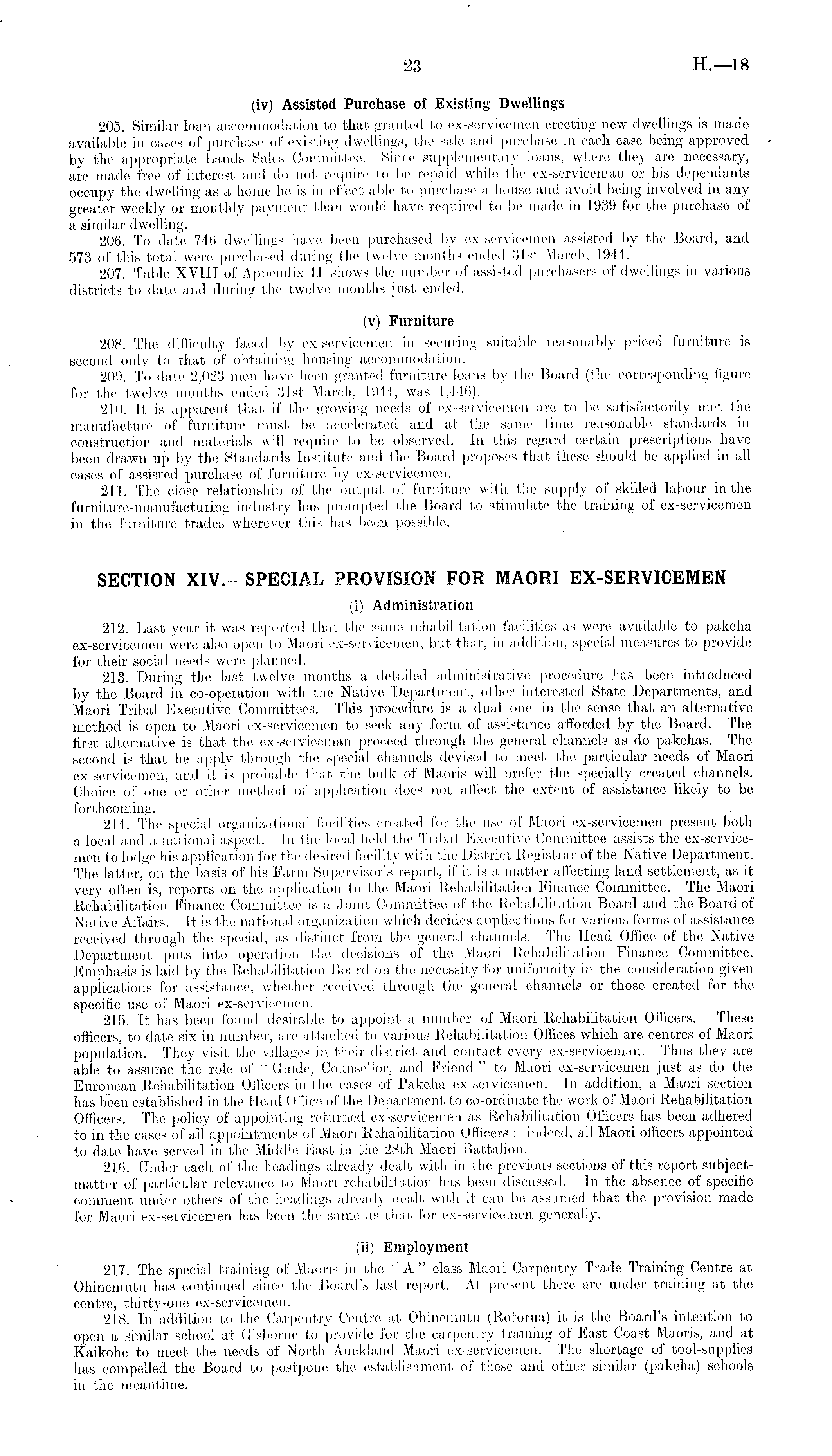 (iv) Assisted Purchase of Existing Dwellings 205. Similar loan accommodation to that granted to ex-servicemen erecting new dwellings is made available in cases of purchase of existing dwellings, the sale and purchase in each case being approved by the appropriate Lands Sales Committee. Since supplementary loans, where they are necessary, are made free of interest and do not require to be repaid while the ex-serviceman or his dependants occupy the dwelling as a home he is in effect able to purchase a house and avoid being involved in any greater weekly or monthly payment than would have required to be made in 1939 for the purchase of a similar dwelling. 206. To date 746 dwellings have been purchased by ex-servicemen assisted by the Board, and 573 of this total were purchased during the twelve months ended 31st March, 1944. 207. Table XVIII of Appendix II shows the number of assisted purchasers of dwellings in various districts to date and during the twelve months just ended. (v) Furniture 208. The difficulty faced by ex-servicemen in securing suitable reasonably priced furniture is second only to that of obtaining housing accommodation. 209. To date 2,023 men have been granted furniture loans by the Board (the corresponding figure for the twelve months ended 31st March, 1944, was 1,446). 210. It is apparent that if the growing needs of ex-servicemen are to be satisfactorily met the manufacture of furniture must be accelerated and at the same time reasonable standards in construction and materials will require to be observed. In this regard certain prescriptions have been drawn up by the Standards Institute and the Board proposes that these should be applied in all cases of assisted purchase of furniture by ex-servicemen. 211. The close relationship of the output of furniture with the supply of skilled labour in the furniture-manufacturing industry has prompted the Board to stimulate the training of ex-servicemen in the furniture trades wherever this has been possible. SECTION XIV.—SPECIAL PROVISION FOR MAORI EX-SERVICEMEN (i) Administration 212. Last year it was reported that the same rehabilitation facilities as were available to pakeha ex-servicemen were also open to Maori ex-servicemen, but that, in addition, special measures to provide for their social needs were planned. 213. During the last twelve months a detailed administrative procedure has been introduced by the Board in co-operation with the Native Department, other interested State Departments, and Maori Tribal Executive Committees. This procedure is a dual one in the sense that an alternative method is open to Maori ex-servicemen to seek any form of assistance afforded by the Board. The first alternative is that the ex-serviceman proceed through the general channels as do pakehas. The second is that he apply through the special channels devised to meet the particular needs of Maori ex-servicemen, and it is probable that the bulk of Maoris will prefer the specially created channels. Choice of one or other method of application does not affect the extent of assistance likely to be forthcoming. 214. The special organizational facilities'created for the use of Maori ex-servicemen present both a local and a national aspect. In the local field the Tribal Executive Committee assists the ex-service-men to lodge his application for the desired facility with the District Registrar of the Native Department. The latter, on the basis of his Farm Supervisor's report, if it is a matter affecting land settlement, as it very often is, reports on the application to the Maori Rehabilitation Finance Committee. The Maori Rehabilitation Finance Committee is a Joint Committee of the Rehabilitation Board and the Board of Native Affairs. It is the national organization which decides applications for various forms of assistance received through the special, as distinct from the general channels. The Head Office of the Native Department puts into operation the decisions of the Maori Rehabilitation Finance Committee. Emphasis is laid by the Rehabilitation Board on the necessity for uniformity in the consideration given applications for assistance, whether received through the general channels or those created for the specific use of Maori ex-servicemen. 215. It has been found desirable to appoint a number of Maori Rehabilitation Officers. These officers, to date six in number, are attached to various Rehabilitation Offices which are centres of Maori population. They visit the villages in their district and contact every ex-serviceman. Thus they are able to assume the role of " Guide, Counsellor, and Friend " to Maori ex-servicemen just as do the European Rehabilitation Officers in the cases of Pakeha ex-servicemen. In addition, a Maori section has been established in the Head Office of the Department to co-ordinate the work of Maori Rehabilitation Officers. The policy of appointing returned ex-servicemen as Rehabilitation Officers has been adhered to in the cases of all appointments of Maori Rehabilitation Officers ; indeed, all Maori officers appointed to date have served in the Middle East in the 28th Maori Battalion. 216. Under each of the headings already dealt with in the previous sections of this report subjectmatter of particular relevance to Maori rehabilitation has been discussed. In the absence of specific comment under others of the headings already dealt with it can be assumed that the provision made for Maori ex-servicemen has been the same as that for ex-servicemen generally. (ii) Employment 217. The special training of Maoris in the " A " class Maori Carpentry Trade Training Centre at Ohinemutu has continued since the Board's last report. At present there are under training at the centre, thirty-one ex-servicemen. 218. In addition to the Carpentry Centre at Ohinemutu (Rotorua) it is the Board's intention to open a similar school at Gisborne to provide for the carpentry training of East Coast Maoris, and at Kaikohe to meet the needs of N