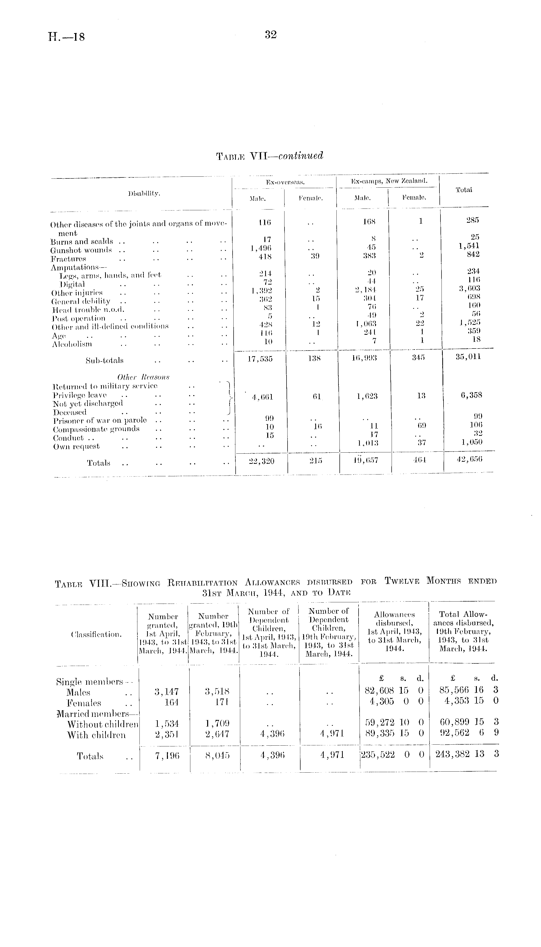 Table VIII.— Showing Rehabilitation Allowances disbursed for Twelve Months ended 31st March, 1944, and to Date