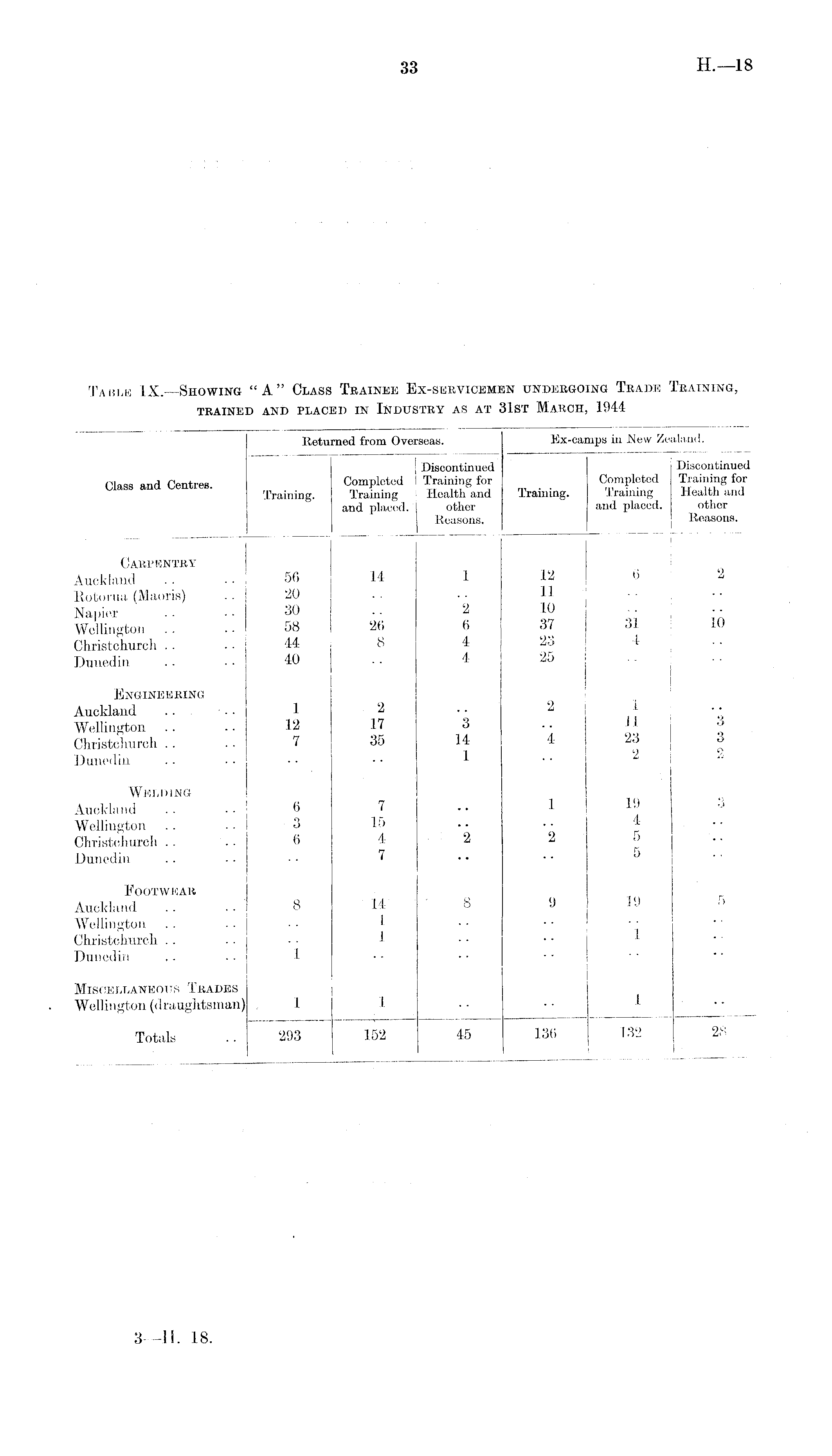 Returned from Overseas. Ex-camps in New Zealand. I Discontinued Discontinued Class and Centres. Completed I Training for Completed Training for Training. Training Health and Training. Traming Health and and placed. other and placed. other Reasons. Reasons. Carpentry i Auckland .... 56 14 1 12 6 Rotorua (Maoris) .. 20 .. 11 .. ; Napier . ■ 30 .. 2 10 .. .. Wellington .. .. 58 26 6 37 31 j 10 Christchurch .. .. 44 8 4 23 4 , j Dunedin .. • • 40 .. 4 25 Engineering Auckland .. - • • 1 2 .. 2 1 .. Wellington .... 12 17 3 .. 11 3 Christchurch .... 7 35 14 4 23 3 Dunedin .. .. • • • • 1 Welding Auckland .... 6 7 .. 1 19 Wellington .. .. 3 '5 •• •• Christchurch .. .. 6 4- 2 2 5 Dunedin .. .. ■ • 7 .. • • 5 Footwear w Auckland .. • • 8 14 8 9 19 Wellington .. .. • • 1 • • • • • • Christchurch .. .. • • 1 Dunedin .. . ■ 1 • • • • Miscellaneous Trades Wellington (draughtsman) ,1 1 • • • • 1 .. Totals .. 293 152 45 136 132 28