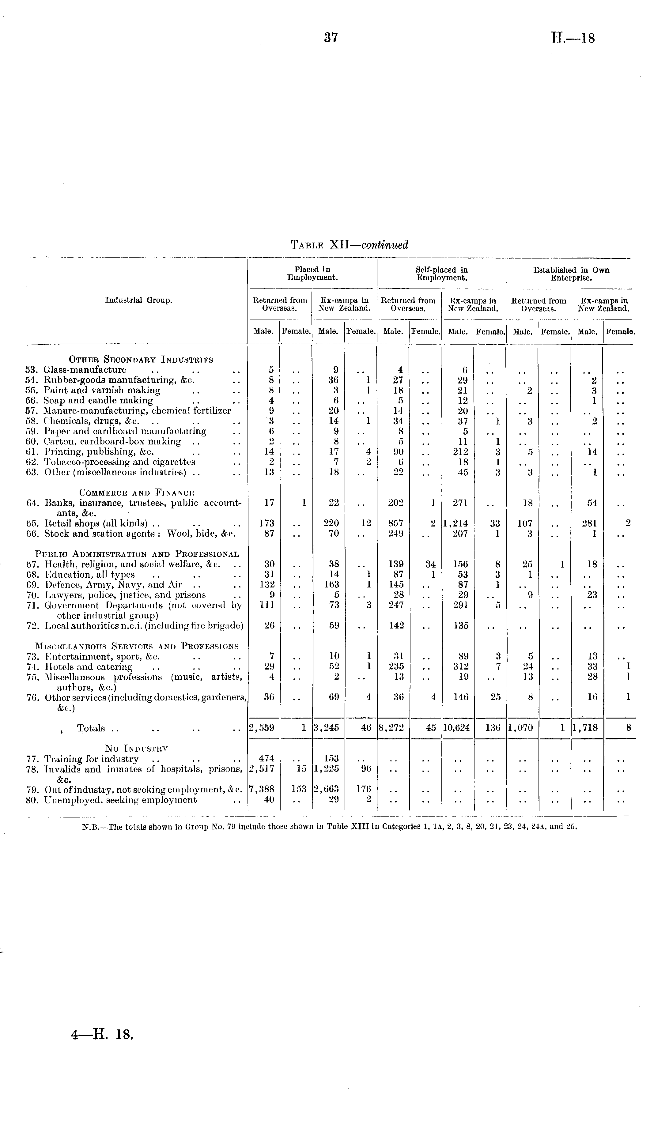 Placed in Self-placed in Established in Own Employment. Employment. Enterprise. Industrial Group. Returned from Ex-camps in Returned from Ex-camps in Returned from Ex-camps in Overseas. New Zealand. Overseas. New Zealand. Overseas. New Zealand. Male. Female. Male. Female. Male. Female. Male. Female. Male. Female. Male. Female. Other Secondary Industries 53. Glass-manufacture .. .. .. 5 .. 9 .. 4 .. 6 54. Rubber-goods manufacturing, &c. .. 8 .. 36 1 27 .. 29 .. .. .. 2 55. Paint and varnish making .. .. 8 3 1 18 21 2 3 56. Soap and candle making .. .. 4 .. 6 .. 5 .. 12 .. .. .. 1 57. Manure-manufacturing, chemical fertilizer 9 .. 20 .. 14 .. 20 58. Chemicals, drugs, &c. .. .. .. 3 14 1 34 37 1 3 2 59. Paper and cardboard manufacturing .. 6 .. 9 .. 8 .. 5 60. Carton, cardboard-box making .. .. 2 .. 8 .. 5 .. 11 1 61. Printing, publishing, &c. .. .. 14 17 4 90 212 3 5 .. 14 62. Tobacco-processing and cigarettes A 2 7 2 6 18 1 63. Other (miscellaneous industries) .. .. 13 18 22 45 3 3 1 Commerce and Finance 64. Banks, insurance, trustees, public account- 17 1 22 .. 202 1 271 . . 18 .. 54 ants, &c. 65. Retail shops (all kinds) .. .. .. 173 .. 220 12 857 2 1,214 33 107 .. 281 2 66. Stock and station agents: Wool, hide, &c. 87 .. 70 .. 249 .. 207 1 3 I Public Administration and Professional 67. Health, religion, and social welfare, &e. .. 30 .. 38 .. 139 34 156 8 25 1 18 68. Education, all types .. .. .. 31 14 1 87 1 53 3 1 69. Defence, Army, Navy, and Air .. .. 132 .. 163 1 145 .. 87 1 70. Lawyers, police, justice, and prisons .. 9 .. 5 .. 28 .. 29 .. 9 .. 23 71. Government Departments (not covered by 111 .. 73 3 247 .. 291 5 other industrial group) 72. Local authorities n.e.i. (including fire brigade) 26 .. 59 .. 142 .. 135 Miscellaneous Services and Proeessions 73. Entertainment, sport, &c. .. .. 7 .10 1 31 89 3 5 13 74. Hotels and catering .. .. .. 29 52 1 235 312 7 24 33 1 75. Miscellaneous professions (music, artists, 4 2 ., 13 19 13 28 1 authors, &c.) 76. Other services (including domestics, gardeners, 36 69 4 36 4 146 25 8 16 1 &c.) , Totals .. .. .. .. 2,559 I 3,245 46 8,272 45 10,624 136 1,070 1 1,718 8 No Industry 77. Training for industry .. .. .. 474 .. 153 78. Invalids and inmates of hospitals, prisons, 2,517 15 1,225 96 &c. 79. Out ofindustry, not seeking employment, &c. 7,388 153 2,663 176 80. Unemployed, seeking employment .. 40 .. 29 2 N.B.—The totals shown In Group No. 79 include those shown in Table XIII in Categories 1, 1A, 2, 3, 8, 20, 21, 23, 24, 24A, and 25.