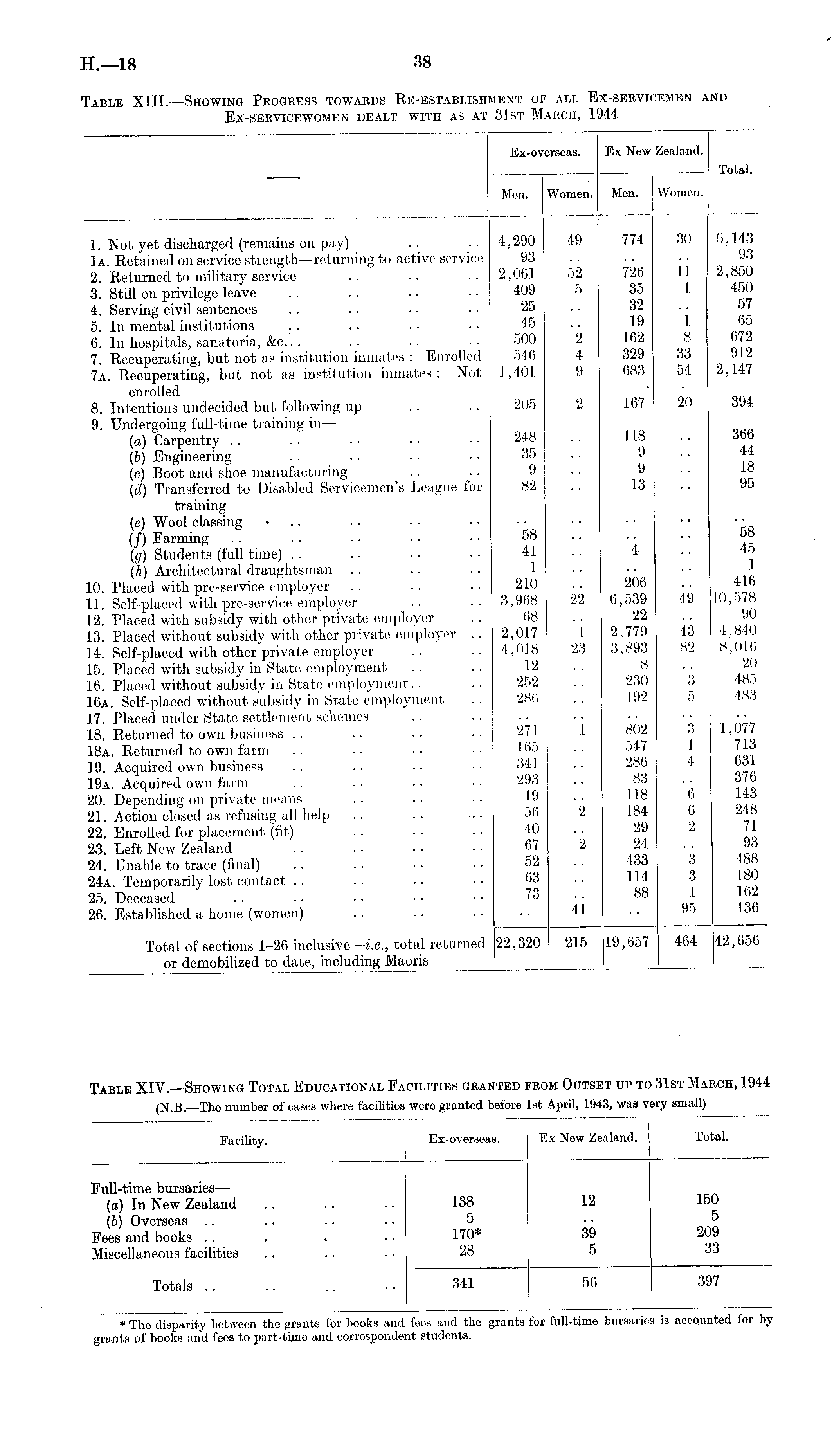 Table XIII.—Showing Progress towards Re-establishment of all Ex-servicemen and Ex-servicewomen dealt with as at 31st March, 1944