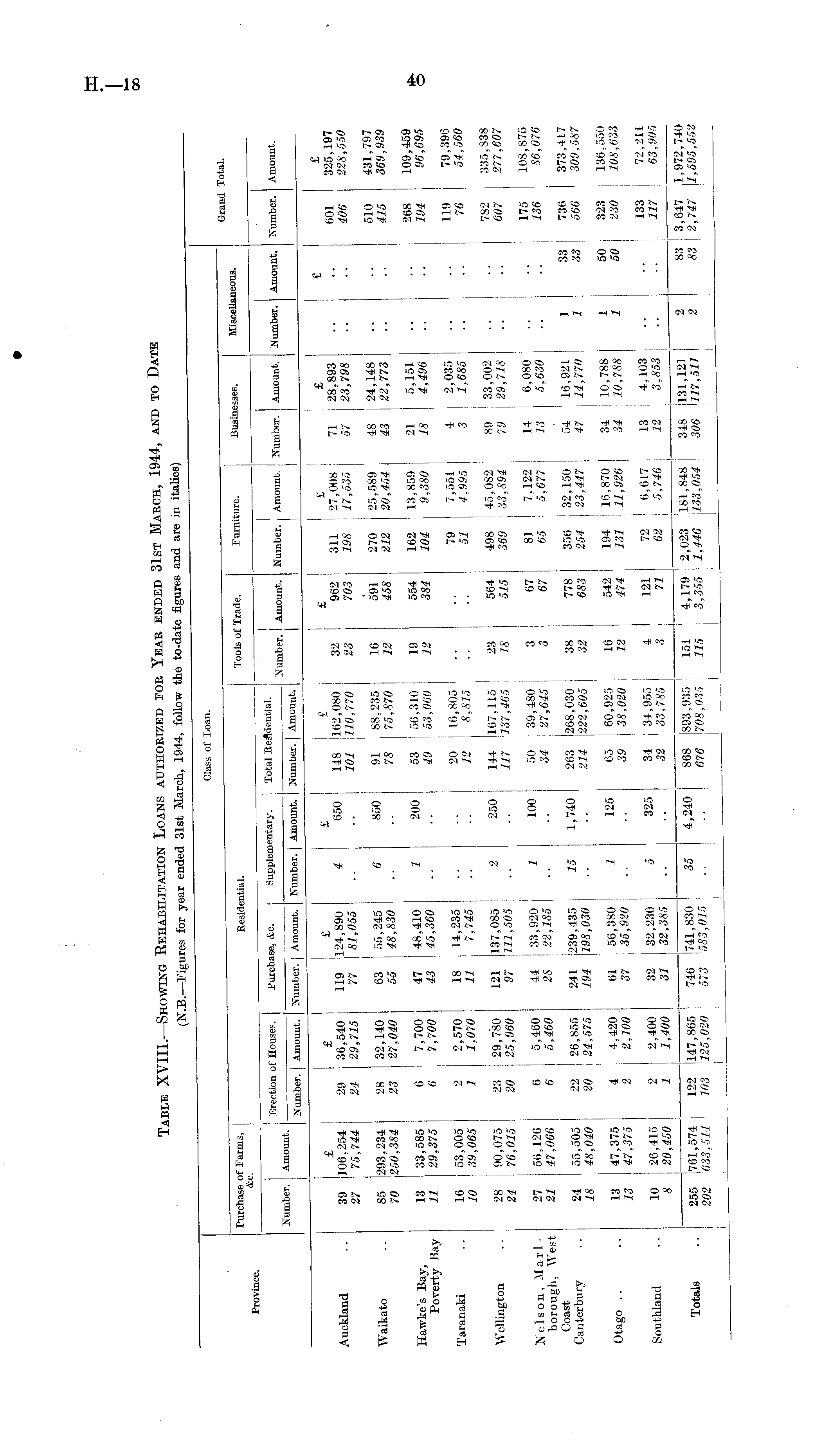 (N.B.— Figures for year ended 31st March, 1944, follow the to-date figures and are in italics) Class of Loan. — — ~ Grand Total. Purchase of Farms, Residential. Tools of Trade. Furniture. Businesses. Miscellaneous. . &C. . Province. j , Erection of Houses. Purchase, &c. Supplementary. Total Resident, al. Am „„ ni Number. ! Amount. Number. Amount. Number. Amount. Number. Amount. Number. Amount. — — r~ i Number. I Amount. Number. | Amount. Number. | Amount. Number. [ Amount. 1 Auckland .. 39 jl06,254 29 36,540 119 124,890 4 6o0 148 |l62,080 32 962 311 2/,008 71 __ .. 406 228,550 Waikato .. 85 293,234 28 32,140 63 55,245 6 8 O 0 91 88,235 16 591 270 25,589 48 24,148 . .. 415 369,939 HaWk povS'.Bay U US 6 IjOO f 3 &S2 ./ ™ 49 fsfolo il wl *I'S) fs S " !! 194 96,695 Taranaki .. 16 53,005 2 2,570 18 14,235 .. .. 20 16,805 .. .. 79 7,551 4 2,035 76 54,560 Wellington .. 28 90,075 23 29,780 121 137,08o 2 250 144 167, llo 23 564 498 45,082 89 .. 607 277,607 West S RS I MS tt ll'S 1 S 3 S Sffl !! ~ aSSL, .. g -,505 22 26,855 241 239,435 U I.«0 » -,030 38 778 356 32,150 54 16,921 1 33 736 373,417 0tag ° •• - S fr'SI $ two % fs'S 125 39 Ts'S » 4U W u'S 34 1 « Ifo Southland .. 10 26,415 2 2,400 32 32,230 5 325 34 34,955 4 121 72 6,61. 13 4,103 ■■ — -1 4,240 a - lal'g 1 ?3 *"