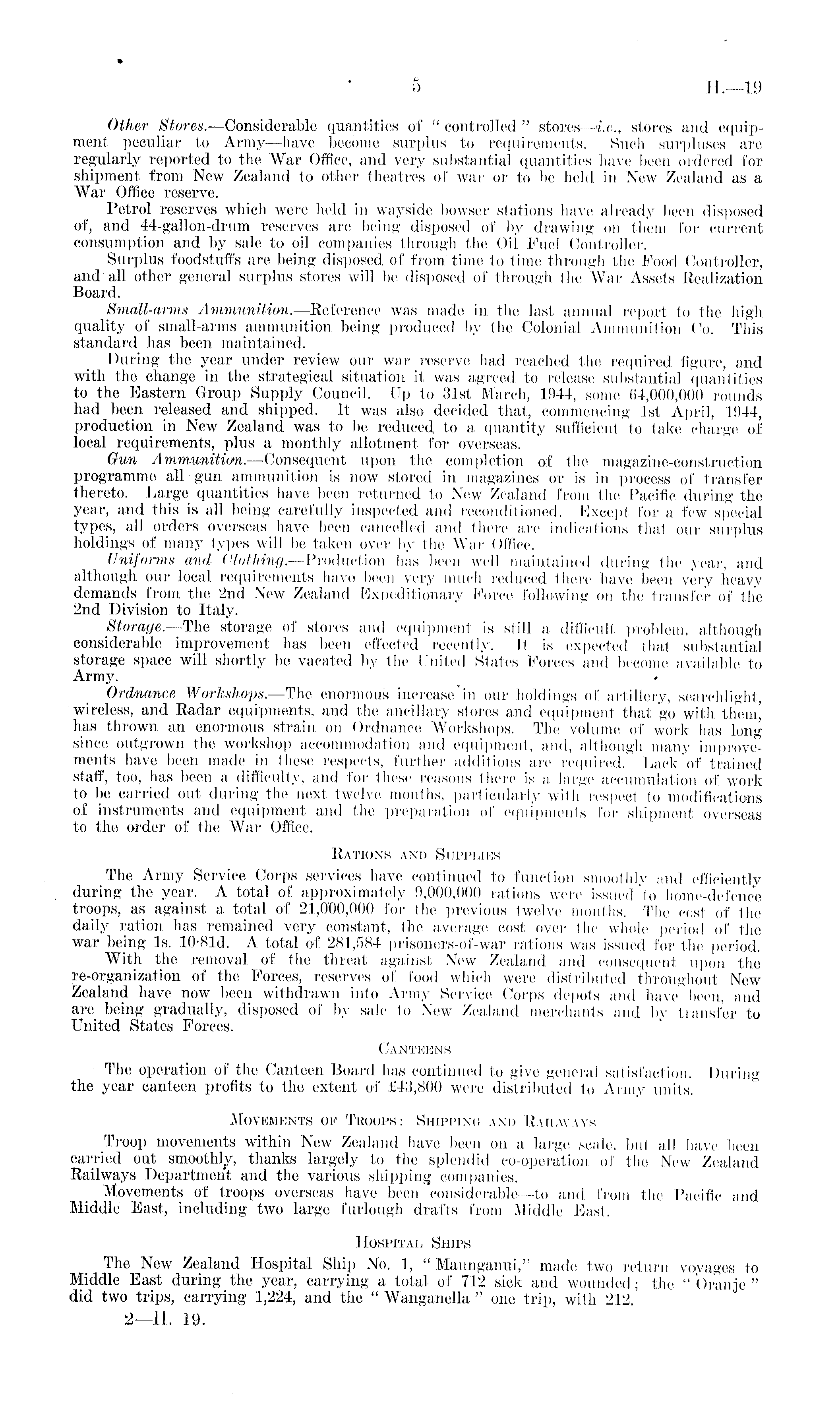 Other Stores. —Considerable quantities of " controlled " stores — i.e., stores and equipment peculiar to Army—have become surplus to requirements. Such surpluses are regularly reported to the War Office, and very substantial quantities have been ordered Cor shipment from New Zealand to other theatres of war or to be held in New Zealand as a War Office reserve. Petrol reserves which were held in wayside bowser stations have already been disposed of, and 44-gallon-drum reserves are being disposed of by drawing' on. them for current consumption and by sale to oil companies through the Oil Fuel Controller. Surplus foodstuffs are being disposed of from, time to time through the Food Controller, and all other general surplus stores will be disposed of through the War Assets Realization Board. Small-amis Ammunition. —Reference was made in the last annual report to the high quality of small-arms ammunition, being produced by the Colonial Ammunition Co. This standard has been, maintained. During the year under review our war reserve had reached the required figure, and with the change in the strategical situation it was agreed to release substantial quantities to the Eastern Croup Supply Council. (Jp to 31st March, 1944, some 64,000,000 rounds had been released and shipped. It was also decided that, commencing Ist April, 1944, production in New Zealand was to be reduced to a quantity sufficient to lake charge of local requirements, plus a monthly allotment for' overseas. Gun Ammunition. —Consequent upon the completion, of the magazine-construction programme all gun ammunition is now stored in magazines or is in process of transfer thereto. Large quantities have been returned to New Zealand from the Pacific during the year, and this is all being carefully inspected and reconditioned. Except for a few special types, all orders overseas have been cancelled and there are indications that our surplus holdings of many types will be taken over by the War Office, Uniforms and Clothing. —Production has been well maintained during the year, and although our local requirements have been very much reduced there have been very heavy demands from the 2nd New Zealand Expeditionary Force following on the transfer of the 2nd Division to Italy. Storage.— The storage of stores and equipment is still a. difficult problem, although considerable improvement lias been effected recently. It is expected that substantial storage space will shortly be vacated by the United Slates Forces and become available to Army. « Ordnance Workshops. —The enormous inercase'in our holdings of artillery, searchlight, wireless, and Radar equipments, and the ancillary stores and equipment that go with, themj has thrown an enormous strain on Ordnance Workshops, The volume of work has long since outgrown the workshop accommodation and equipment, and, although many improvements have been made in these respect's, further additions are required. Lack of trained staff, too, has been a difficulty, and for these reasons there is a. large accumulation of work to be carried out during the next twelve months, particularly with respect to modifications of instruments and equipment and the preparation of equipments for shipment overseas to the order of the War Office. Rations and Supplies The Army Service Corps services have continued to function smoothly and efficiently during the year. A total of approximately 9,000,000 rations were issued to home-defence troops, as against a total of 21,000,000 for the previous twelve months. The cost of the daily ration has remained very constant, the average cost over the whole period of the war being Is. 10-81 d. A total of 281,584 prisoners-of-war rations was issued for the period. With the removal of the threat against New Zealand and consequent upon the re-organization of the Forces, reserves of food which were distributed throughout New Zealand have now been withdrawn into Army Service Corps depots and have been, and are being gradually, disposed of by sale to New Zealand merchants and by transfer to United States Forces. Canteens The operation of the Canteen Board has continued to give general satisfaction. During the year canteen profits to the extent of £43,800 were distributed to Army units. , Movements of Troops: Shipping and Railways Troop movements within New Zealand have been on a large scale, but all have been carried out smoothly, thanks largely to the splendid co-operation of the New Zealand Railways Department and the various shipping companies. Movements of troops overseas have been considerable—to and from the Pacific and Middle East, including two large furlough drafts from Middle East, Hospital Ships The New Zealand Hospital Ship No. 1, " Maunganui," made two return voyages to Middle East during the year, carrying a total of 712 sick and wounded; the " Oranje " did two trips, carrying 1,224, and the " Wanganella " one trip, with 212.