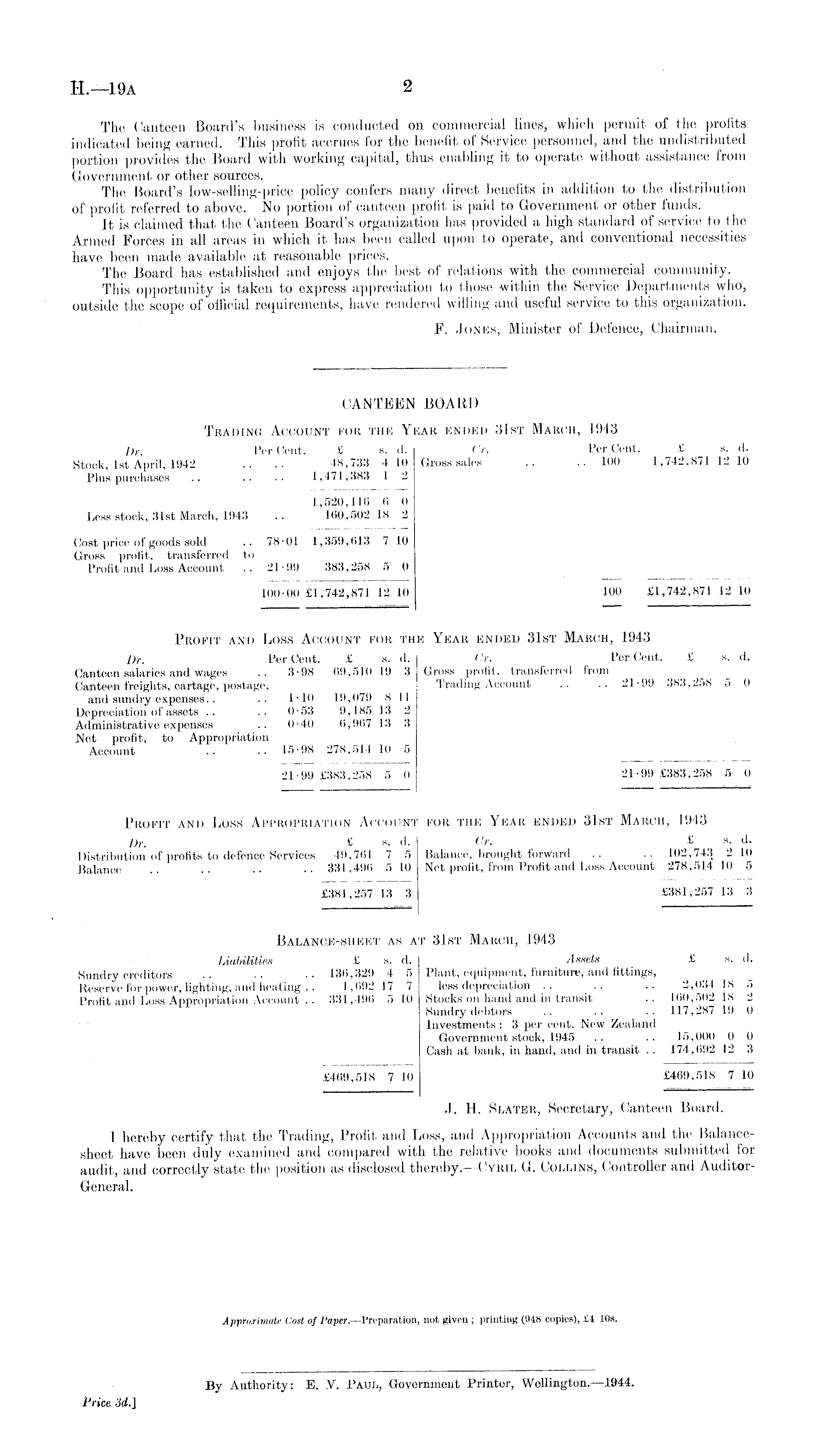 The Canteen Board's business is conducted on commercial lines, which permit of the profits indicated being earned. This profit accrues for the benefit of Service personnel, and the undistributed portion provides the Board with working capital, thus enabling it to operate without assistance from Government or other sources. The Board's low-selling-price policy confers many direct benefits in addition to the distribution of profit referred to above. No portion of canteen profit is paid to Government or other funds. It is claimed that the Canteen Board's organization has provided a high standard of service to the Armed Forces in all areas in which it has been called upon to operate, and conventional necessities have been made available at reasonable prices. The Board has established and enjoys the best of relations with the commercial community. This opportunity is taken to express appreciation to those within the Service Departments who, outside the scope of official requirements, have rendered willing and useful service to this organization. F. Jones, Minister of Defence, Chairman.