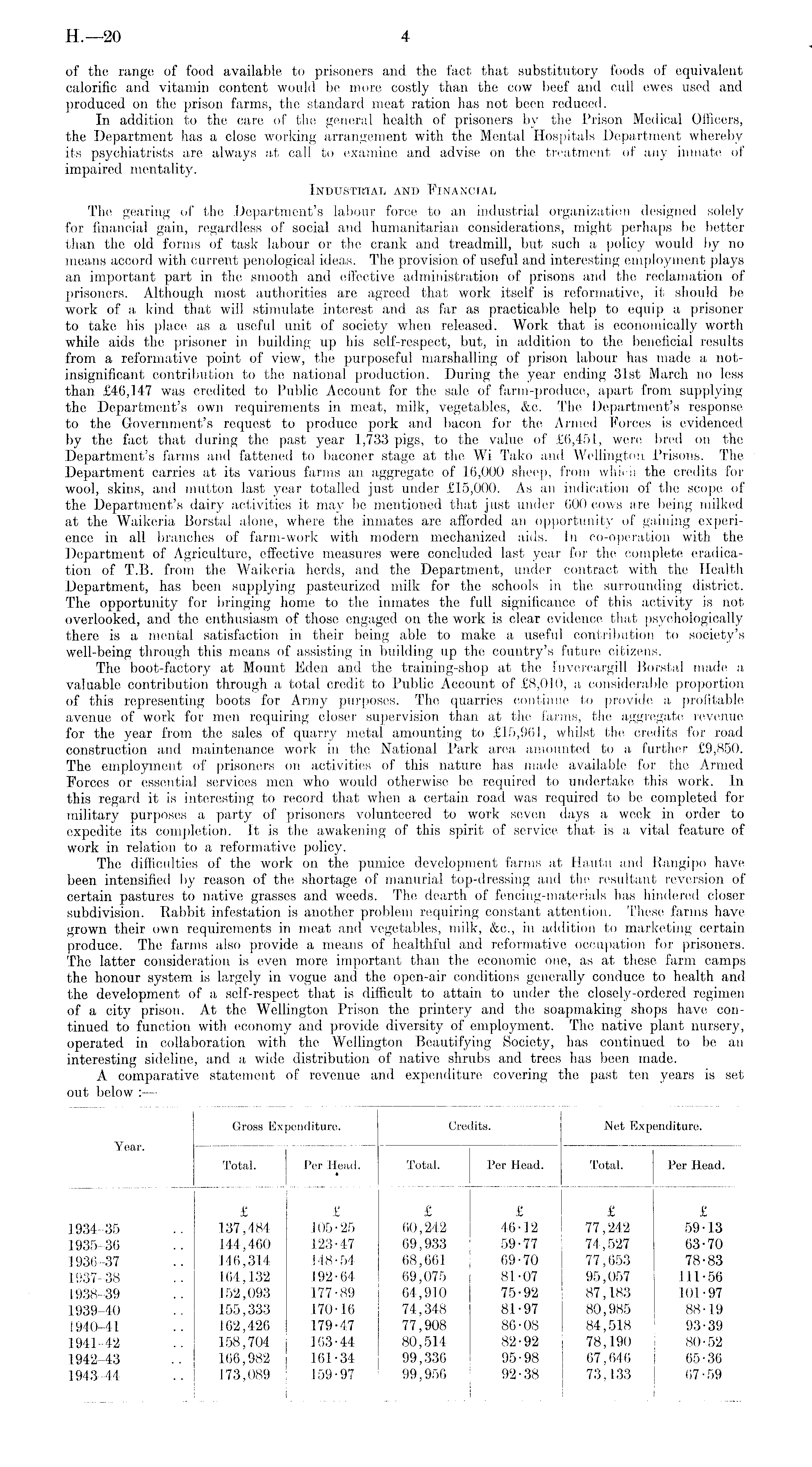 of the range of food available to prisoners and the fact that substitutory foods of equivalent calorific and vitamin content would be more costly than the cow beef and cull ewes used and produced on the prison farms, the standard meat ration has not been reduced. In addition to the care of the general health of prisoners by the Prison Medical Officers, the Department has a close working arrangement with the Mental Hospitals Department whereby its psychiatrists are always at call to examine and advise on the treatment of any inmate of impaired mentality. Industrial and Financial The gearing of the Department's labour force to an industrial organization designed solely for financial gain, regardless of social and humanitarian considerations, might perhaps be better than the old forms of task labour or the crank and treadmill, but such a policy would by no means accord with current penological ideas. The provision of useful and interesting employment plays an important part in the smooth and effective administration of prisons and the reclamation of prisoners. Although most authorities are agreed that work itself is reformative, it should be work of a kind that will stimulate interest and as far as practicable help to equip a prisoner to take his place as a useful unit of society when released. Work that is economically worth while aids the prisoner in building up his self-respect, but, in addition to the beneficial results from a reformative point of view, the purposeful marshalling of prison labour has made a notinsignificant contribution to the national production. During the year ending 31st March no less than £46,147 was credited to Public Account for the sale of farm-produce, apart from supplying the Department's own requirements in meat, milk, vegetables, &c. The Department's response to the Government's request to produce pork and bacon for the Armed Forces is evidenced by the fact that during the past year 1,733 pigs, to the value of £6,451, were bred on the Department's farms and fattened to baconer stage at the Wi Tako and Wellington Prisons. The Department carries at its various farms an aggregate of 16,000 sheep, from which the credits for wool, skins, and mutton last year totalled just under £15,000. As an indication of the scope of the Department's dairy activities it may be mentioned that just under 600 cows are being milked at the Waikeria Borstal alone, where the inmates are afforded an opportunity of gaining experience in all branches of farm-work with modern mechanized aids. In co-operation with the Department of Agriculture, effective measures were concluded last year for the complete eradication of T.B. from the Waikeria herds, and the Department, under contract with the Health Department, has been supplying pasteurized milk for the schools iti the surrounding district. The opportunity for bringing home to the inmates the full significance of this activity is not overlooked, and the enthusiasm of those engaged on the work is clear evidence that psychologically there is a mental satisfaction in their being able to make a useful contribution to society's well-being through this means of assisting in building up the country's future citizens. The boot-factory at Mount Eden and the training-shop at the Invercargill Borstal made a valuable contribution through a total credit to Public Account of £8,010, a considerable proportion of this representing boots for Army purposes. The quarries continue to provide a profitable avenue of work for men requiring closer supervision than at the farms, the aggregate revenue for the year from the sales of quarry metal amounting to £15,961, whilst the credits for road construction and maintenance work in the National Park area amounted to a further £9,850. The employment of prisoners on activities of this nature has made available for the Armed Forces or essential services men who would otherwise be required to undertake this work. In this regard it is interesting to record that when a certain road was required to be completed for military purposes a party of prisoners volunteered to work seven days a week in order to expedite its completion. It is the awakening of this spirit of service that is a vital feature of work in relation to a reformative policy. The difficulties of the work on the pumice development farms at Hautu and Bangipo have been intensified by reason of the shortage of manurial top-dressing and the resultant reversion of certain pastures to native grasses and weeds. The dearth of fencing-materials has hindered closer subdivision. Rabbit infestation is another problem requiring constant attention. These farms have grown their own requirements in meat and vegetables, milk, &c., in addition to marketing certain produce. The farms also provide a means of healthful and reformative occupation for prisoners. The latter consideration is even more important than the economic one, as at these farm camps the honour system is largely in vogue and the open-air conditions generally conduce to health and the development of a self-respect that is difficult to attain to under the closely-ordered regimen of a city prison. At the Wellington Prison the printery and the soapmaking shops have continued to function with economy and provide diversity of employment. The native plant nursery, operated in collaboration with the Wellington Beautifying Society, has continued to be an interesting sideline, and a wide distribution of native shrubs and trees has been made. A comparative statement of revenue and expenditure covering the past ten years is set out below :—