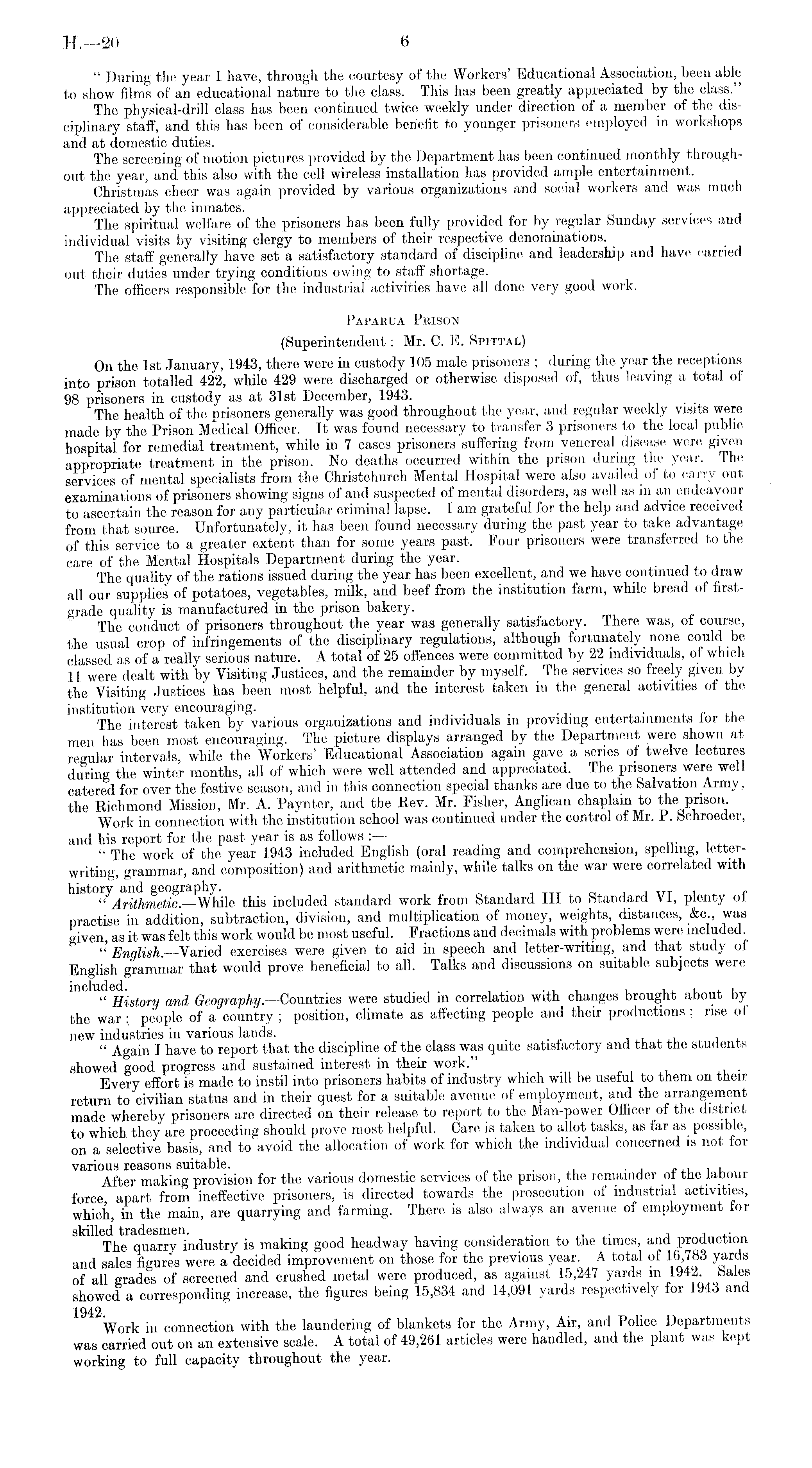 " During the year 1 have, through the courtesy of the Workers' Educational Association, been able to show films of an educational nature to the class. This has been greatly appreciated by the class." The physical-drill class has been continued twice weekly under direction of a member of the disciplinary staff, and this has been of considerable benefit to younger prisoners employed in workshops and at domestic duties. The screening of motion pictures provided by the Department has been continued monthly throughout the year, and this also with the cell wireless installation has provided ample entertainment. Christmas cheer was again provided by various organizations and social workers and was much appreciated by the inmates. The spiritual welfare of the prisoners has been fully provided for by regular Sunday services and individual visits by visiting clergy to members of their respective denominations. The staff generally have set a satisfactory standard of discipline and leadership and have carried out their duties under trying conditions owing to staff shortage. The officers responsible for the industrial activities have all done very good work. Paparua Prison (Superintendent: Mr. C. E. Spittal) On the Ist January, 1943, there were in custody 105 male prisoners ; during the year the receptions into prison totalled 422, while 429 were discharged or otherwise disposed of, thus leaving a total of 98 prisoners in custody as at 31st December, 1943. The health of the prisoners generally was good throughout the year, and regular weekly visits were made by the Prison Medical Officer. It was found necessary to transfer 3 prisoners to the local public hospital for remedial treatment, while in 7 cases prisoners suffering from venereal disease were given appropriate treatment in the prison. No deaths occurred within the prison during the year. The services of mental specialists from the Christchurch Mental Hospital were also availed of to carry out examinations of prisoners showing signs of and suspected of mental disorders, as well as in an endeavour to ascertain the reason for any particular criminal lapse. lam grateful for the help and advice received from that source. Unfortunately, it has been found necessary during the past year to take advantage of this service to a greater extent than for some years past. Four prisoners were transferred to the care of the Mental Hospitals Department during the year. The quality of the rations issued during the year has been excellent, and we have continued to draw all our supplies of potatoes, vegetables, milk, and beef from the institution farm, while bread of firstgrade quality is manufactured in the prison bakery. The conduct of prisoners throughout the year was generally satisfactory. There was, oi course, the usual crop of infringements of the disciplinary regulations, although fortunately none could be classed as of a really serious nature. A total of 25 offences were committed by 22 individuals, of which 11 were dealt with by Visiting Justices, and the remainder by myself. The services so freely given by the Visiting Justices has been most helpful, and the interest taken in the general activities ot the institution very encouraging. , , . , , ~ The interest taken by various organizations and individuals m providing entertainments tor the men has been most encouraging. The picture displays arranged by the Department were shown at regular intervals, while the Workers' Educational Association again gave a series of twelve lectures during the winter months, all of which were well attended and appreciated. The prisoners were well catered for over the festive season, and in this connection special thanks are due to the Salvation. Army, the Richmond Mission, Mr. A. Paynter, and the Rev. Mr. Fisher, Anglican chaplain to the prison. Work in connection with the institution school was continued under the control of Mr. P. Schroeder, and his report for the past year is as follows :■ — " The work of the year 1943 included English (oral reading and comprehension, spelling, letterwriting, grammar, and composition) and arithmetic mainly, while talks on the war were correlated with Arithmetic.-—While this included standard work from Standard 111 to Standard VI, plenty of practise in addition, subtraction, division, and multiplication of money, weights, distances, &c., was given, as it was felt this work would be most useful. Fractions and decimals with problems were included. English.—Varied exercises were given to aid in speech and letter-writing, and that study of English grammar that would prove beneficial to all. Talks and discussions on suitable subjects were " History and Geography. —Countries were studied in correlation with changes brought about by the war : people of a country ; position, climate as affecting people and their productions : rise of new industries in various lands. " Again I have to report that the discipline of the class was quite satisfactory and that the students showed good progress and sustained interest in their work. Every effort is made to instil into prisoners habits of industry which will be useful to them on their return to civilian status and in their quest for a suitable avenue of employment, and the arrangement made whereby prisoners are directed on their release to report to the Man-power Officer of the district to which they are proceeding should prove most helpful. Care is taken to allot tasks, as far as possible, on a selective basis, and to avoid the allocation of work for which the individual concerned is not for various reasons suitable. . . , , , After making provision for the various domestic services of the prison, the remainder ot the labour force apart from ineffective prisoners, is directed towards the prosecution of industrial activities, which, in the main, are quarrying and farming. There is also always an avenue of employment for skilled tradesmen. ... , . • j i *.■ The quarry industry is making good