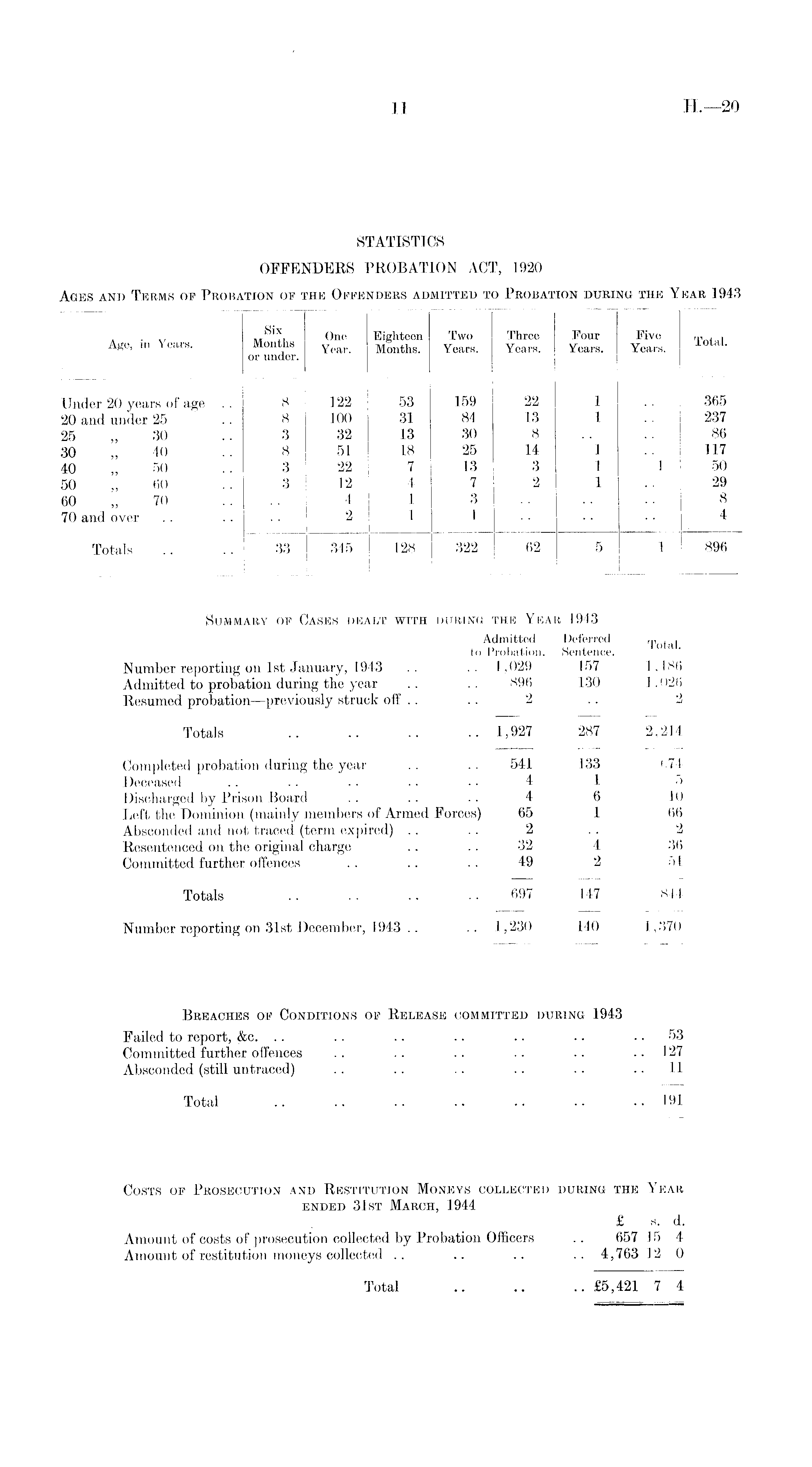 Summary of Cases dealt with during the Year 1943 Admitted Deferred Tntnl to Probation. Sentence. Number reporting on Ist January, 1943 .. .. 1,029 157 1,186 Admitted to probation during the year . . . . 896 130 1, 026 Resumed probation —previously struck off .. .. 2 Totals 1,927 287 2,214 Completed probation during the year .. .. 541 133 674 Deceased .. .. .. .. . ■ 4 1 5 Discharged by Prison Board . . . . . . 4 6 10 Left the Dominion (mainly members of Armed Forces) 65 1 66 Absconded and not traced (term expired) . . . . 2 .. 2 Resentenced on the original charge .. .. 32 4 36 Committed further offences .. .. .. 49 2 51 Totals .. .. .. .. 697 147 844 Number reporting on 31st December, 1943 .. .. 1,230 140 1,370 Breaches of Conditions of Release committed during 1943 Failed to report, &c. .. .. .. .. .. .. 53 Committed further offences .. .. .. .. .. 127 Absconded (still untraced) .. .. .. .. .. .. 11 Total .. .. .. .. .. .. .. 191 Costs of Prosecution and Restitution Moneys collected during the Year ended 31st March, 1944 £ s. d. Amount of costs of prosecution collected by Probation Officers .. 657 15 4 Amount of restitution moneys collected .. .. .. .. 4,763 120 Total £5,421 7 4