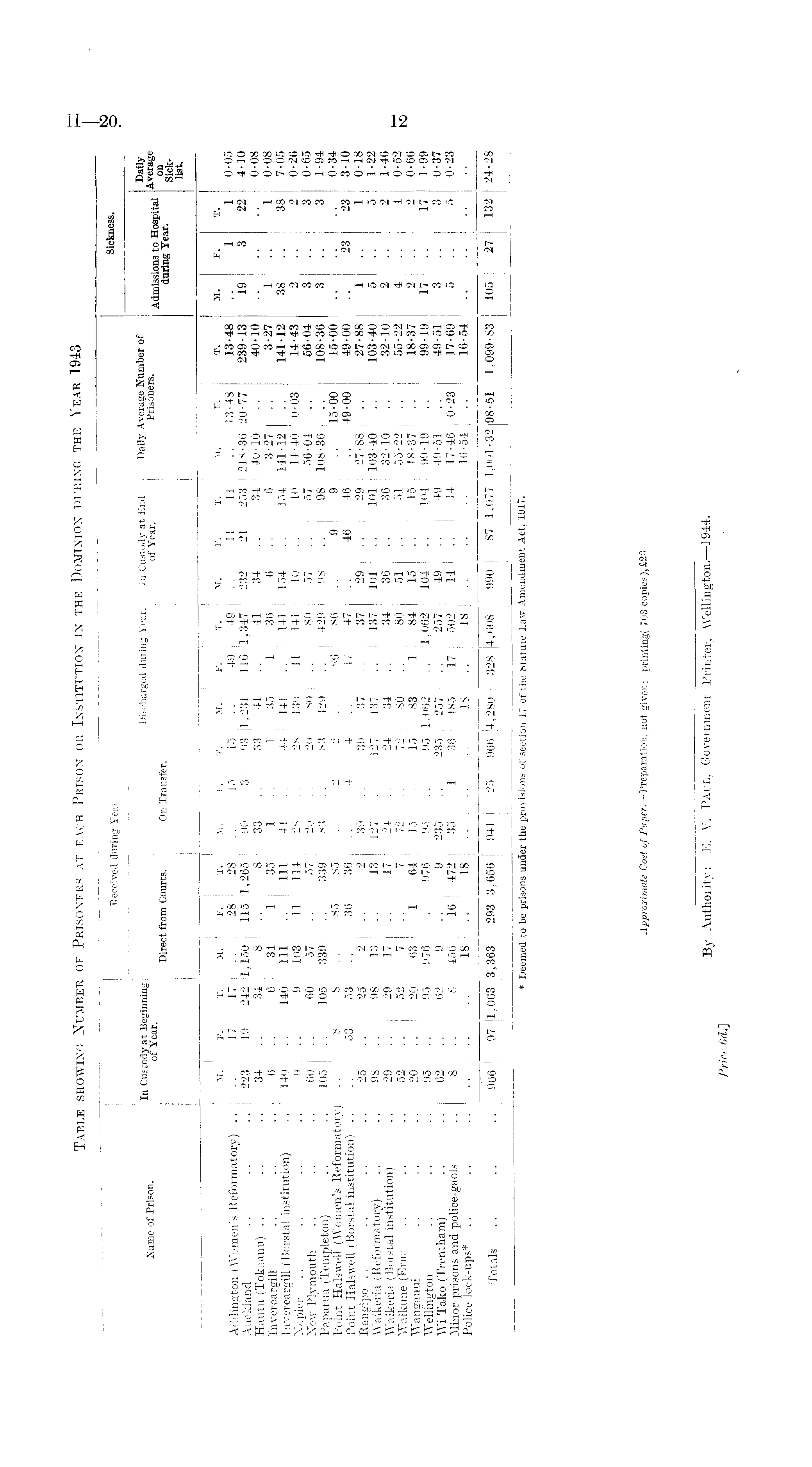 Table showing Number of Prisoners at each Prison or Institution in the Dominion during the Year 1943