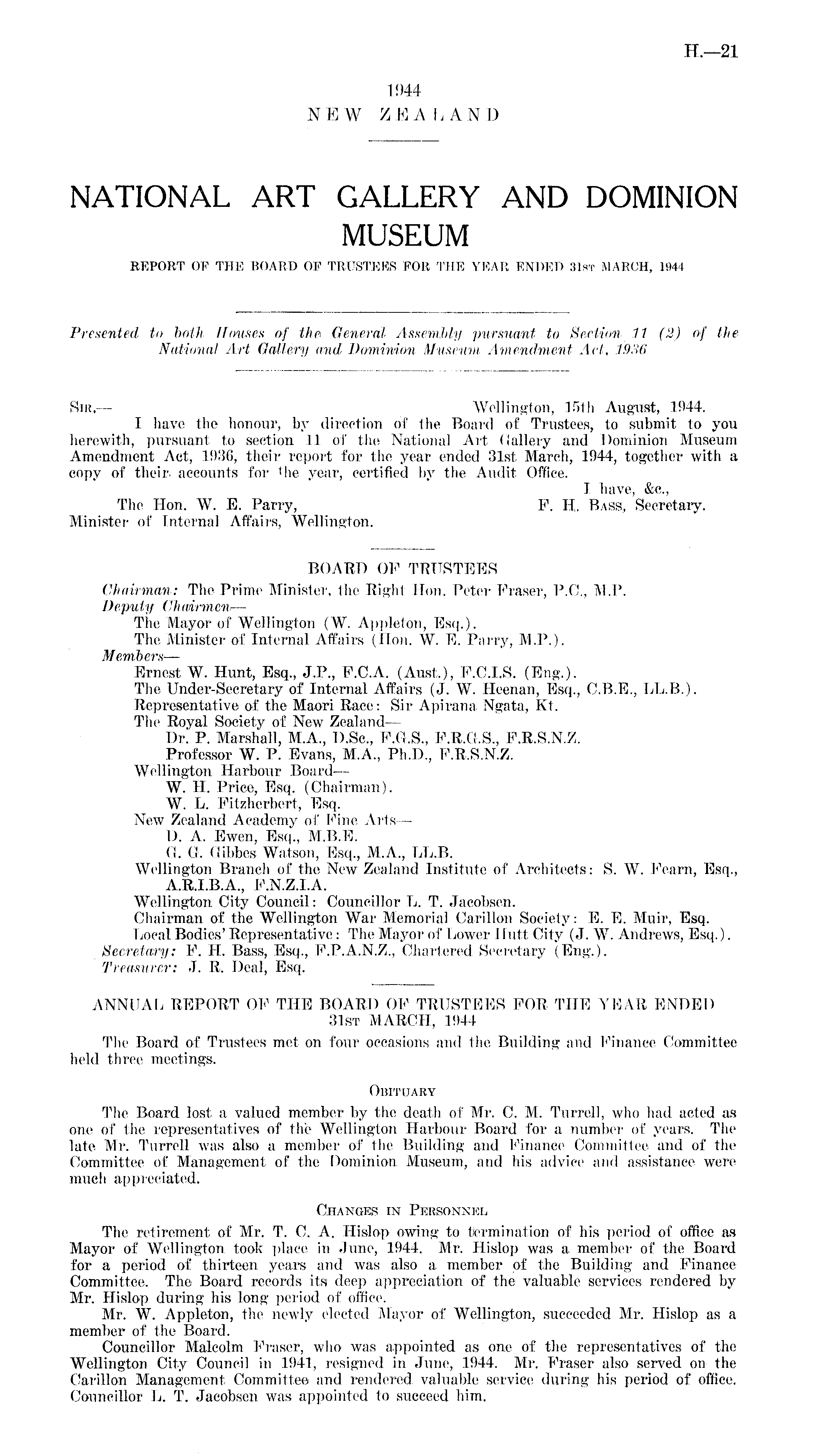 ANNUAL REPORT OF THE BOARD OF TRUSTEES FOR THE YEAR ENDED 31st MARCH, 1944 The Board of Trustees met on four occasions and the Building and Finance Committee held three meetings. Obituary The Board lost a valued member by the death of Mr. C. M. Turrell, who had acted as one of the representatives of the Wellington Harbour Board for a number of years. The late Mr. Turrell was also a member of the Building and Finance Committee and of the Committee of Management of the Dominion Museum, and his advice and assistance were much appreciated. Changes in Personnel The retirement of Mr. T. C. A. Hislop owing to termination of his period of office as Mayor of Wellington took place in June, 1944. Mr. Hislop was a. member of the Board for a period of thirteen years and was also a member of the Building and Finance Committee. The Board records its deep appreciation of the valuable services rendered by Mr. Hislop during his long period of office. Mr. W. Appleton, the newly elected Mayor of Wellington, succeeded Mr. Hislop as a member of the Board. Councillor Malcolm Fraser, who was appointed as one of the representatives of the Wellington City Council in 1941, resigned in June, 1944. Mr. Fraser also served on the Carillon Management Committee and rendered valuable service during his period of office. Councillor L. T. Jacobsen was appointed to succeed him.