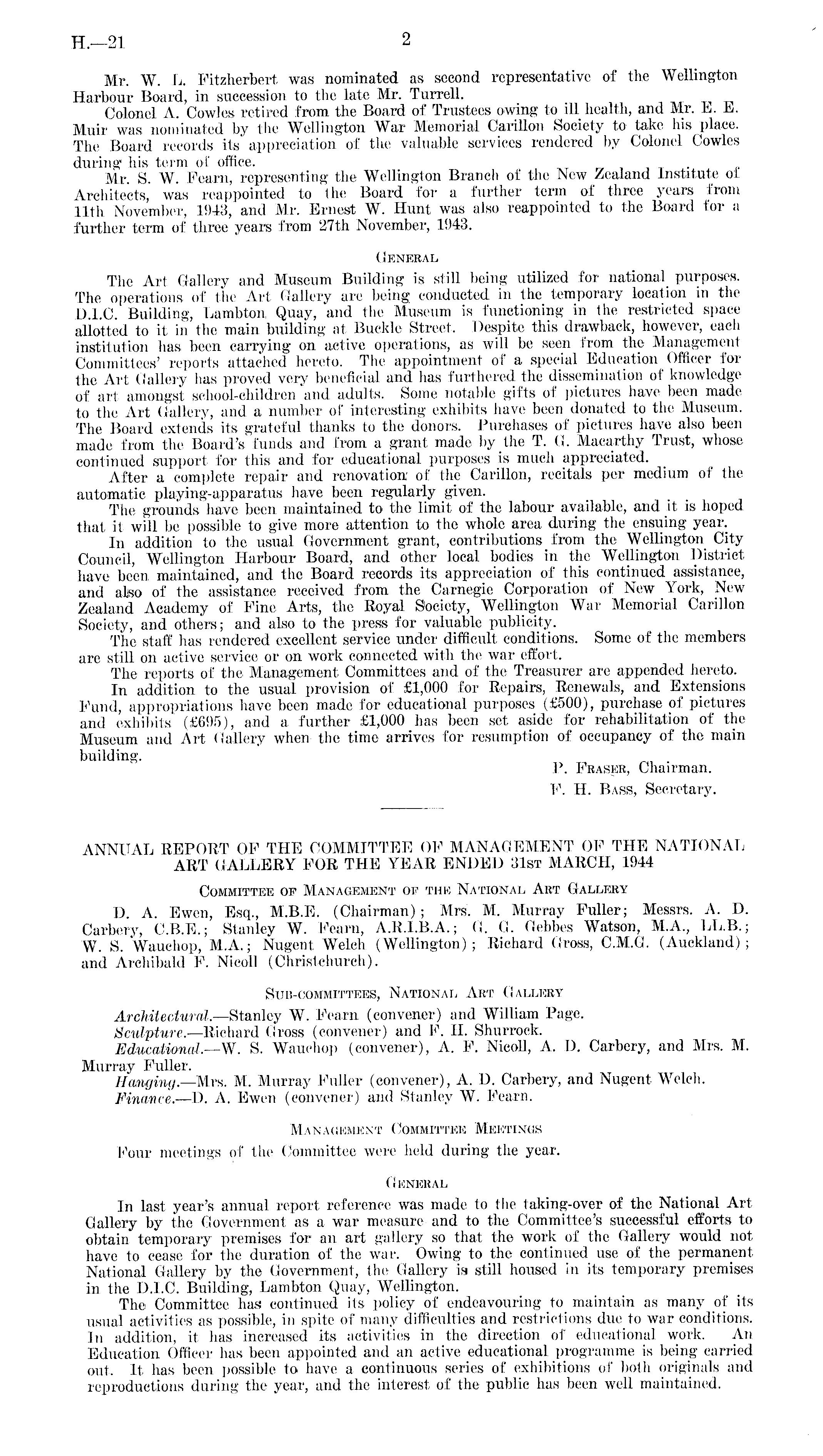 Mr. W. L. Fitzherbert was nominated as second representative of the Wellington Harbour Board, in succession to the late Mr. Turrell. Colonel A. CowJes retired from the Board of Trustees owing to ill health, and Mr. h. E. Muir was nominated by the Wellington War Memorial Carillon Society to take his place. The Board records its appreciation of the valuable services rendered by Colonel Cowles during his term of office. ~ Mr. S. W. Fearn, representing the Wellington Branch of the New Zealand Institute ol Architects, was reappointed to the Board for a further term of three years from 11th November, 1943, and Mr. Ernest W. Hunt was also reappointed to the Board for a further term of three years from 27th November, 1943. General The Art Gallery and Museum Building is still being utilized for national purposes. The operations of the Art Gallery are being conducted in the temporary location in the D.I.C. Building, Lambton Quay, and the Museum is functioning in the restricted space allotted to it in the main building at Buckle Street, Despite this drawback, however, each institution has been carrying on active operations, as will be seen from the Management Committees' reports attached hereto. The appointment of a special Education Officer for the Art Gallery has proved very beneficial and has furthered the dissemination oi knowledge of art amongst school-children 'and adults. Some notable gifts of pictures have been made to the Art Gallery, and a number of interesting exhibits have been donated to the Museum. The Board extends its grateful thanks to the donors. Purchases of pictures have also been made from the Board's funds and from a grant made by the T. G. Macarthy Trust, whose continued support for this and for educational purposes is much appreciated. After a complete repair and renovation of the Carillon, recitals per medium of the automatic playing-apparatus have been regularly given. The grounds have been, maintained to the limit of the labour available, and it is hoped that it will be possible to give more attention to the whole area during the ensuing year. In addition to the usual Government grant, contributions from the Wellington City Council, Wellington Harbour Board, and other local bodies in the Wellington District, have been, maintained, and the Board records its appreciation of this continued assistance, and also of the assistance received from the Carnegie Corporation of New York, New Zealand Academy of Fine Arts, the Royal Society, Wellington War Memorial Carillon Society, and others; and also to the press for valuable publicity. The staff has rendered excellent service under difficult conditions. Some of the members are still on active service or on work connected with the war effort. The reports of the Management Committees and of the Treasurer are appended hereto. In addition to the usual provision of £1,000 for Repairs, Renewals, and Extensions Fund, appropriations have been made for educational purposes (£500), purchase of pictures and exhibits (£695), and a further £1,000 has been set aside for rehabilitation of the Museum and Art Gallery when the time arrives for resumption of occupancy of the main building. P. Fraser, Chairman. P. H. Bass, Secretary.