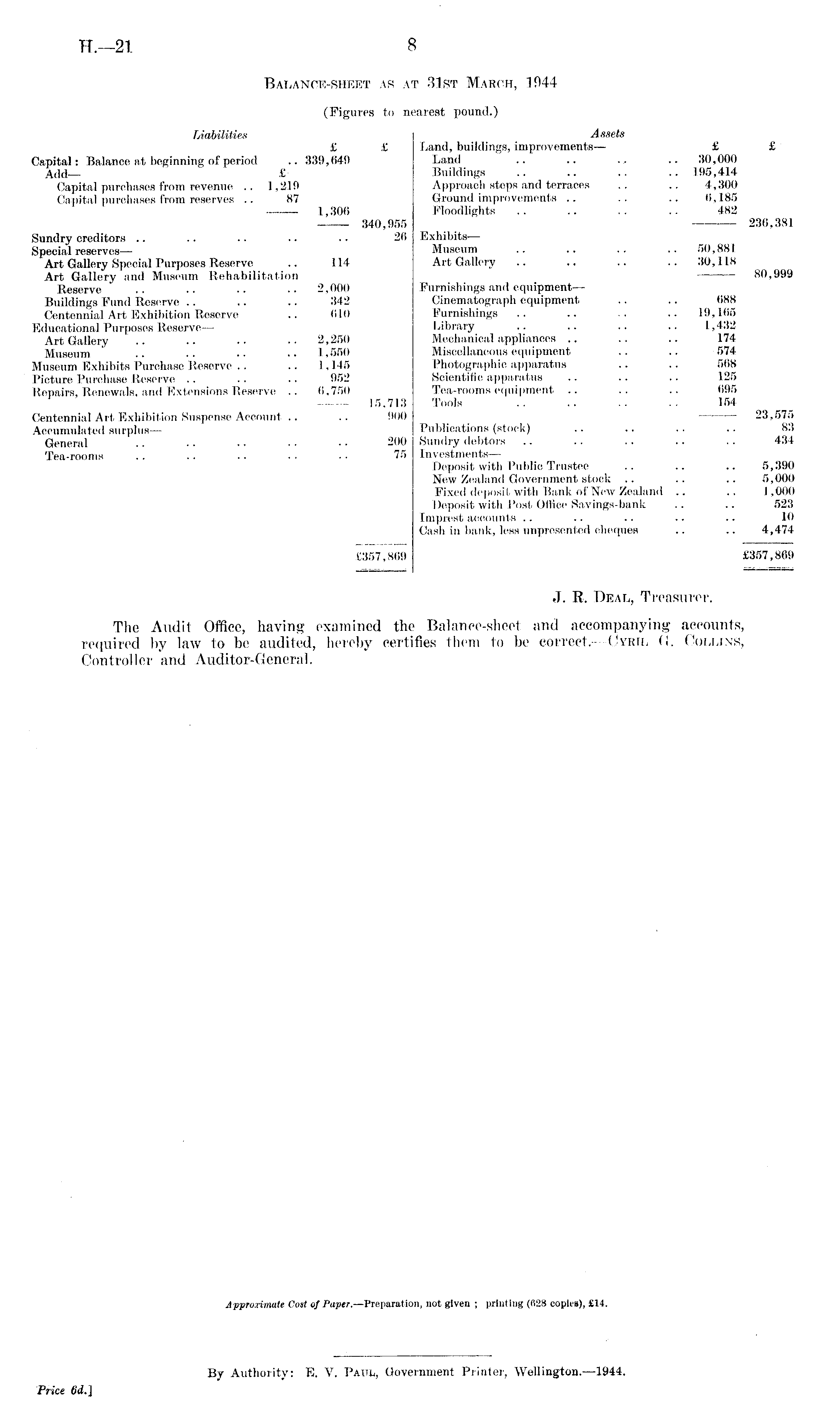 Balance-sheet as at 31st March, 1944 (Figures to nearest pound.) Liabilities Assets £ £ Land, buildings, improvements— £ £ Capital: Balance at beginning of period .. 339,640 Land .. .. ~ .. 30,000 Add— £ Buildings .. .. .. .. 195,414 Capital purchases from revenue .. 1,219 Approach steps and terraces .. .. 4,300 Capital purchases from reserves .. 87 Ground improvements .. .. .. 0,185 1,306 Floodlights .. .. .. .. 482 340,955 236,381 Sundry creditors .. .. .. .. .. 26 Exhibits— Special reserves— Museum .. .. .. .. 50,881 Art Gallery Special Purposes Reserve .. 114 Art Gallery .. .. .. .. 30,118 Art Gallery and Museum Rehabilitation 80,999 Reserve .. .. .. .. 2,000 Furnishings and equipment— Buildings Fund Reserve .. .. .. 342 Cinematograph equipment .. .. 688 Centennial Art Exhibition Reserve .. 610 Furnishings .. .. .. .. 19,165 Educational Purposes Reserve— Library .. .. .. .. 1,432 Art Gallery .. .. .. 2,250 Mechanical appliances .. .. .. 174 Museum ' .. .. •• 1,550 Miscellaneous equipment .. .. 574 Museum Exhibits Purchase Reserve .. .. 1,145 Photographic apparatus .. .. 568 Picture Purchase Reserve .. . . .. 952 Scientific apparatus .. .. .. 125 Repairs, Renewals, and Extensions Reserve .. 6,750 Tea-rooms equipment .. .. •• 695 15,713 Tools .. .. .. .. 154 Centennial Art Exhibition Suspense Account .. .. 900 _ 23,575 Accumulated surplus — Publications (stock) .. .. .. .. 8.1 General .. .. .. . • • • 200 Sundry debtors .. .. .. .. .. 434 Tea-rooms .. .. .. .. . • 75 Investments — Deposit with Public Trustee .. .. .. 5,390 New Zealand Government stock .. .. .. 5,000 Fixed deposit with Bank of New Zealand .. .. 1,000 Deposit with Post Ofiice Savings-bank .. .. 523 Imprest accounts .. .. .. .. .. 10 Cash in bank, less unpresented cheques .. .. 4,474 £357,869 £357,86!) J. R. Deal, Treasurer. The Audit Office, having examined the Balance-sheet and accompanying accounts, required by law to be audited, hereby certifies them to be correct. —Cyril G. Collins, Controller and Auditor-General.