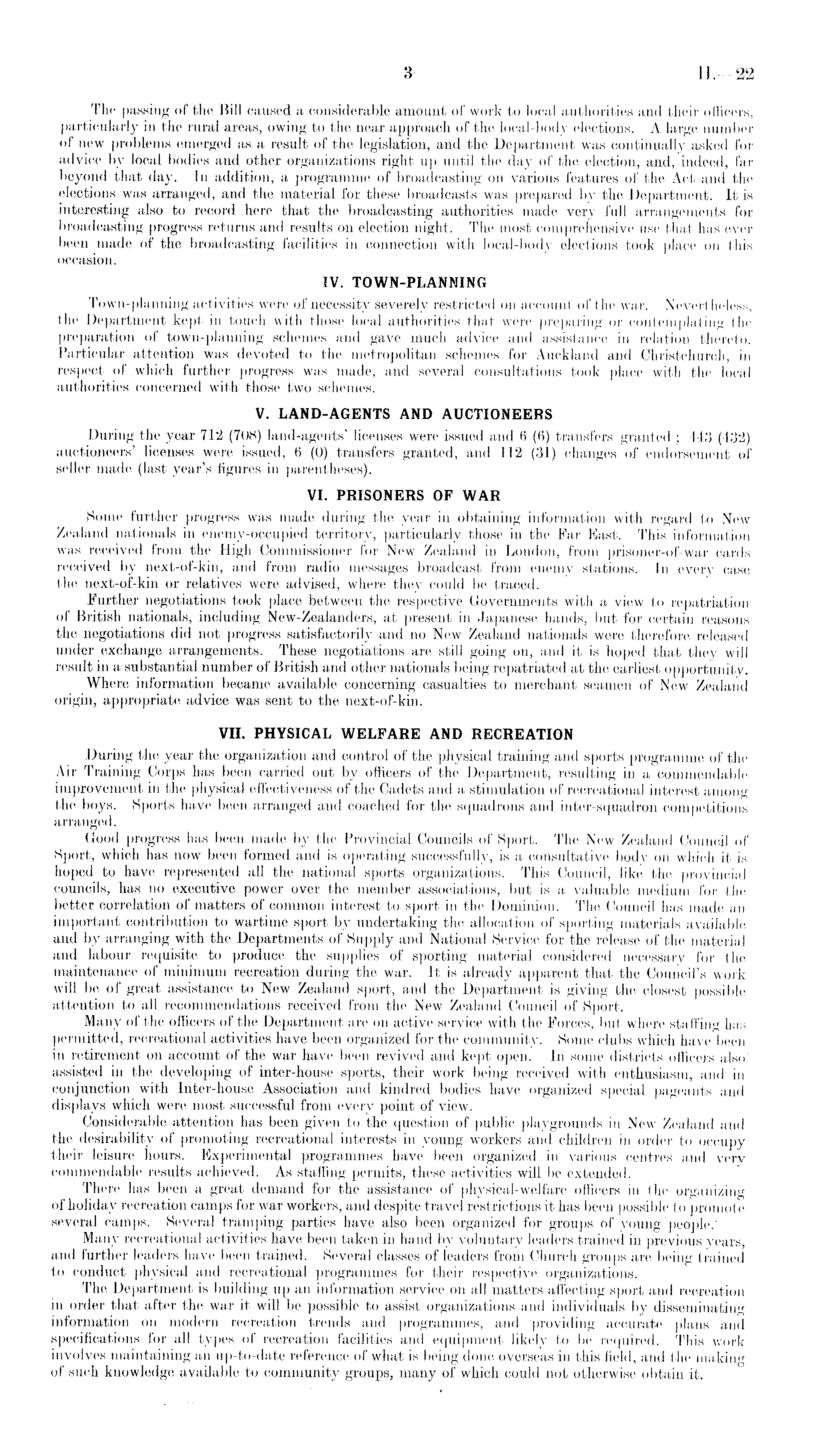 The passing- of the. Bill caused a considerable amount of work to local authorities and their officers, particularly in the rural areas, owing to the near approach of the local-body elections. A large number of new problems emerged as a result of the legislation, and the Department was continually asked for advice by local bodies and other organizations right up until the day of the election, and, indeed, for beyond that day. Tn addition, a programme of broadcasting on various features of the Act and the elections was arranged, and the material for these broadcasts was prepared by the Department. It is interesting also to record here that the broadcasting authorities made very full arrangements for broadcasting progress returns and results on election night. The most comprehensive use that has ever been made of the broadcasting facilities in connection with local-body elections took place on this occasion. IV. TOWN-PLANNING Town-planning activities were of necessity severely restricted on account of the war. Nevertheless, the Department kept in touch with those local authorities that were preparing or contemplating the preparation of town-planning schemes and gave much advice and assistance in relation thereto. Particular attention was devoted to the metropolitan schemes for Auckland and Christchurch, in respect of which further progress was made, and several consultations took place with the local authorities concerned with those two schemes. V. LAND-AGENTS AND AUCTIONEERS During the year 712 (708) land-agents' licenses were issued and 6 (6) transfers granted ; 443 (43'2) auctioneers' licenses were issued, H (0) transfers granted, and 112 (31) changes of endorsement of seller made (last year's figures in parentheses).. VI. PRISONERS OF WAR Some further progress was made during the year in obtaining information with regard to New Zealand nationals in enemy-occupied territory, particularly those in the Far East. This information was received from the High Commissioner for New Zealand in London, from prisoner-of-war cards received by next-of-kin, and from radio messages broadcast from enemy stations. In every case the next-of-kin or relatives were advised, where they could be traced. Further negotiations took place between the respective Governments with a view to repatriation of British nationals, including New-Zealanders, at present in Japanese hands, but for certain reasons the negotiations did not progress satisfactorily and no New Zealand nationals were therefore released under exchange arrangements. These negotiations are still going on, and it is hoped that they will result in a substantial number of British and other nationals being repatriated at the earliest opportunity. Where information became available concerning casualties to merchant seamen of New Zealand origin, appropriate advice was sent to the next-of-kin. VII. PHYSICAL WELFARE AND RECREATION During the year the organization and control of the physical training and sports programme of the Air Training Corps has been carried out by officers of the Department, resulting in a commendable improvement in the physical effectiveness of the Cadets and a stimulation of recreational interest among the boys. Sports have been arranged and coached for the squadrons and inter-squadron competitions arranged. Good progress has been made by the Provincial Councils of Sport. The New Zealand Council of Sport, which has now been formed and is operating successfully, is a consultative body on which it is hoped to have represented all the national sports organizations. This Council, like the provincial councils, has no executive power over the member associations, but is a valuable medium for the better correlation of matters of common interest to sport in the Dominion. The Council has made an important contribution to wartime sport by undertaking the allocation of sporting materials available and by arranging with the Departments of Supply and National Service for the release of the material and labour requisite to produce the supplies of .sporting material considered necessary for the maintenance of minimum recreation during the war. It is already apparent that the Council's work will be of great assistance to New Zealand sport, and the Department is giving the closest possible attention to all recommendations received from the New Zealand Council of Sport. Many of the officers of the Department are on active service with the Forces, but where staffing has permitted, recreational activities have been organized for the community. Some clubs which have been in retirement on account of the war have been revived and kept open. In some districts officers also assisted in the developing of inter-house sports, their work being received with enthusiasm, and in conjunction with Inter-house Association and kindred bodies have organized special pageants and displays which were most successful from every point of view. Considerable attention has been given to the question of public playgrounds in New Zealand and the desirability of promoting recreational interests in young workers and children in order to occupy their leisure hours. Experimental programmes have been organized in various centres and very commendable results achieved. As stalling permits, these activities will be extended. There has been a great demand for the assistance of physical-welfare officers in the organizing of holiday recreation camps for war workers, and despite travel restrictions it has been possible to promote several camps. Several tramping parties have also been organized for groups of young people.' Many recreational activities have been taken in hand by voluntary leaders trained in previous years, and further leaders have been trained. Several classes of leaders from Church groups are being trained to conduct physical and recreational programmes for their respective organizations. The Department is building up an information service on all matters affecting sport and re