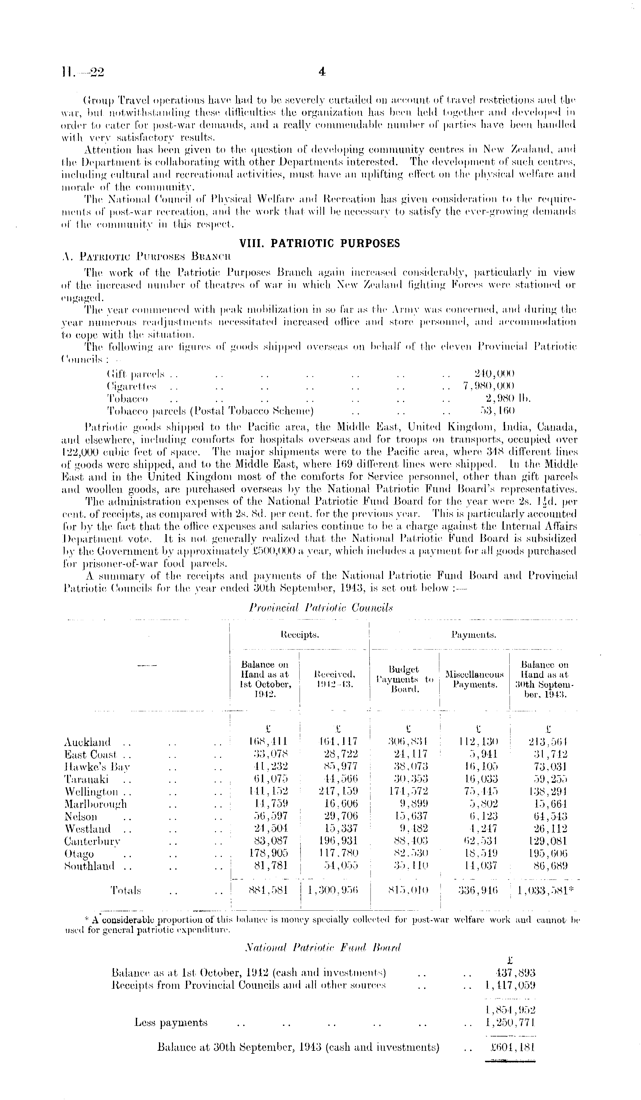 Group Travel operations have had to be severely curtailed on account of travel restrictions and the war, but notwithstanding these difficulties the organization has been held together and developed in order to cater for post-war demands, and a really commendable number of parties have been handled with very satisfactory results. Attention has been given to the question of developing community centres in New Zealand, and the Department is collaborating with other Departments interested. The development of such centres, including cultural and recreational activities, must have an uplifting effect on the physical welfare and morale of the community. The National Council of Physical Welfare and Recreation has given consideration to the requirements of post-war recreation, and the work that will be necessary to satisfy the ever-growing demands of the community in this respect. VIII. PATRIOTIC PURPOSES A. Patriotic Purposes Branch The work of the Patriotic Purposes Branch again increased considerably, particularly in view of the increased number of theatres of war in which New Zealand fighting Forces were stationed or engaged. The year commenced with peak mobilization in so far as the Army was concerned, and during the year numerous readjustments necessitated increased office and store personnel, and accommodation to cope with the situation. The following are figures of goods shipped overseas on behalf of the eleven Provincial Patriotic Councils :— Gift parcels .. .. .. .. .. .. .. 240,000 Cigarettes .. .. .. .. .. .. .. 7,980,000 Tobacco .. .. .. .. .. .. .. 2,980 Ib. Tobacco parcels (Postal Tobacco Scheme) .. .. .. 53,160 Patriotic goods shipped to the Pacific area, the Middle East, United Kingdom, India, Canada, and elsewhere, including comforts for hospitals overseas and for troops on transports, occupied over 122,000 cubic feet of space. The major shipments were to the Pacific area, where 348 different lines of goods were shipped, and to the Middle East, where 169 different lines were shipped. In the Middle East and in the United Kingdom most of the comforts for Service personnel, other than gift parcels and woollen goods, arc purchased overseas by the National Patriotic Fund Board's representatives. The administration expenses of the National Patriotic Fund Board for the year were 2s. lid. per cent, of receipts, as compared with 2s. Bd. per cent, for the previous year. This is particularly accounted for by the fact that the office expenses and salaries continue to be a charge against the Internal Affairs Department vote. It is not generally realized that the National Patriotic Fund Board is subsidized by the Government by approximately £500,000 a year, which includes a payment for all goods purchased for prisoner-of-war food parcels. A summary of the receipts and payments of the National Patriotic Fund Board and Provincial Patriotic Councils for the year ended 30th September, 1943, is set out below : —