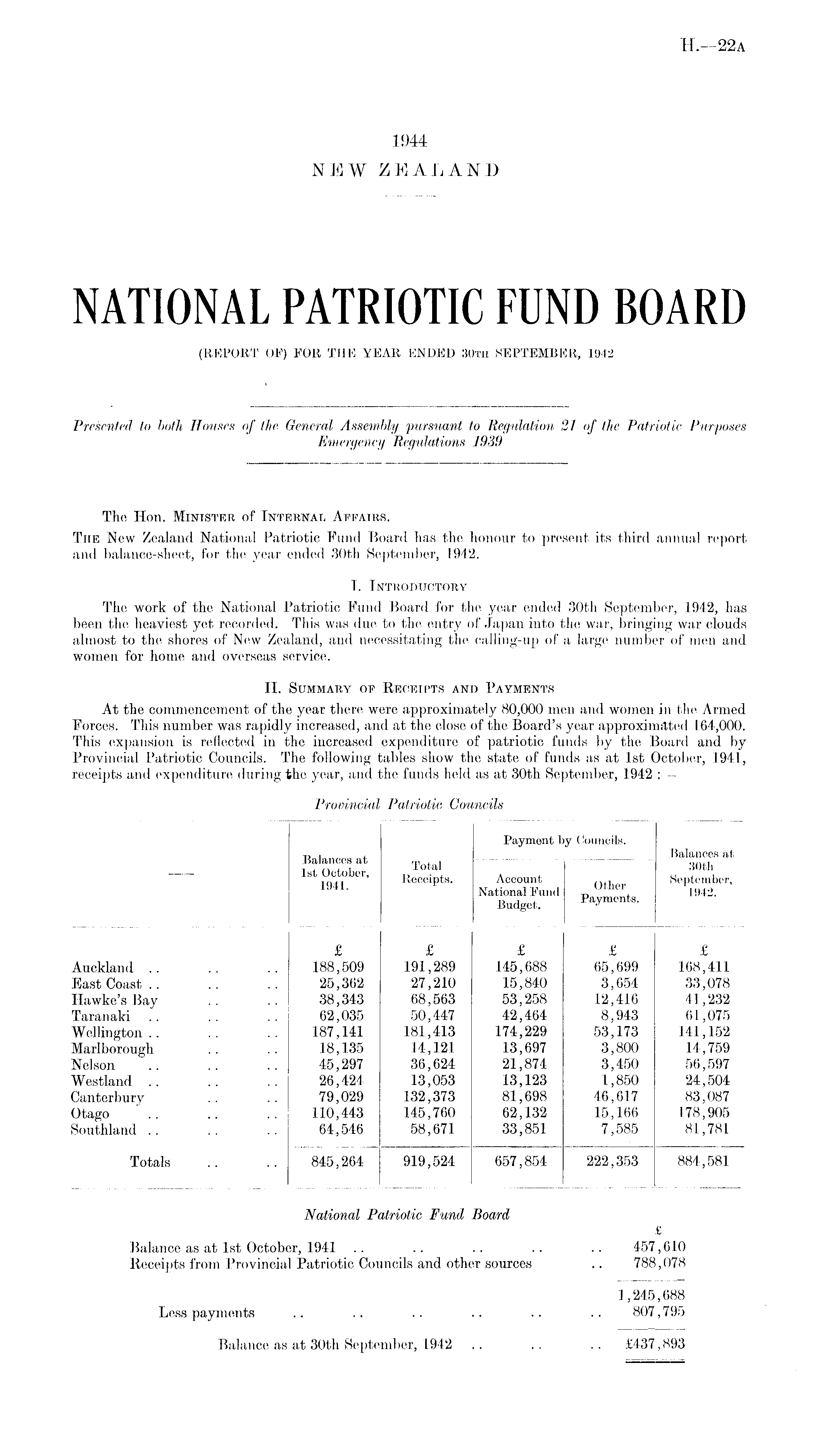 The Hon. Minister of Internal Affairs. The New Zealand National Patriotic Fund Board has the honour to present its third annual report and balance-sheet, for the year ended 30th September, 1942. I. Introductory The work of the National Patriotic Fund Board for the year ended 30th September, 194-2, has been the heaviest yet recorded. This was due to the entry of Japan into the war, bringing war clouds almost to the shores of New Zealand, and necessitating the calling-up of a large number of men and women for home and overseas service. 11. Summary op Receipts and Payments At the commencement of the year there were approximately 80,000 men and women in the Armed Forces. This number was rapidly increased, and at the close of the Board's year approximated 164,000. This expansion is reflected in the increased expenditure of patriotic funds by the Board and by Provincial Patriotic Councils. The following tables show the state of funds as at Ist October, 1941, receipts and expenditure during the year, and the funds held as at 30th September, 1942 : —